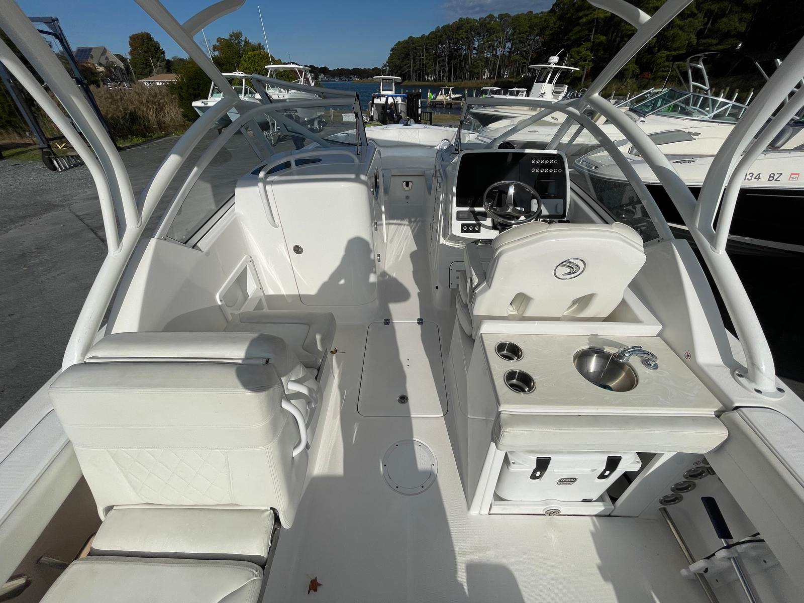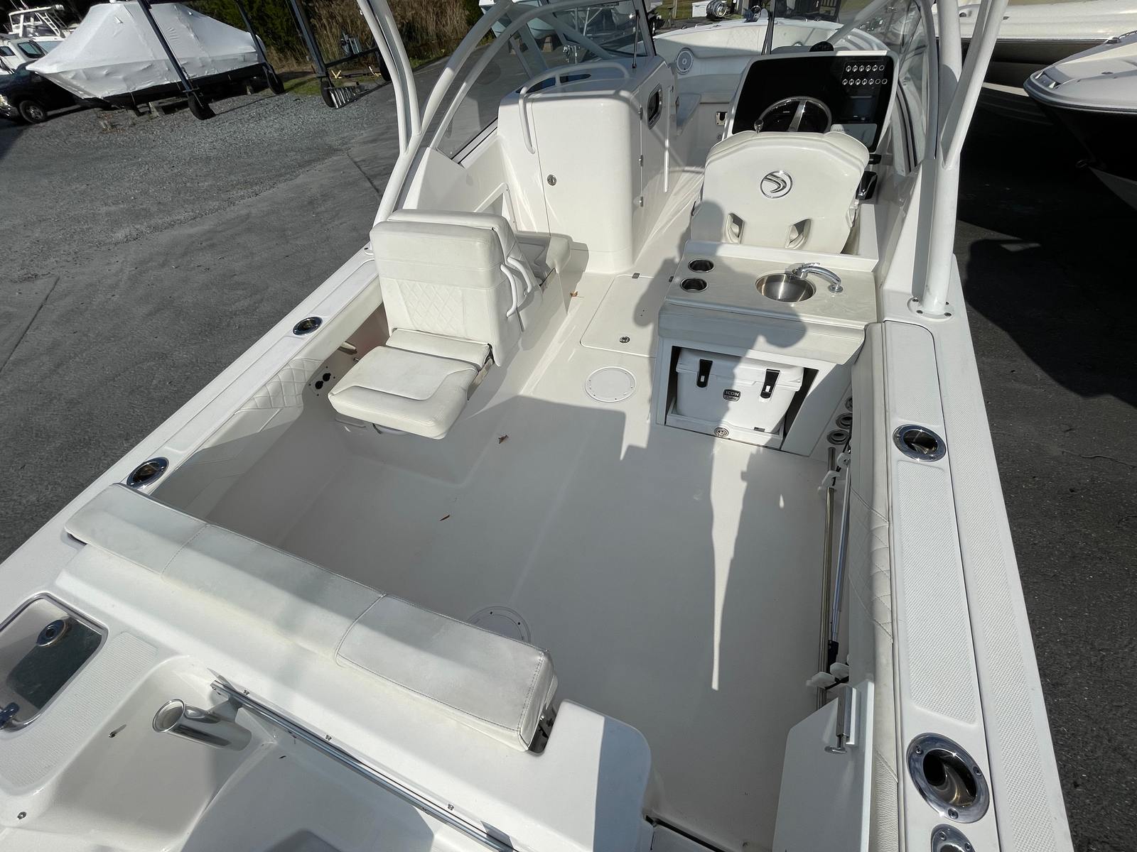 The Edgewater 248 CX is packed with features that enhance both functionality and enjoyment on the water. Its dual console layout offers exceptional versatility, providing comfortable seating and protection from the elements for both captain and passengers. The spacious cockpit and bow seating areas are perfect for socializing, sunbathing, or enjoying a picnic on the water. The thoughtful design ensures that every inch of the boat is utilized for maximum comfort and convenience.This dual console boat for sale is built with Edgewater’s signature attention to detail, featuring high-quality materials and craftsmanship throughout. The ergonomic helm station provides excellent visibility and easy access to controls, making navigation a breeze. Storage compartments are strategically placed to keep gear organized and out of the way, while still being easily accessible when needed.