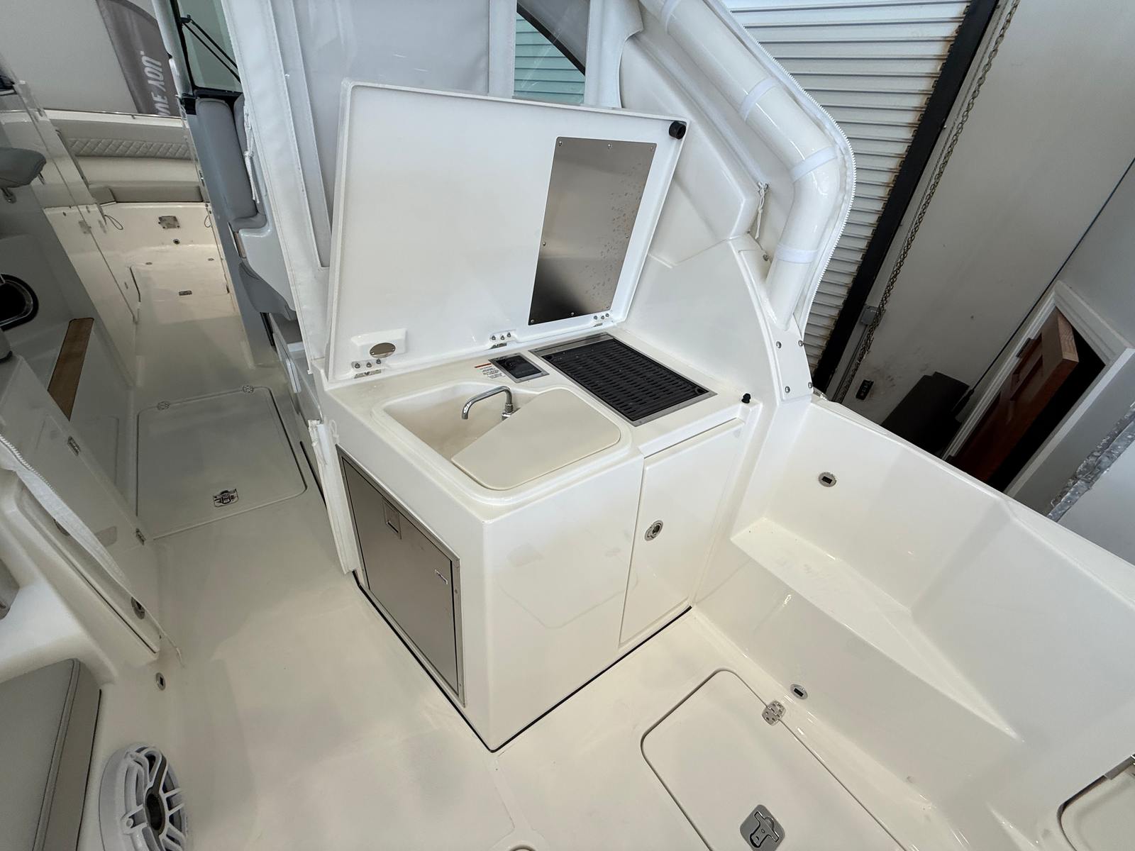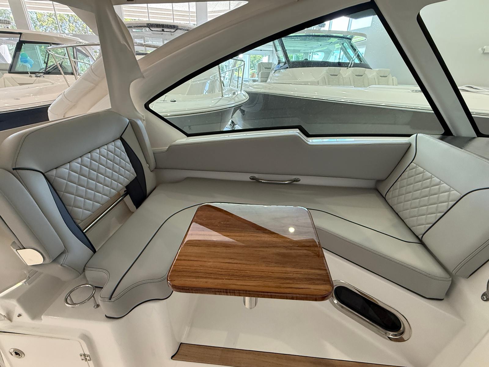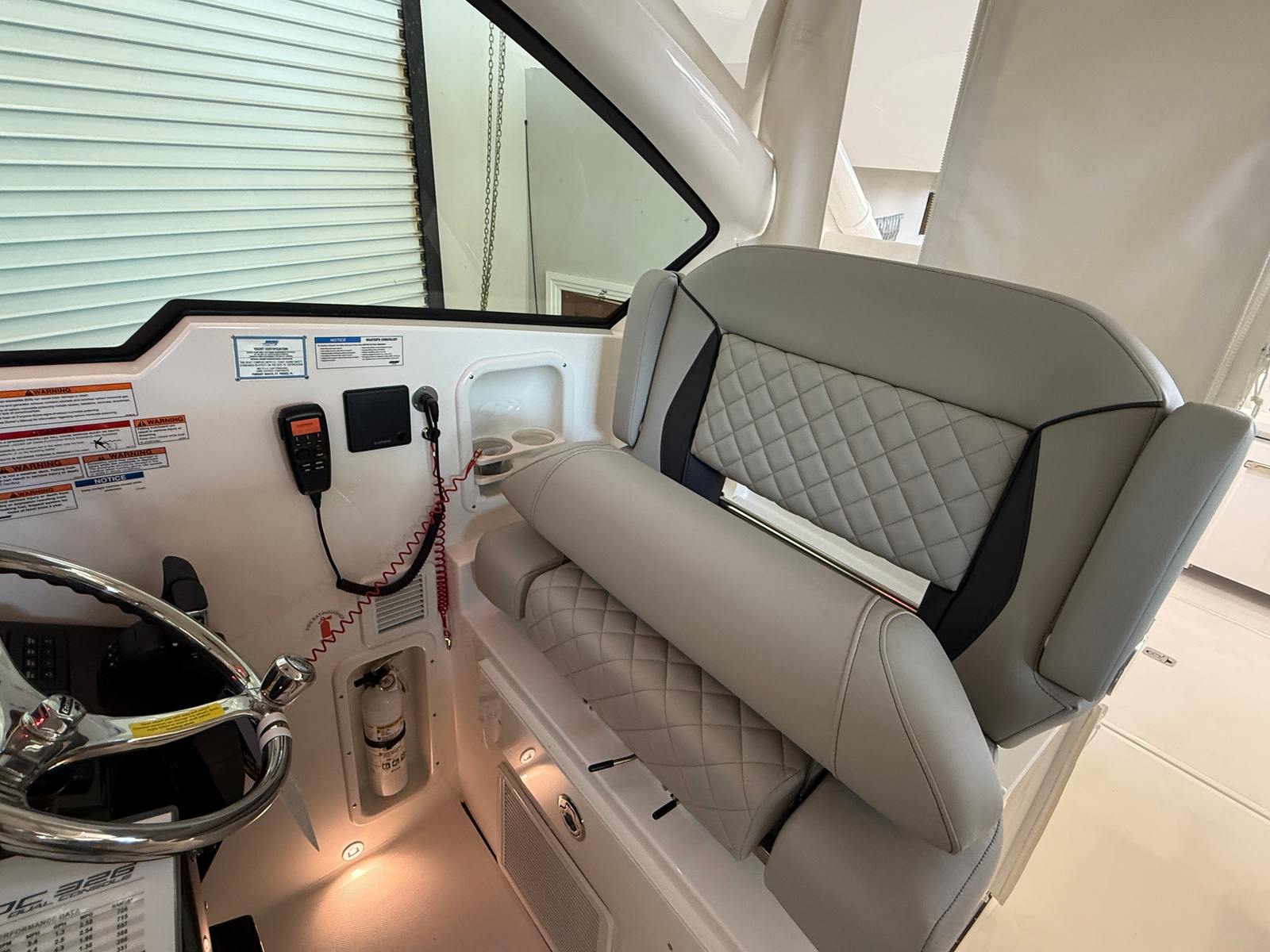 The Pursuit DC 326 is loaded with special features designed to enhance your boating experience. The twin Yamaha F350XSA2 engines provide robust performance, while the joystick control ensures effortless navigation and docking. The hull’s fresh white color, complemented by a black boot stripe with black accent, creates a timeless and elegant appearance. Inside, the helm and footrest feature a sleek carbon color, and the interior is finished in Tranquil Sea, offering a serene and inviting atmosphere.For added convenience and comfort, the DC 326 is equipped with a 110V/60HZ 5.0KW genset, providing reliable power for all your onboard systems. The 110V/60HZ cabin and bridgedeck air conditioning package ensures a cool and comfortable environment, even on the hottest days. Entertaining is a breeze with the 110V cockpit grill, perfect for preparing delicious meals while enjoying the water. The helm control hardtop-mounted LED spotlight enhances visibility and safety during nighttime excursions, giving you peace of mind wherever your adventures take you.