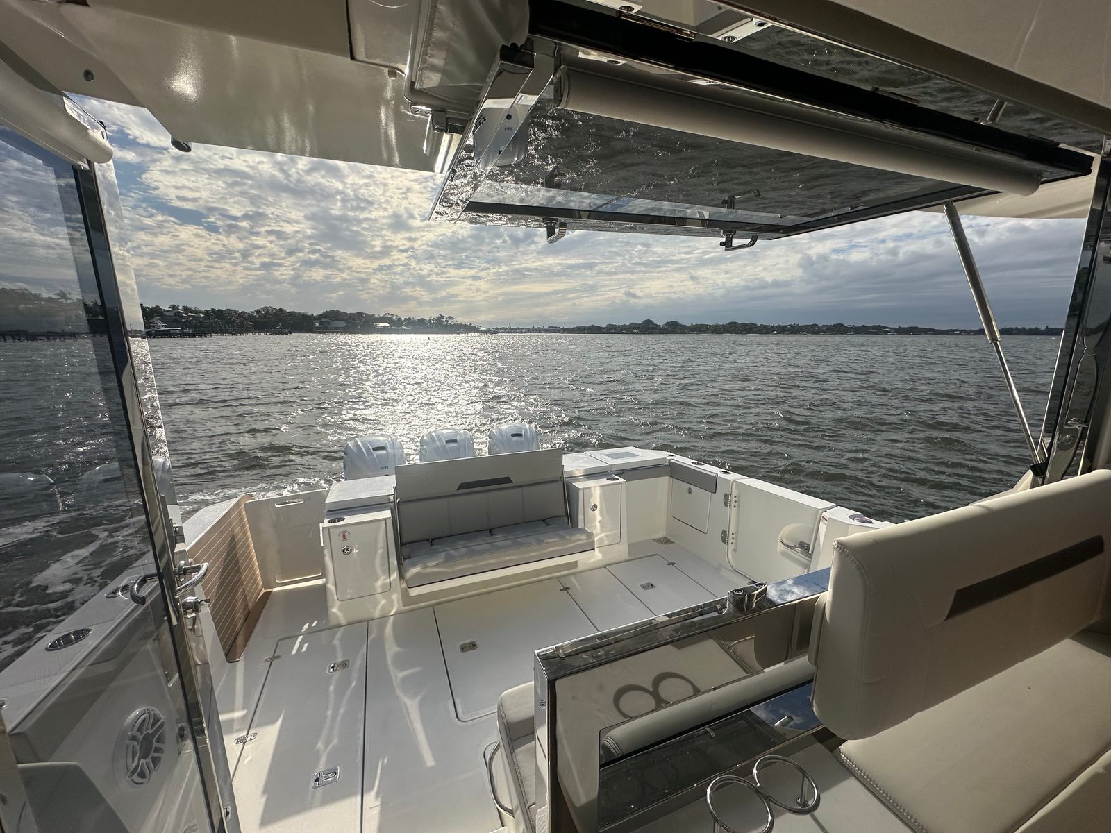 The Pursuit OS 445 is designed with practicality in mind, offering features that simplify ownership and enhance enjoyment. The electric retractable cockpit sun shade and forward sunshade provide quick, effortless protection from the sun, allowing you to adapt to changing weather conditions with ease. The hardtop-mounted LED spotlight and Garmin camera system improve safety during docking and nighttime operations, while the SiriusXM weather receiver keeps you prepared for whatever nature has in store.Storage solutions, such as the bolt-on hardtop rod holders, help keep the deck organized and clutter-free, making it easier to transition between cruising, fishing, and entertaining. The triple Yamaha engines not only deliver impressive performance but also contribute to efficient fuel management, allowing for longer journeys with fewer stops.