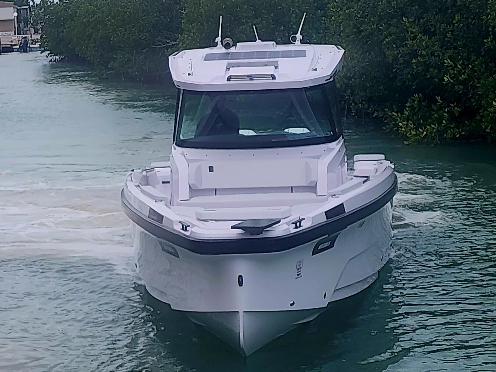 The Axopar 29 CCX is packed with premium features and thoughtful details that set it apart from other center console boats for sale. Onboard fittings include multicabin openable portlights, allowing for excellent ventilation and natural light throughout the interior spaces. The navigation experience is elevated with the twin chart plotter Simrad NSX 12″ option, providing advanced navigation capabilities and intuitive controls for safe and efficient journeys.For those who appreciate style and exclusivity, the BRABUS line trim package - CCX adds a touch of luxury and distinctive flair, while the black rub rail enhances both aesthetics and protection. The fore deck setup is designed for ultimate comfort and versatility, featuring a front U-sofa package in a sophisticated chalk color, a bow table, and a bow U-sofa, creating an inviting space for socializing, dining, or simply soaking up the sun.Optional equipment such as underwater lights add a dramatic effect for evening cruises, while the wash down pump ensures easy cleaning and maintenance after a day of fun on the water. The Axopar 29 US version is tailored for the needs of American boaters, ensuring compatibility and convenience for a wide range of uses.