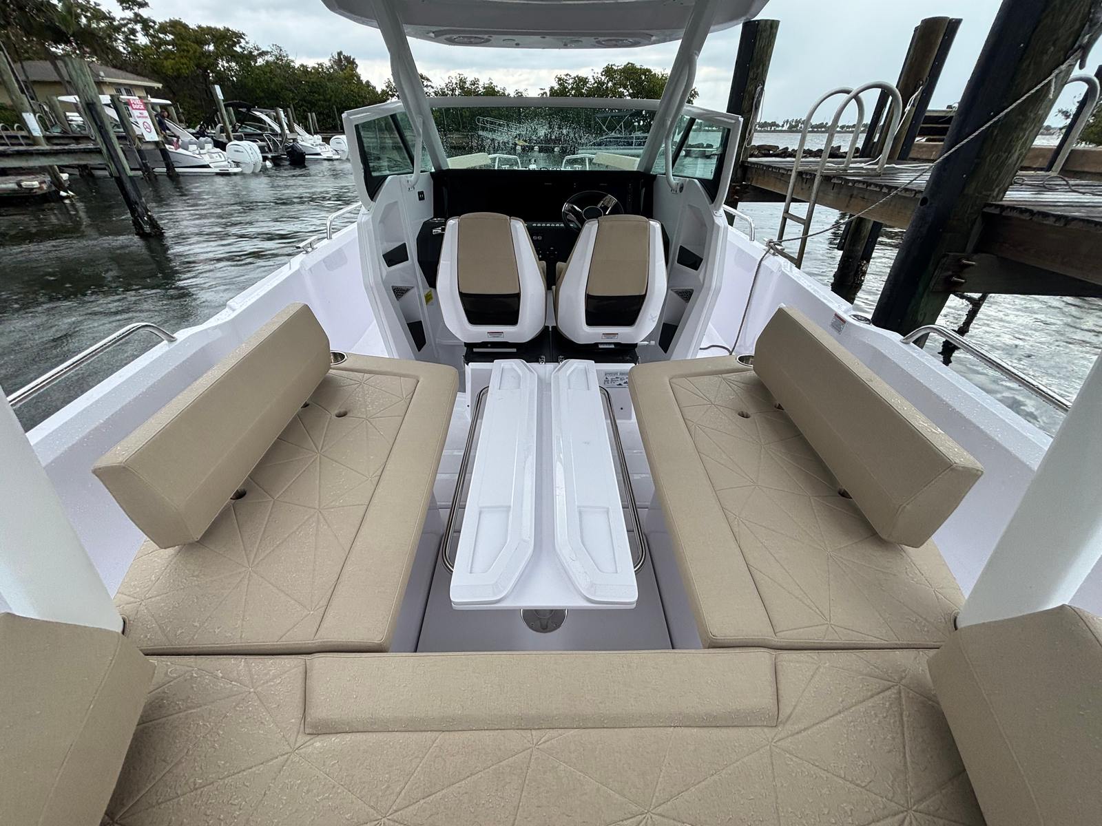 Beyond its luxurious features, the Axopar 29 Sun Top excels in practicality and convenience. The generous storage options allow you to stow gear, supplies, and personal items securely, keeping the deck clutter-free and organized. The Center Console design offers excellent visibility and ease of docking, making it simple to maneuver in tight spaces or busy marinas. The EPA-compliant fuel system ensures efficient operation, helping you make the most of your time on the water while minimizing environmental impact.The shore power system with a 35Ah charger provides reliable energy for your onboard electronics, so you can stay connected, power up devices, and enjoy modern conveniences throughout your journey. The boat’s layout is designed for easy movement, allowing passengers to transition seamlessly between lounging, dining, and exploring. Whether you’re planning a day trip or an extended adventure, the Axopar 29 Sun Top is equipped to handle your needs with style and efficiency.