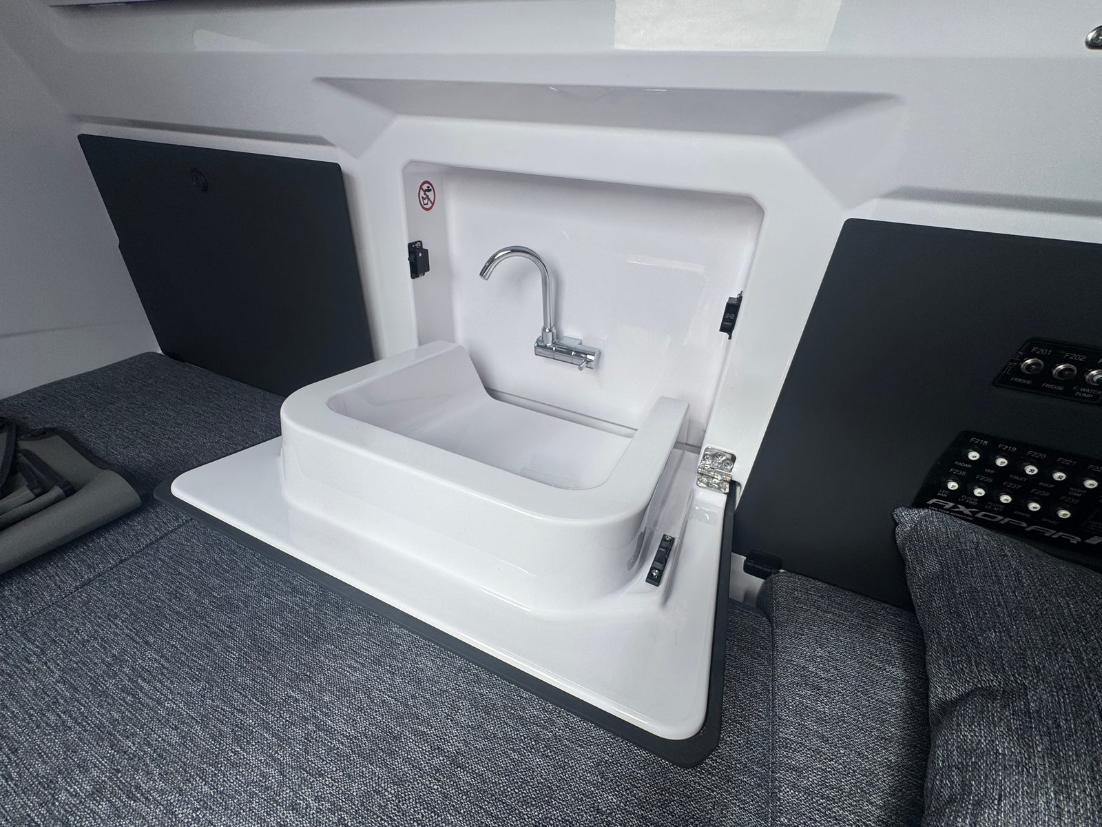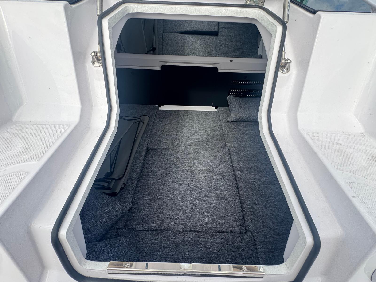 This Axopar boat for sale is packed with optional equipment and premium features that elevate your time on the water. The trim tabs provide enhanced stability and control, allowing you to fine-tune your ride for maximum comfort. The wet bar in the fender box is perfect for entertaining guests, offering a convenient spot to prepare drinks and snacks while enjoying the scenery. For effortless anchoring, the bow windlass with anchor (US version) ensures quick and secure mooring, while the mooring package adds extra convenience for docking and storage.Protective window covers in a stylish grey finish shield the cabin from the sun and elements, preserving the boat’s pristine condition. Underwater lights create a captivating ambiance for evening cruises, illuminating the water and attracting marine life for a truly magical experience. The bow thruster enhances maneuverability, making docking and tight turns a breeze even in challenging conditions. As an EU/US version, the Axopar 29 XC Cross Cabin is tailored for American waters, ensuring compatibility and compliance with local standards.