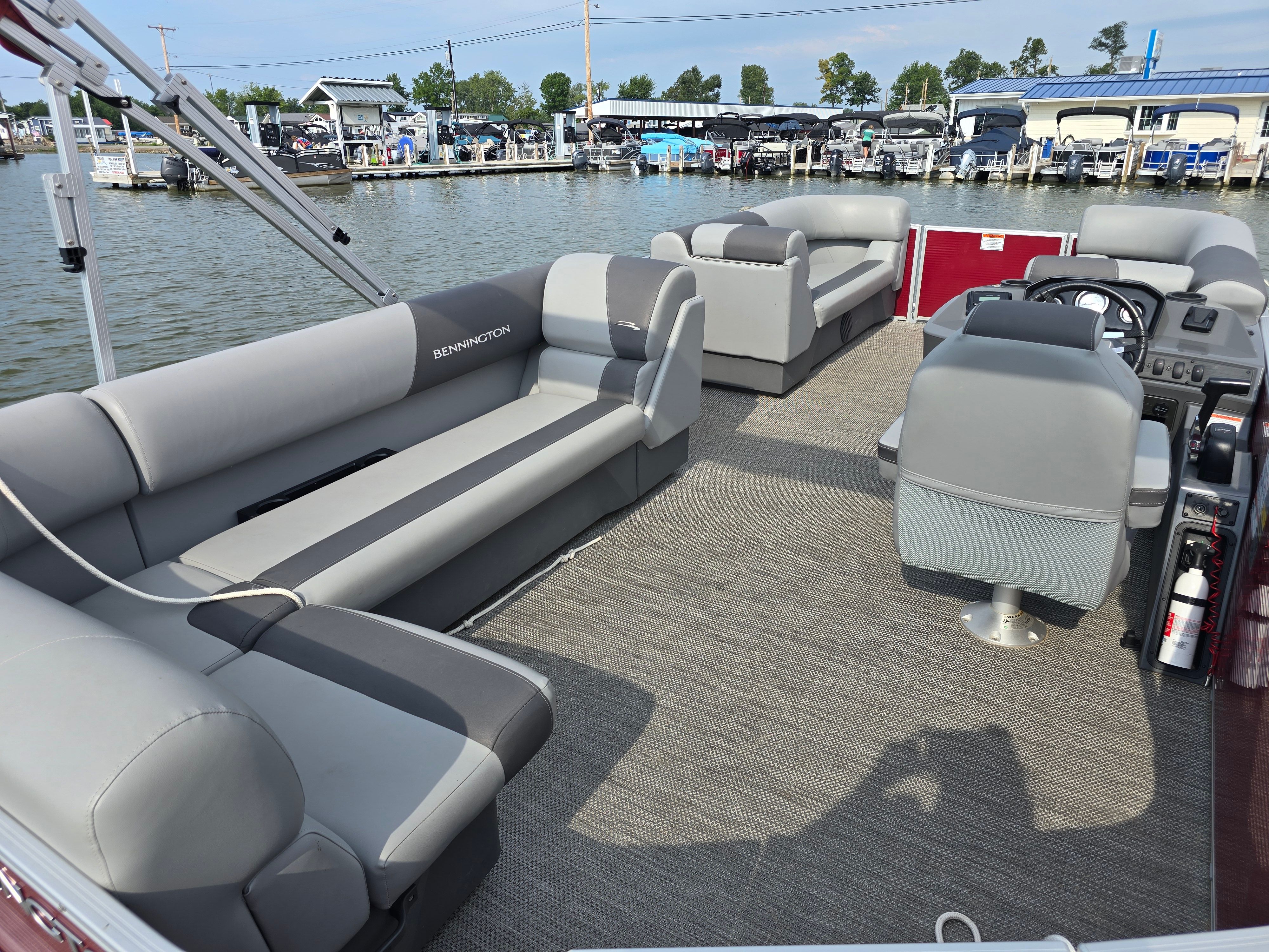 This Bennington pontoon boat is packed with features designed to maximize comfort, style, and functionality. The Shadow Grey and Anthracite color scheme, paired with the bold Rossa Red canvas and panel, creates a visually stunning appearance that stands out in any marina. The Base Furniture with Simtex Upholstery offers plush seating and durability, ensuring you and your guests can relax in style. The Dimensional Brushed Logo adds a premium touch, while the Extended Aft Deck STD Trim S SPS provides additional space for lounging, swimming, or preparing for water sports. The Ski Tow Black EAD S makes it easy to enjoy tubing, wakeboarding, or skiing, adding an extra layer of excitement to your boating experience.