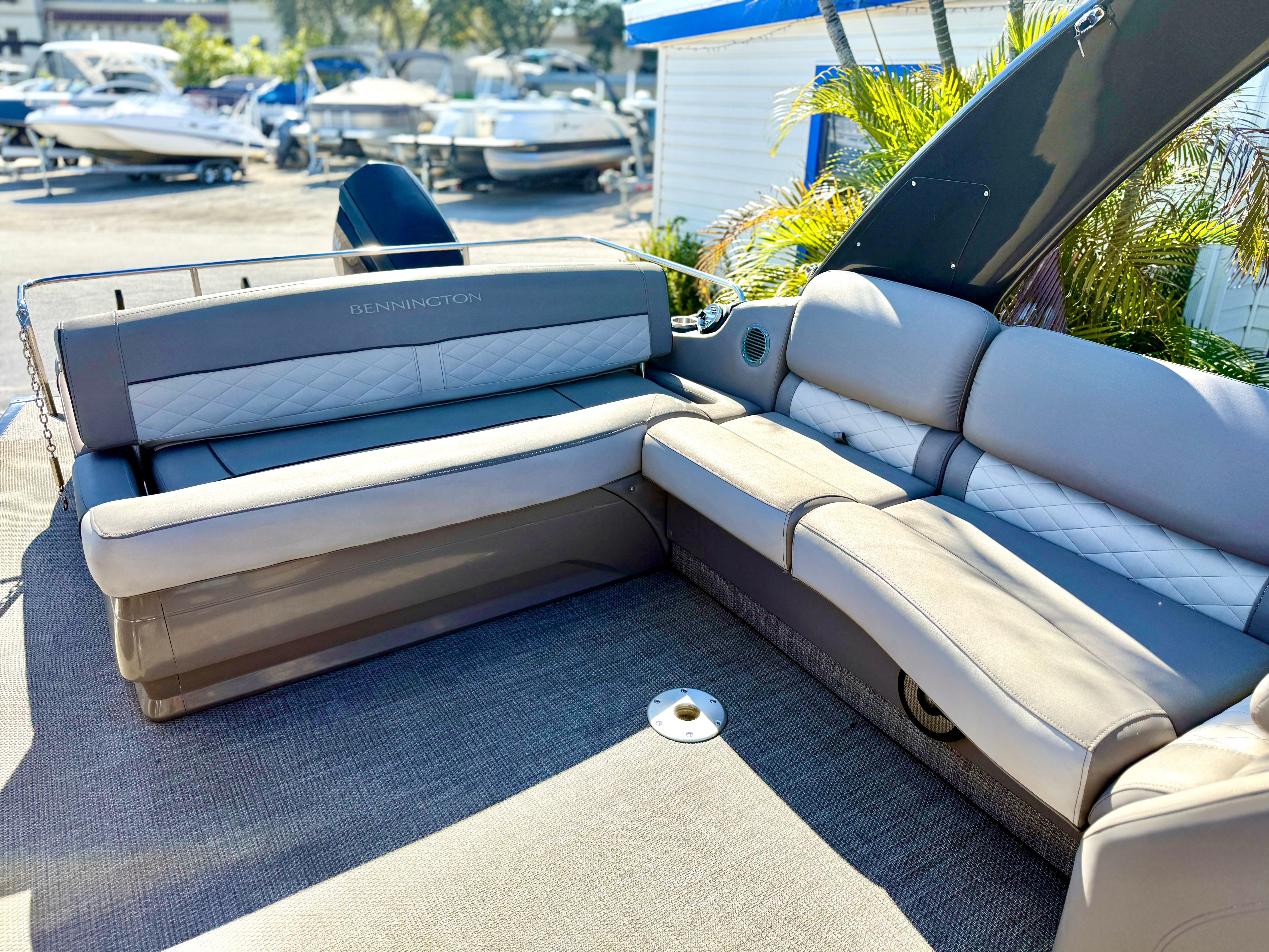 Beyond its recreational appeal, the Bennington 28 RSB pontoon boat for sale offers a range of practical benefits. The spacious deck provides ample storage for gear, water toys, and personal items, keeping the area clutter-free and organized. The pontoon’s design makes docking and maneuvering straightforward, even for those new to boating. Fuel efficiency is enhanced by the modern engine setup, allowing you to spend more time on the water and less time at the pump.The durable construction and quality materials ensure this Bennington boat for sale is built to last, providing peace of mind for years to come. Maintenance is simplified thanks to the thoughtful engineering, making ownership as enjoyable as the time you spend on the water. Whether you’re planning day trips, weekend getaways, or extended cruises, the Bennington 28 RSB is equipped to handle it all with ease.