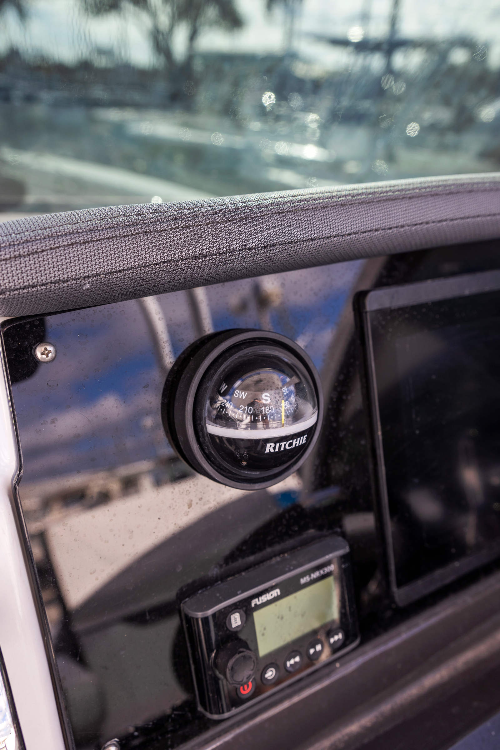 Lockable port-side glove box and recessed stainless grab rails