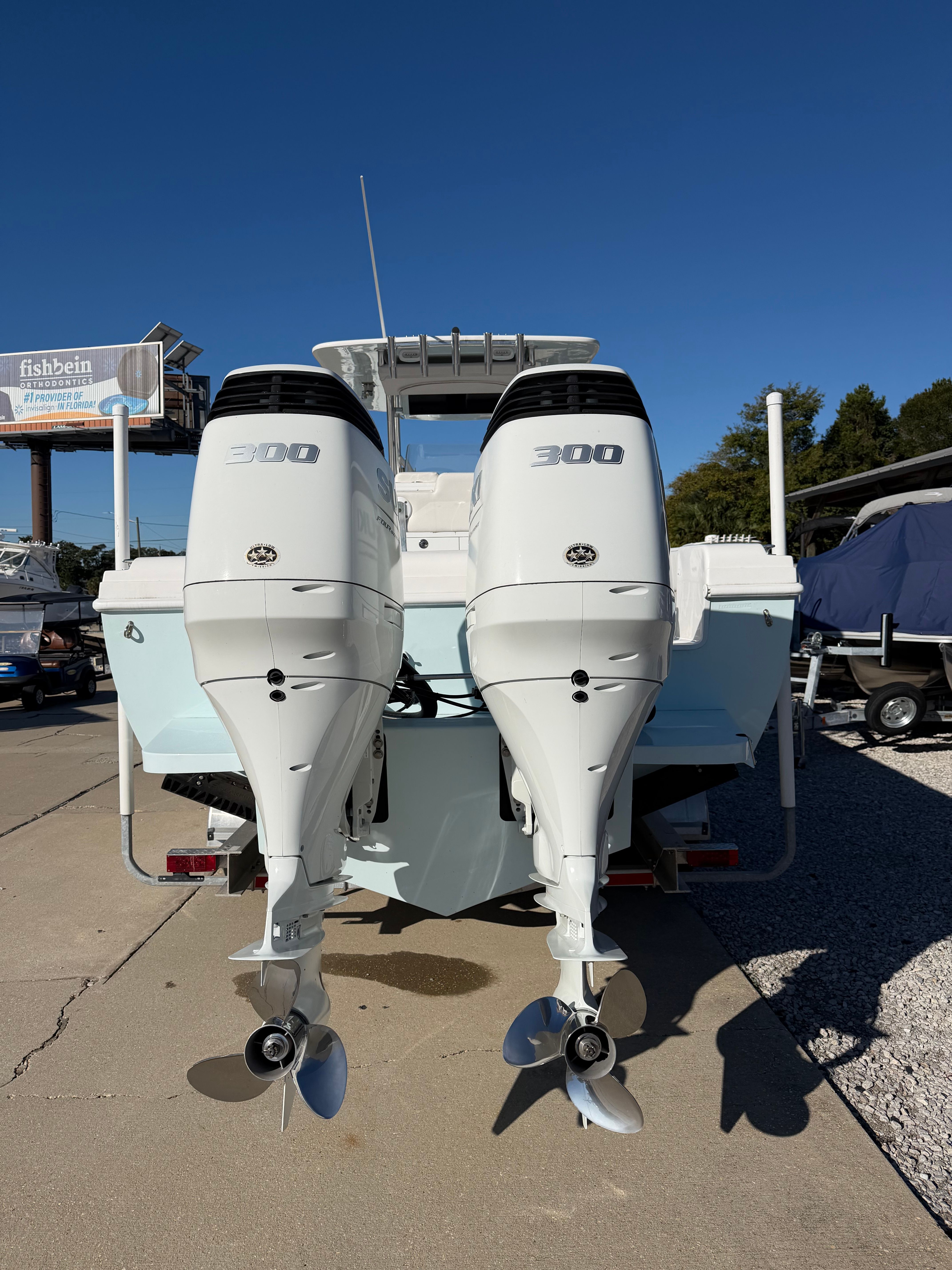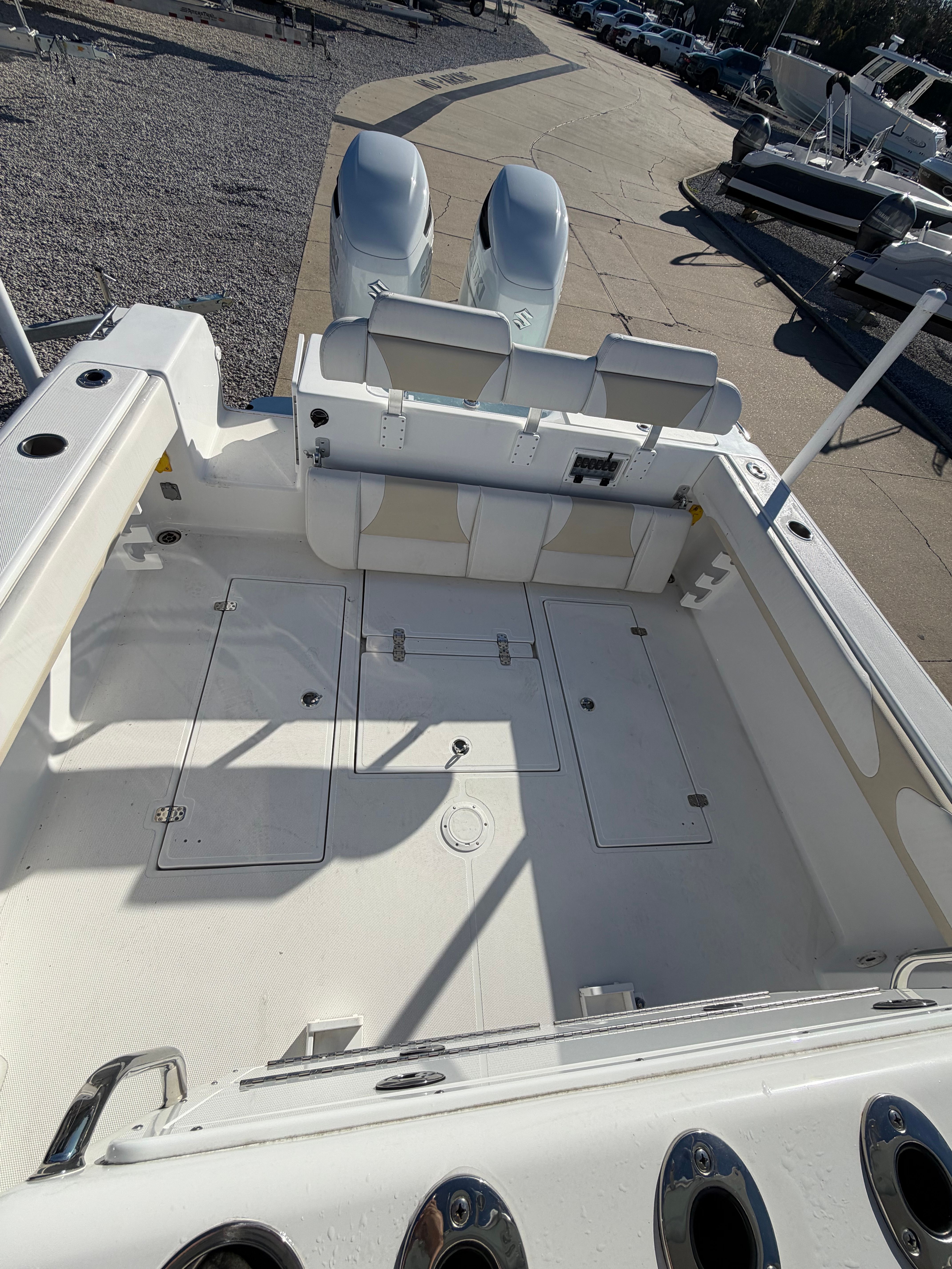 The boat has been properly cared for since new, never chartered, and gently enjoyed. It remains in excellent condition and shows like a near-new boat. Power comes from twin Suzuki 300 that’s still under factory warranty through February 2032, giving the next owner years of confidence and coverage.