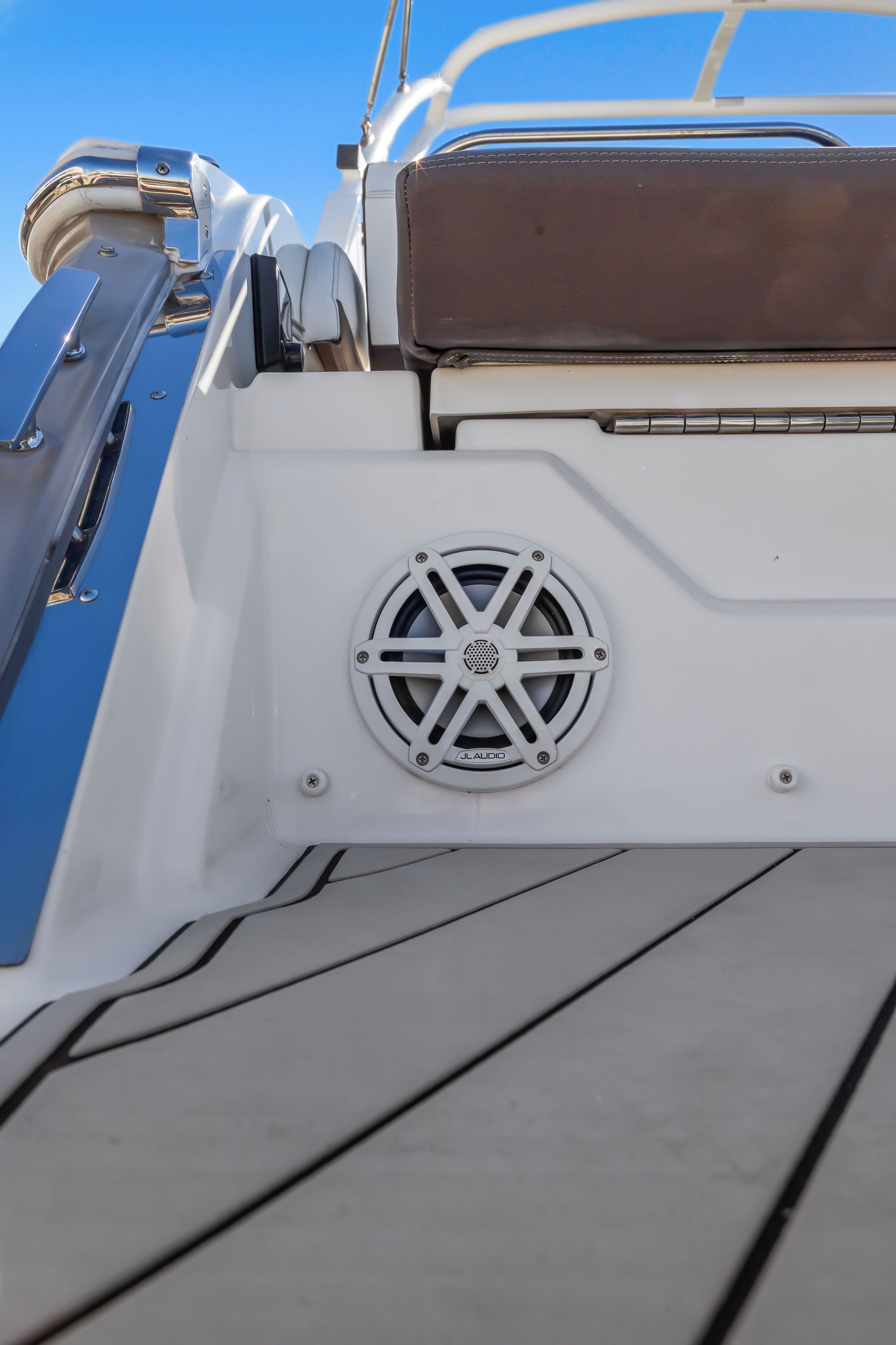 Well-equipped for entertaining and cruising, this boat features dual in-dash Garmin multifunction displays, JL Audio sound system, electric windlass anchor, trim tabs, and an aluminum arch with integrated Bimini top for added comfort and shade. Cobalt’s signature interior layout includes plush wraparound seating, a convertible aft sunpad, and a spacious, enclosed head compartment, all finished with top-tier materials and stitching.