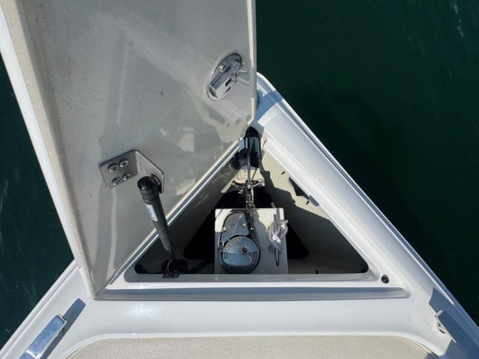 This stunning boat has a Navy hull side, Frost Grey bottom, and White boot stripe, complemented by a stylish Tahoe Grey interior with Navy piping for a sleek, refined look. A white forward-folding arch with a Navy bimini adds style and shade, while brushed aluminum wakeboard racks and tow balls on both port and starboard sides ensure you're ready for any watersports adventure.
