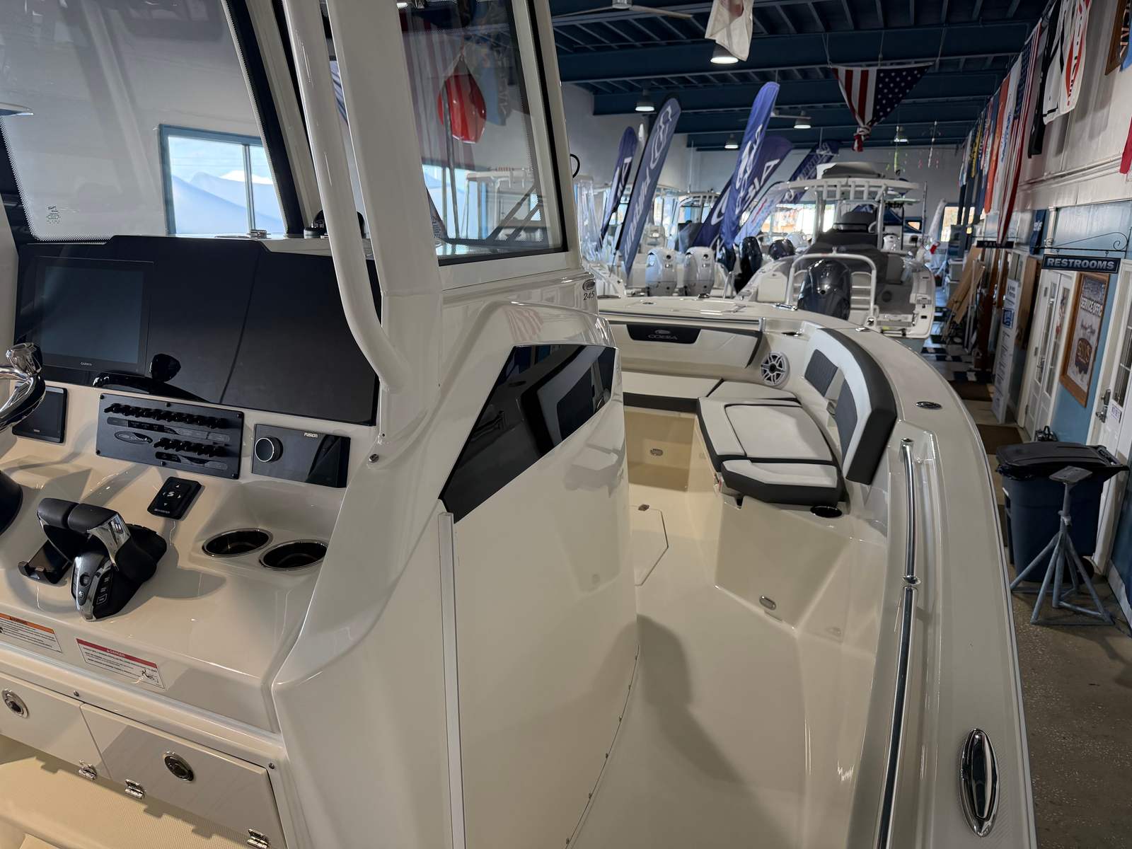 The 2026 Cobia 245 CC is a 24.5-foot center console boat that exemplifies modern craftsmanship and thoughtful engineering. Its sleek Whisper Gray hull color and two-tone Platinum & White cushions create a sophisticated and inviting atmosphere, making it a head-turner at any marina or dock. As a new model, this boat offers the latest advancements in marine technology and comfort, ensuring you enjoy every moment on the water. The spacious layout provides ample room for fishing, relaxing, or entertaining, making it a versatile option for boaters of all interests.