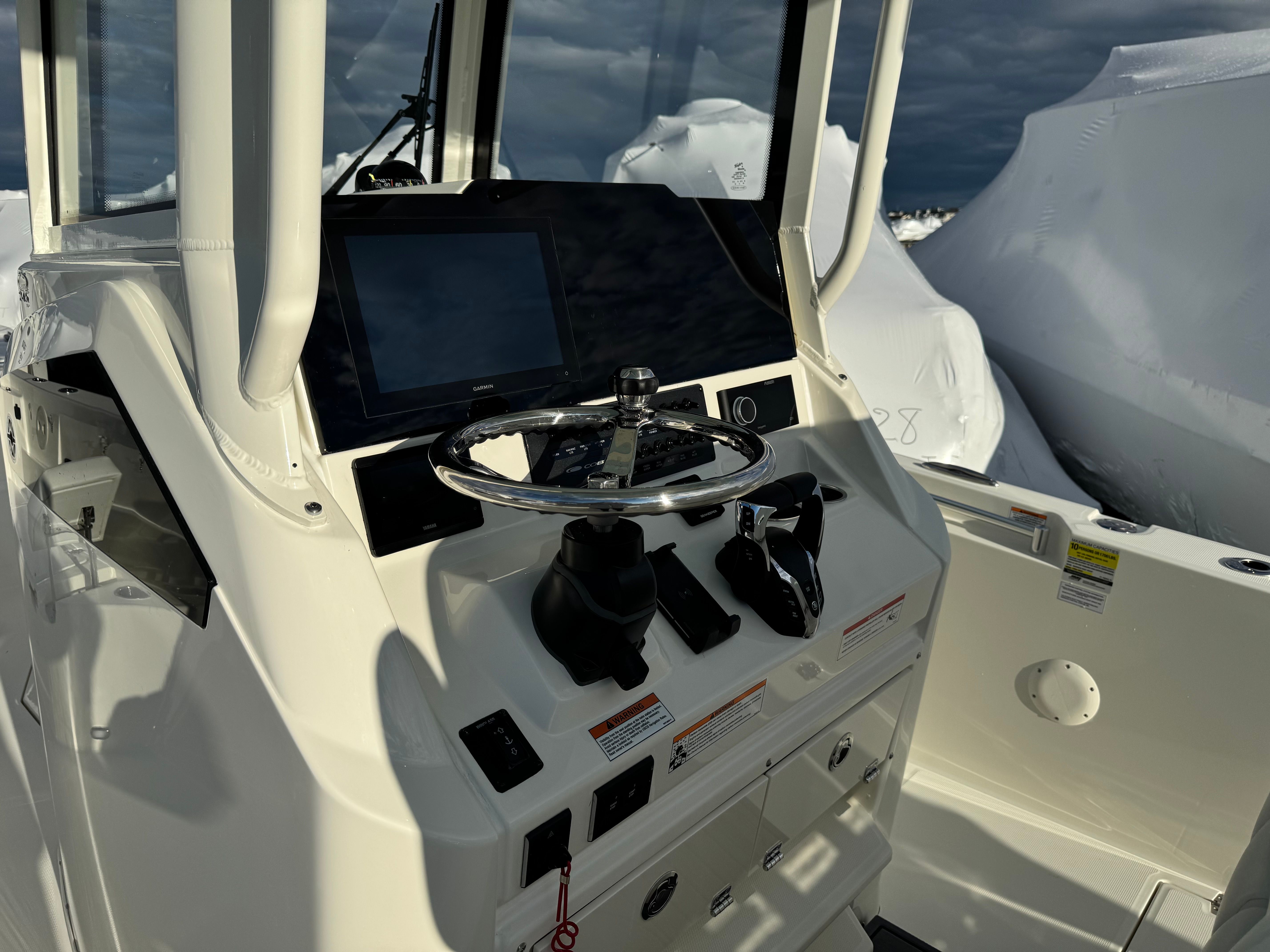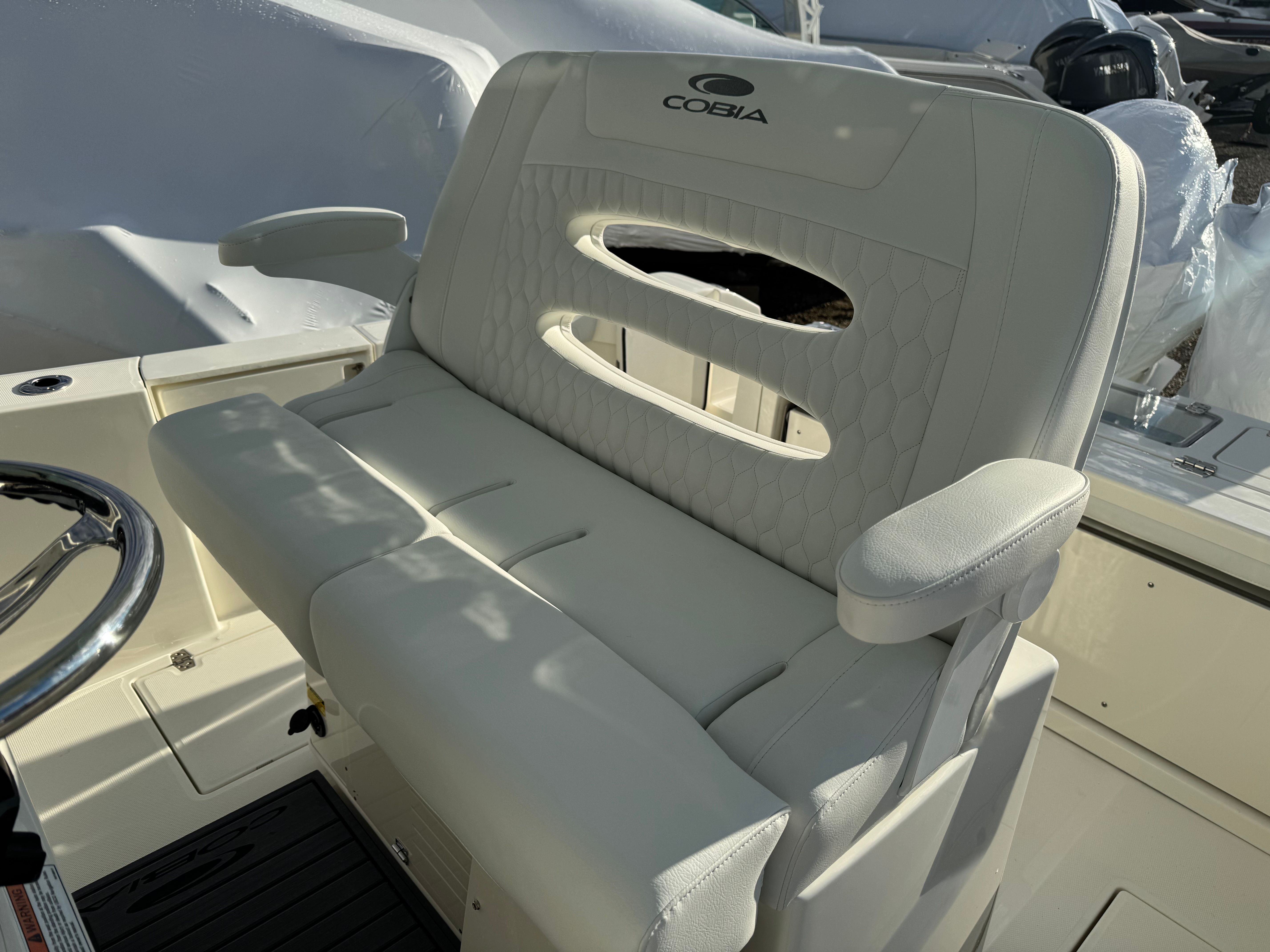 At the heart of the Cobia 245 CC’s exhilarating performance are twin Yamaha 150XSA2 engines, finished in a striking white. Together, these engines deliver a combined 300 horsepower, providing the thrust and agility needed for a wide range of activities, from high-speed runs to leisurely cruises. The inclusion of the Helm Master EX DES twin engine system with ISO charger ensures precise control and seamless maneuverability, making docking and navigation effortless. Digital electric steering offers a smooth, responsive feel at the helm, while the upgraded Edson steering wheel with a stainless power knob adds a touch of luxury and ergonomic comfort. Whether you are chasing the horizon or navigating tight marinas, the Cobia 245 CC’s performance package is designed to inspire confidence and excitement.