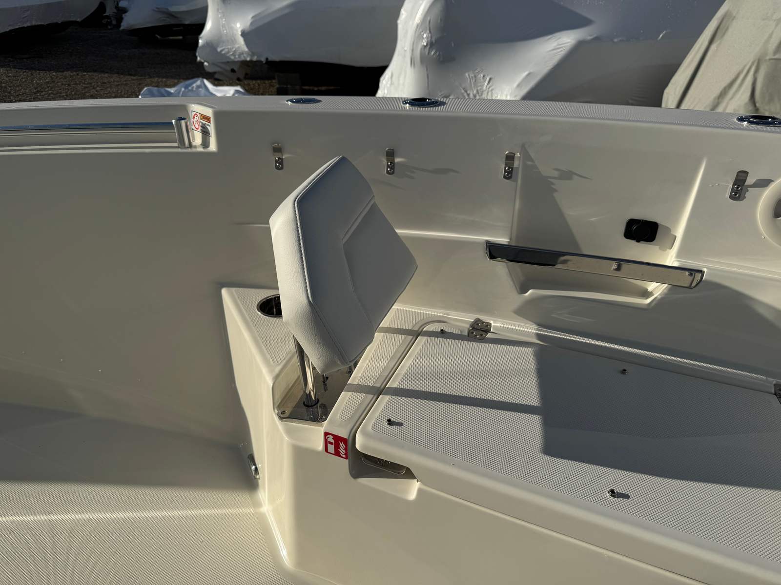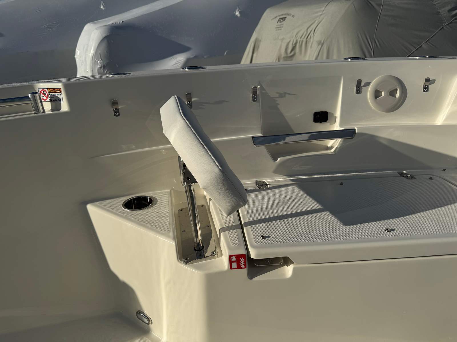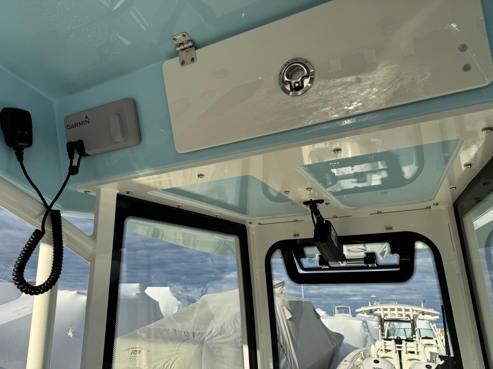 This center console boat is loaded with premium features that elevate both functionality and comfort. The Seakeeper Ride trim tabs and indicators provide superior stability and control, allowing you to fine-tune your ride for optimal performance in varying conditions. The hardtop with an integrated frame and glass windshield offers excellent protection from the elements, while the white powder coating adds durability and a modern aesthetic. The helm seat comes standard with a tackle station, making it easy to organize your gear and stay ready for action. Plush white cushions throughout the boat create a clean, inviting atmosphere, perfect for relaxing after a day of excitement. The electric head with a macerator and port window ensures convenience and privacy, enhancing the overall comfort for you and your guests.