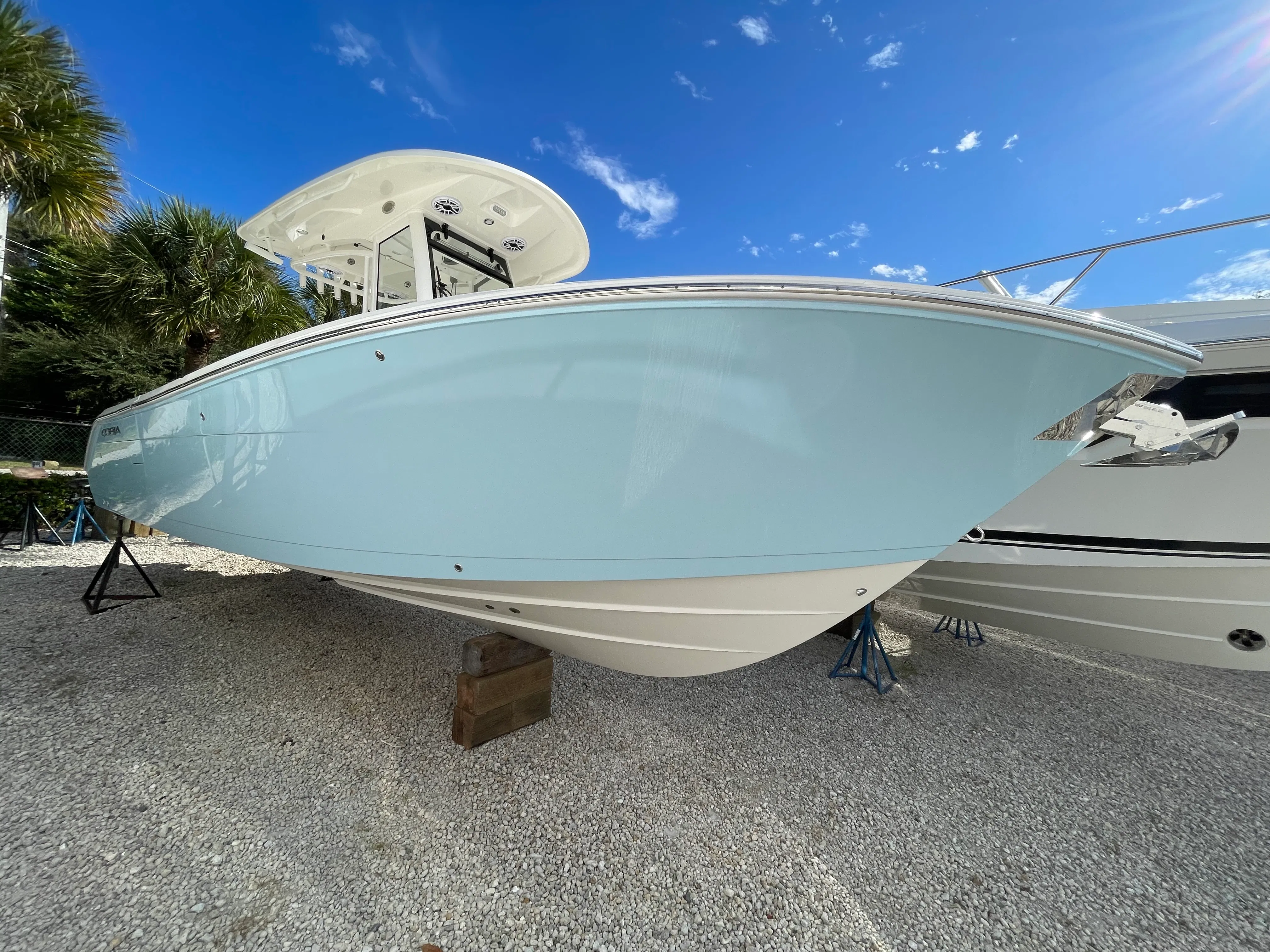 The 2026 Cobia 265 CC is a brand-new Center Console model that measures just over 26 feet in length, offering ample space for both relaxation and adventure. This boat is designed for those who demand quality, comfort, and performance in one sophisticated package. The 265 CC’s Atlantic Blue hull with a 2-tone standard pattern immediately catches the eye, while the white cushion package and faux teak decking kit in grey and black add a touch of luxury and modern flair. Every detail of this Cobia boat for sale has been thoughtfully crafted to provide a premium boating experience.