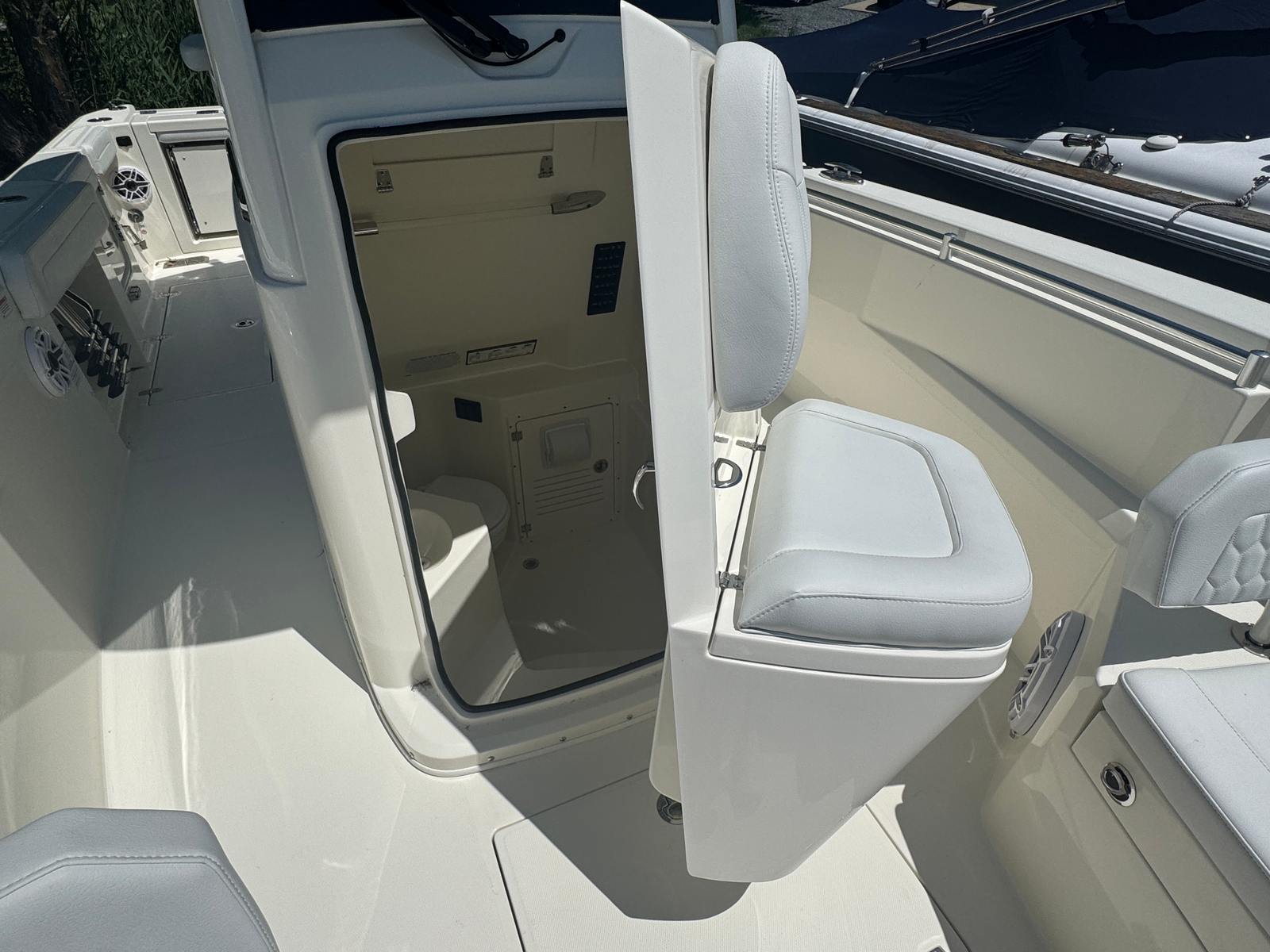 This Center Console boat for sale is perfect for a wide range of activities. Families will love the spacious deck and comfortable seating, making it easy to enjoy picnics, swimming, and sightseeing. Anglers will appreciate the dedicated rod racks, ample deck space, and advanced anchoring system, which make fishing trips more productive and enjoyable.For those seeking luxury getaways, the stylish Bayside Blue hull, premium audio system, and plush bow cushions create an inviting environment for relaxation and entertainment. The electric head with macerator adds convenience for longer journeys, while the hardtop and glass windshield provide protection from the elements. Whether you’re exploring new waters, hosting friends, or enjoying quiet moments with loved ones, the Cobia 265 CC is the perfect companion.