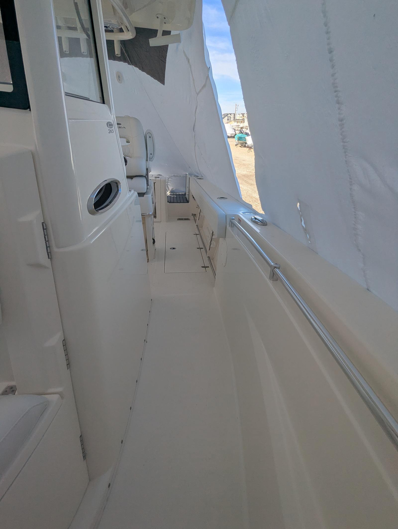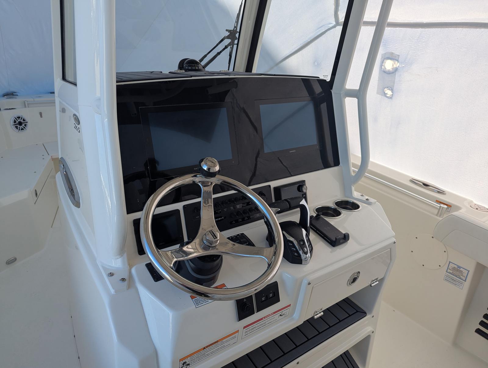 Owning the Cobia 265 CC means embracing a lifestyle of fun, relaxation, and adventure. The spacious layout is perfect for socializing, with plenty of room for friends and family to gather, lounge, and enjoy the ride. The premium seating and cushion package ensure everyone stays comfortable, whether you’re cruising along the coast or anchored at your favorite spot. The advanced engine controls and steering systems make piloting the boat easy and enjoyable, so you can focus on making memories rather than managing complicated systems. The faux teak decking adds both beauty and practicality, creating a welcoming environment that’s easy to maintain.