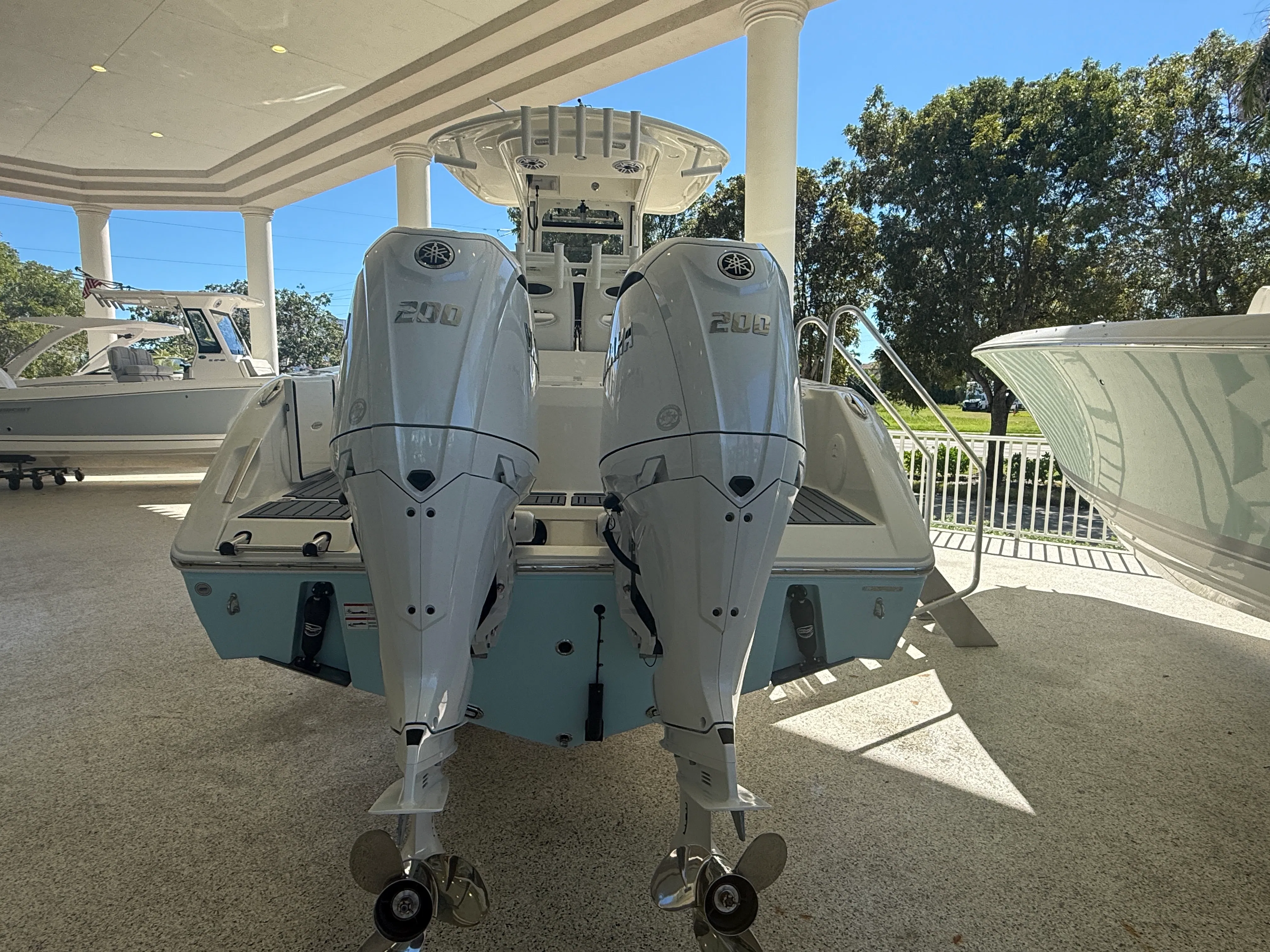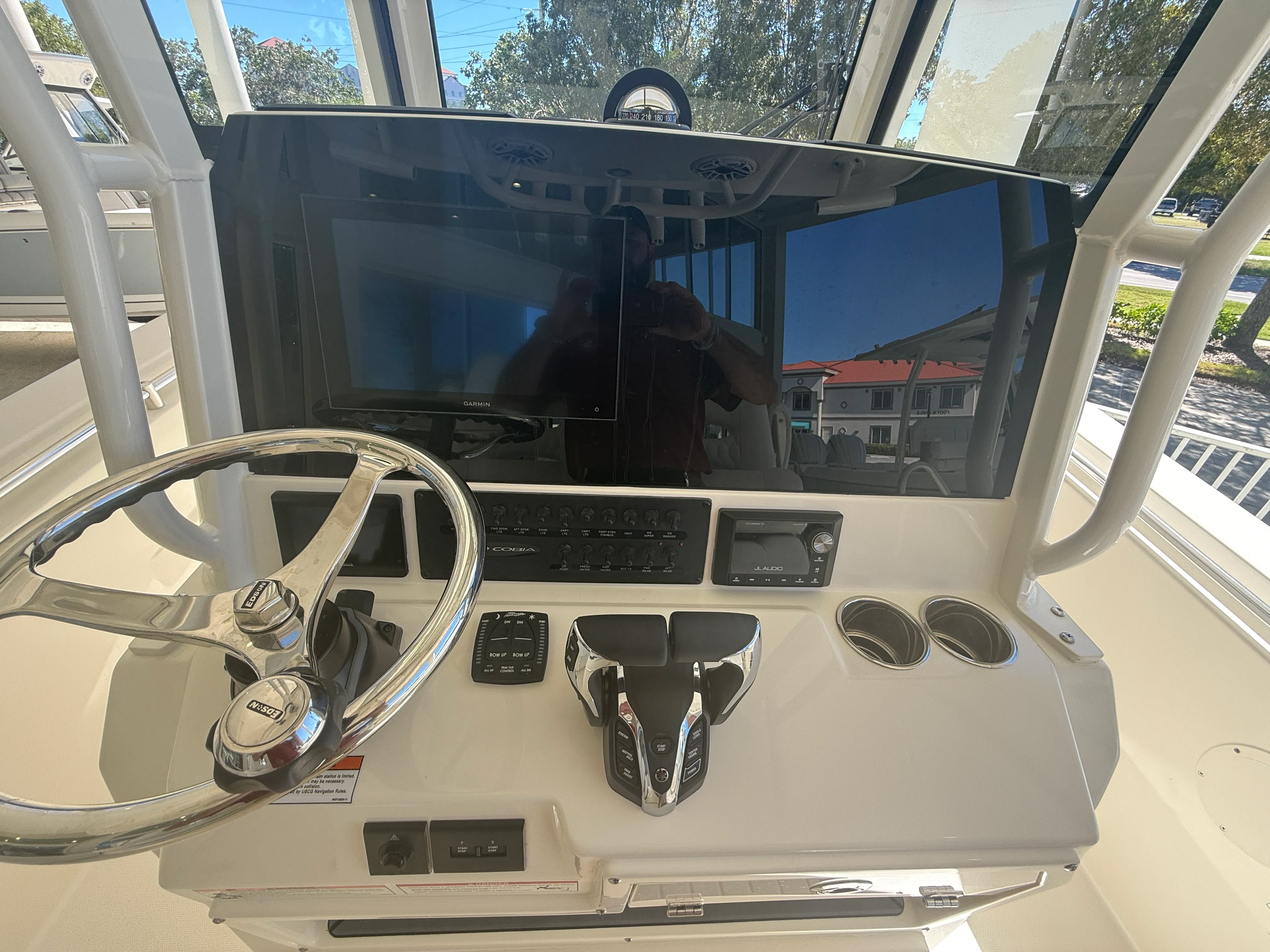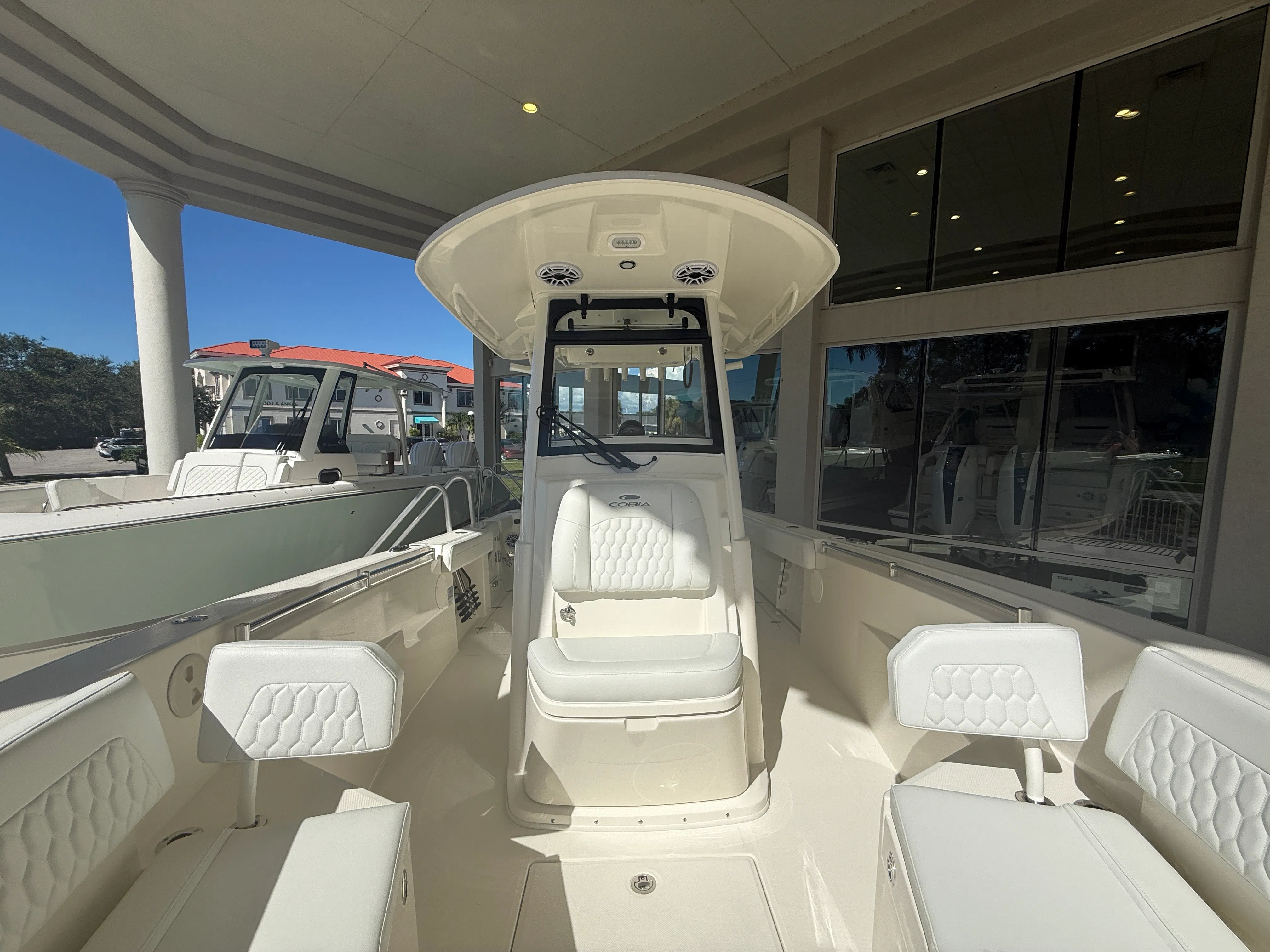 Powering the Cobia 265 CC are twin Yamaha F200XSA engines, delivering a combined 400 horsepower for an exhilarating ride. These engines are renowned for their reliability, efficiency, and smooth operation, ensuring you have the muscle needed to tackle offshore waters or cruise comfortably along the coast. The inclusion of Helm Master EX DES Twin Engine with ISO Charger elevates your boating experience, providing advanced control and seamless maneuverability. Digital Electric Steering offers precise handling, making docking and navigating tight spaces effortless. Whether you’re chasing the horizon or enjoying a leisurely cruise, the Cobia 265 CC’s performance capabilities are sure to impress.