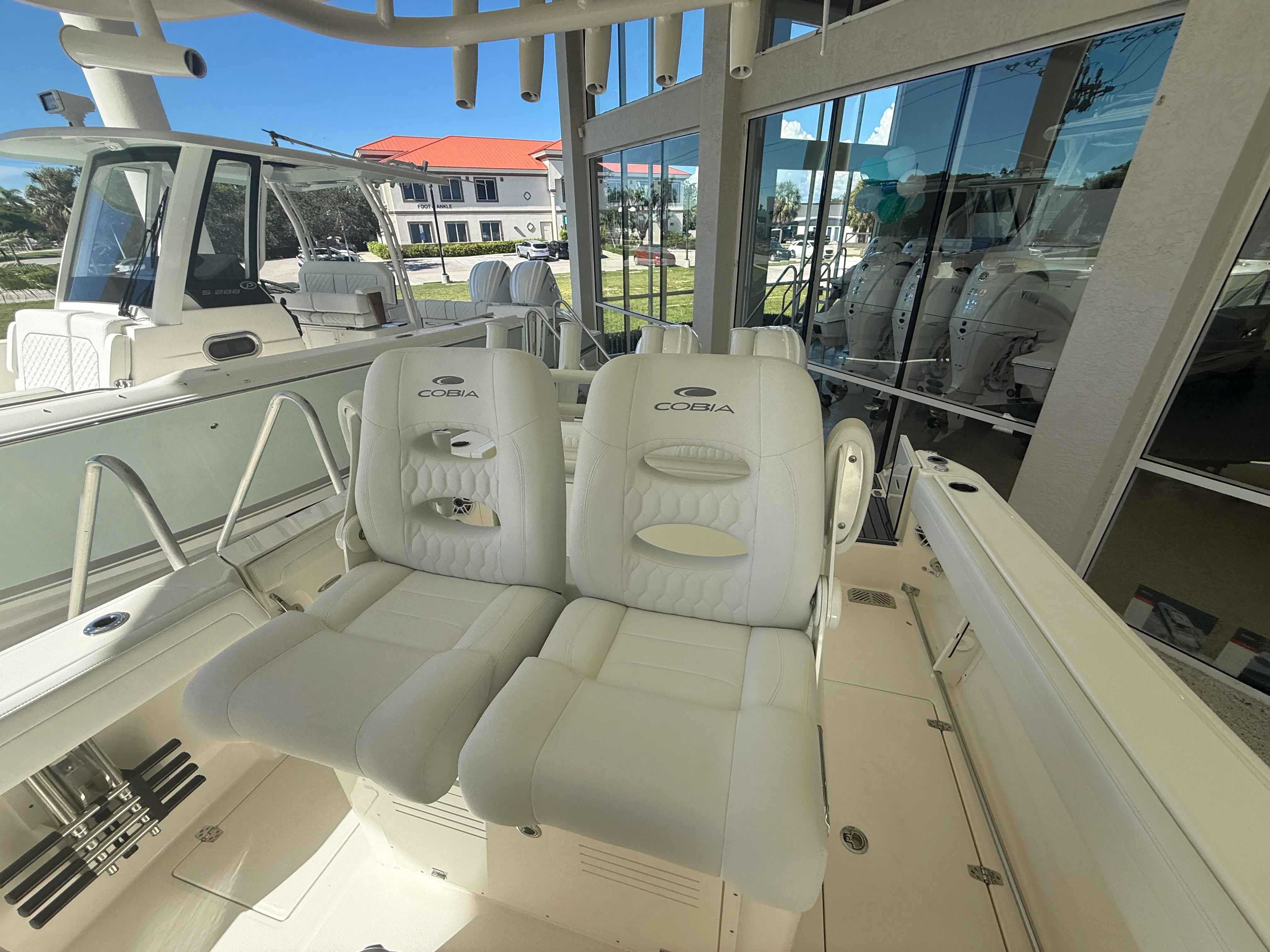 This Cobia boat for sale comes loaded with premium features designed to enhance your time on the water. The Helm Seat STD with Tackle Station provides a comfortable and functional command center, allowing you to keep your gear organized and within reach. The Bow Cushion Package and white cushion color create a welcoming and luxurious atmosphere for lounging and socializing. Trim Tabs and Trim Tab Indicators offer superior stability and control, ensuring a smooth ride even in choppy conditions. The hull’s Atlantic Blue two-tone pattern not only looks stunning but also reflects Cobia’s attention to detail and craftsmanship.
