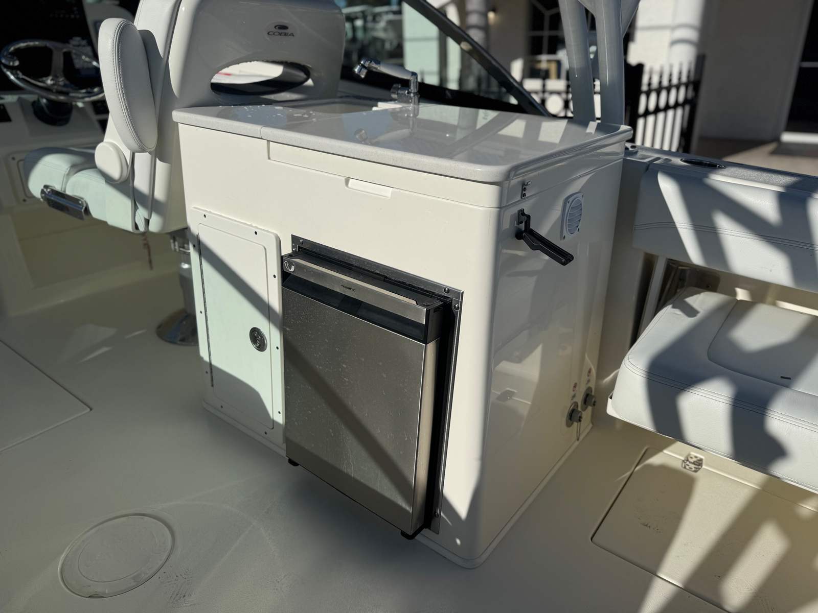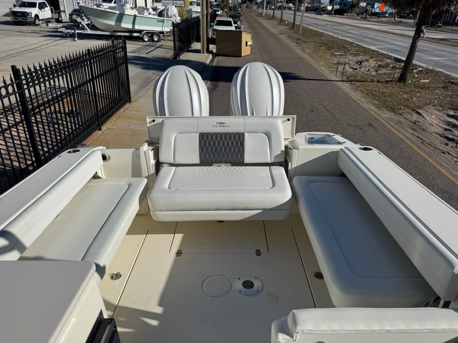 The Cobia 280 DC is packed with premium features that enhance comfort, convenience, and entertainment. The seating options on both the starboard and port sides are complemented by plush, two-tone platinum and white cushions, creating a sophisticated and inviting atmosphere. The full cockpit shade, operated by a push-button electric system, provides ample protection from the sun, allowing you to relax in comfort during long days on the water.For those who appreciate cutting-edge technology, the boat is equipped with a Garmin GPSMAP 8612 XSV with an acrylic dash, Airmar B175L, and GT56UHD-TM transducers. This advanced electronics package ensures accurate navigation, fish finding, and system monitoring, giving you confidence and control wherever your journey takes you.Entertainment is elevated with the JL Audio stereo system, featuring an amplifier and eight white speakers. Whether you’re hosting a party or enjoying a quiet cruise, the high-quality sound system delivers crystal-clear audio throughout the vessel. The 12V DC refrigerator adds a touch of convenience, keeping your refreshments cool and easily accessible.Comfort and versatility are further enhanced by the forward table and sun lounge, offering a perfect spot for dining, socializing, or soaking up the sun. Every detail of the Cobia 280 DC is designed to maximize enjoyment and relaxation, making it a standout Dual Console boat for sale.