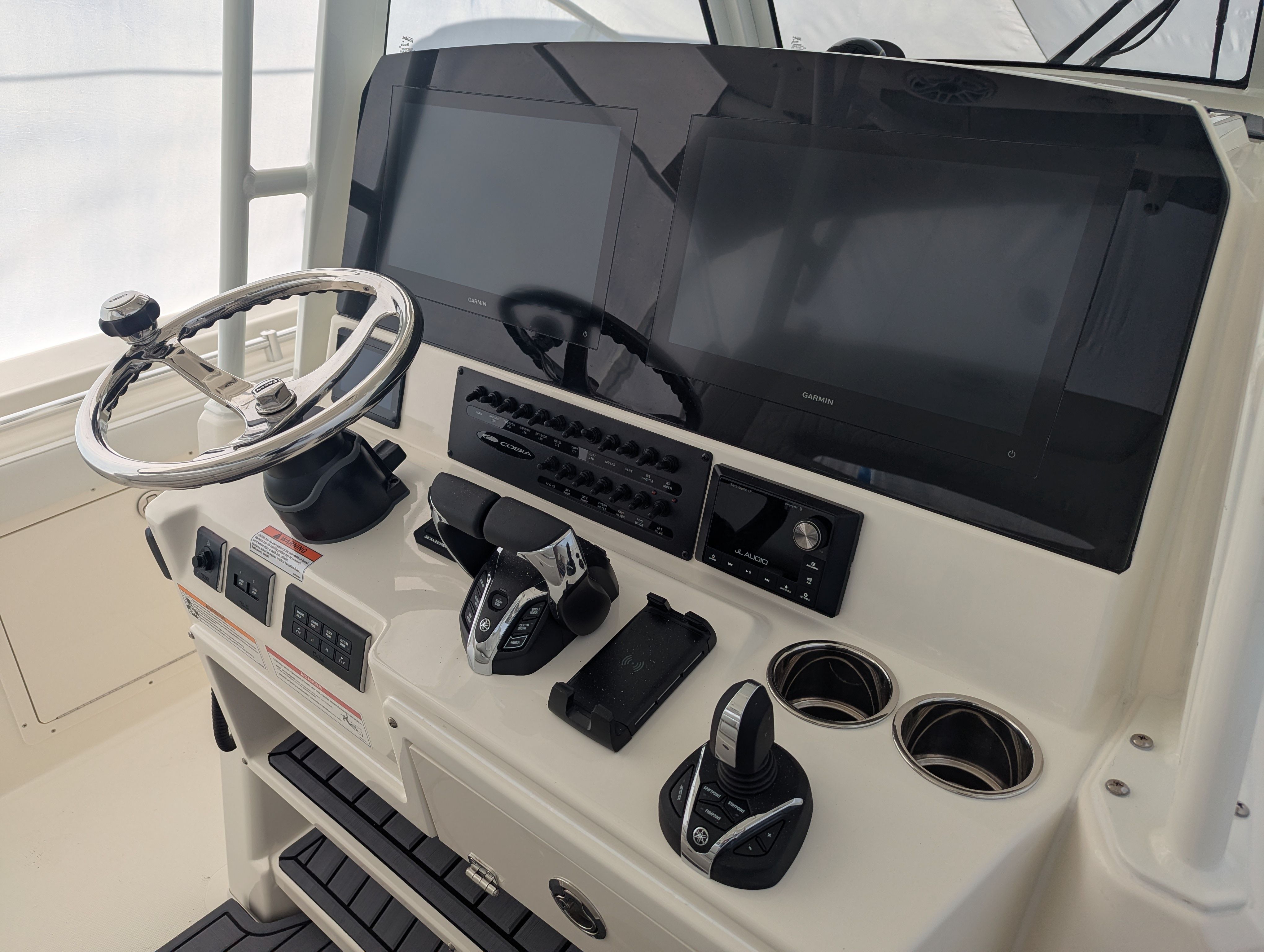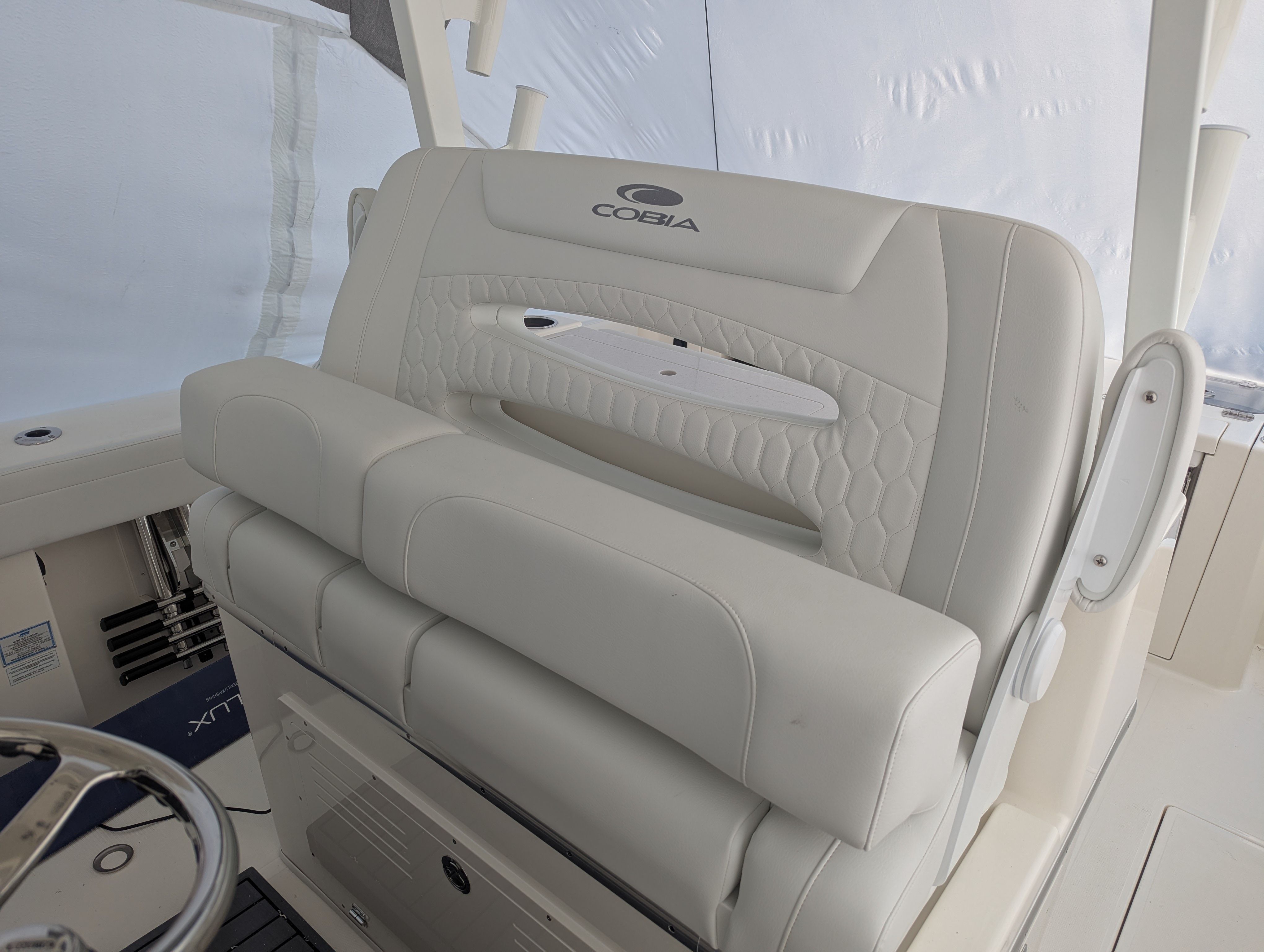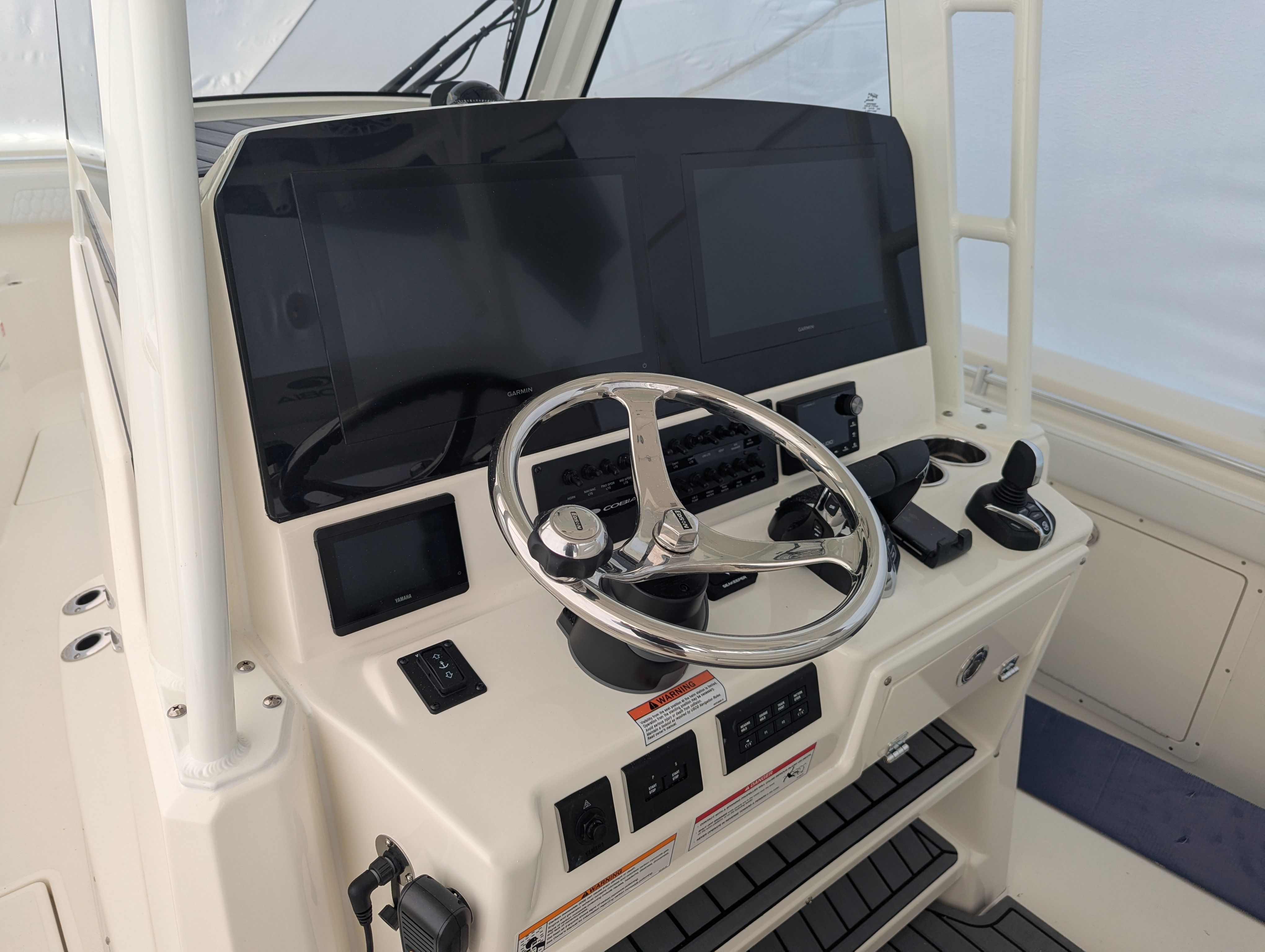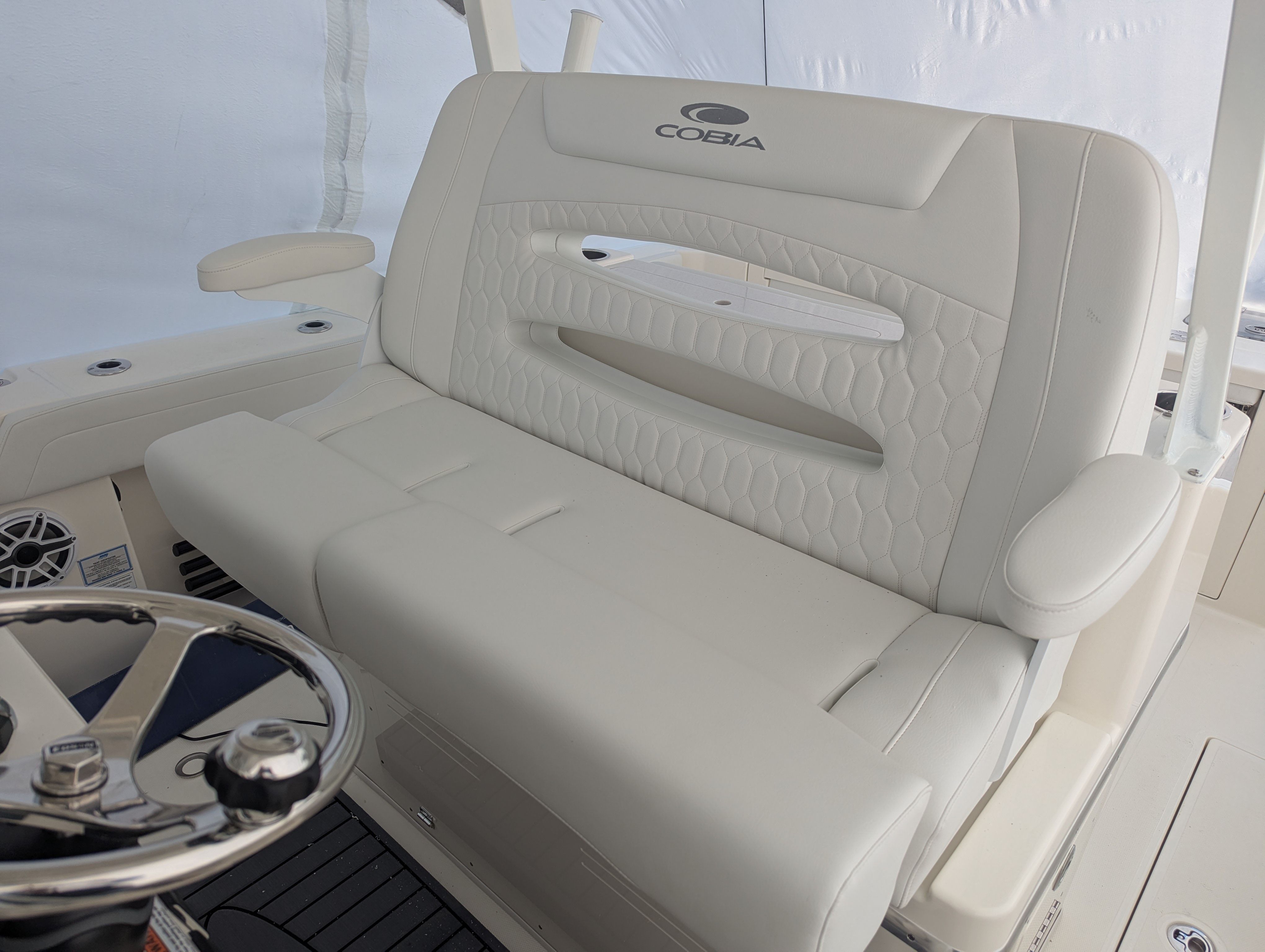 At the heart of the Cobia 305 CC is a powerhouse propulsion system: twin Yamaha F350XSA2 engines in a striking white finish. With a combined 700 horsepower, this center console boat offers exhilarating speed, smooth acceleration, and reliable performance for offshore runs or leisurely cruises. The advanced Helm Master EX DES twin engine controls with autopilot and joystick steering provide precise handling and effortless maneuverability, making docking and tight turns a breeze. The upgraded Edson stainless steel steering wheel with a power knob adds a touch of sophistication and ensures responsive control at all speeds. The Seakeeper Ride trim tabs and indicators further enhance stability and ride comfort, allowing you to tackle choppy waters with confidence.