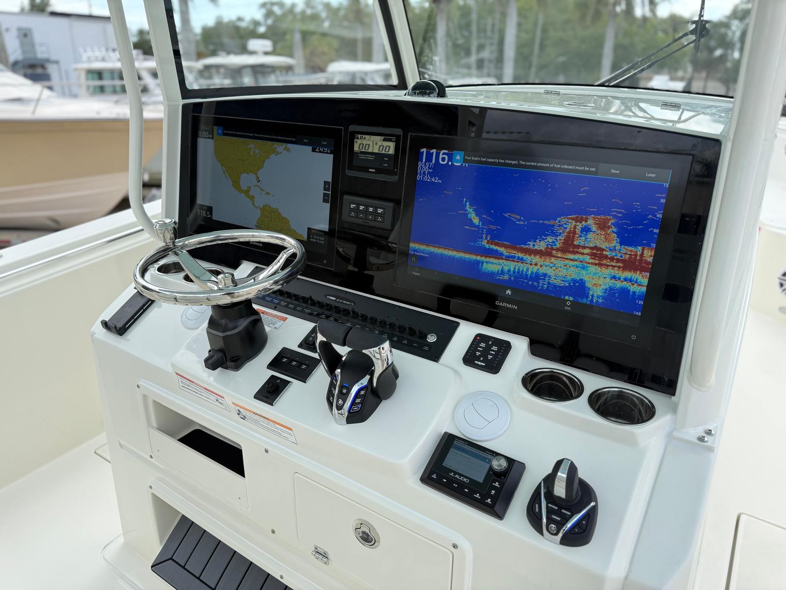 Powering the Cobia 350 CC are three high-performance engines, delivering a combined 1,050 horsepower. This impressive setup ensures exhilarating acceleration, smooth cruising, and the ability to tackle a variety of water conditions with confidence. The advanced Helm Master EX with Digital Electric Steering and Joystick control provides precise handling and effortless maneuverability, making docking and navigating tight spaces a breeze. The integrated Auto Pilot system adds another layer of convenience, allowing you to maintain your course with minimal effort and maximum efficiency. Whether you are chasing the horizon or exploring coastal waters, the Cobia 350 CC offers a thrilling and reliable ride every time.