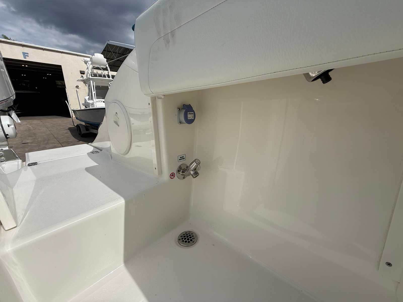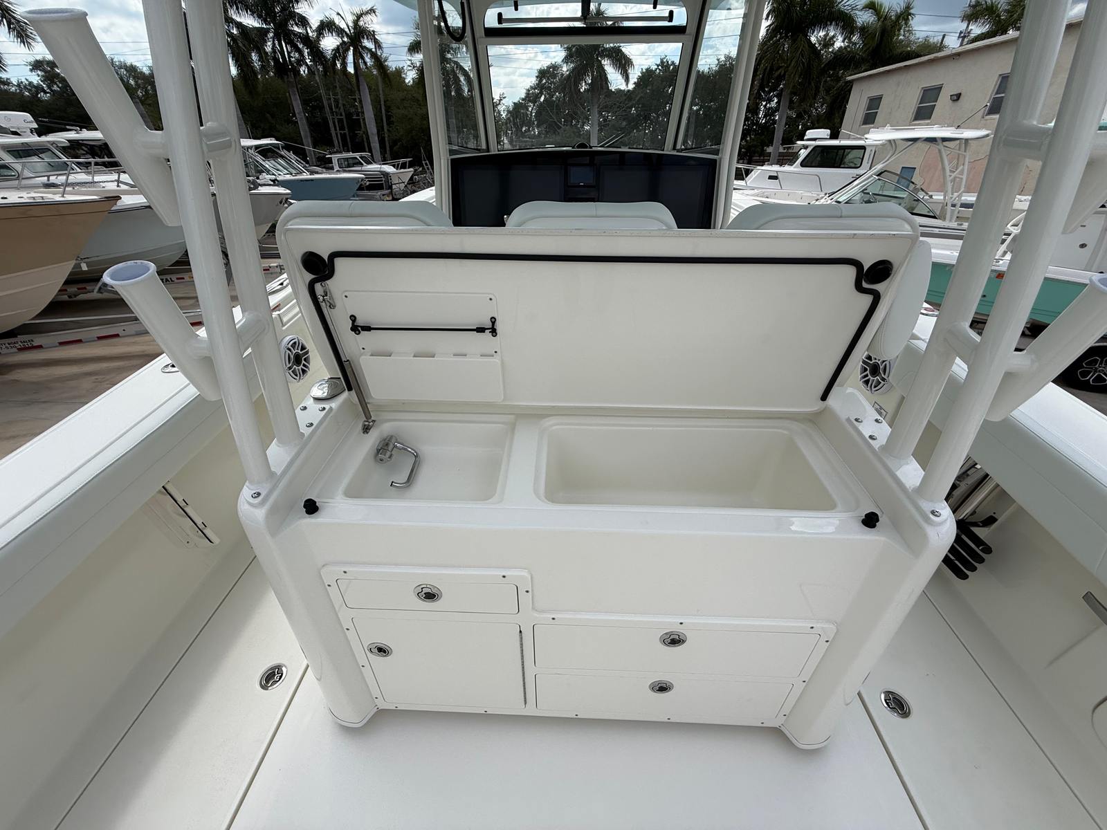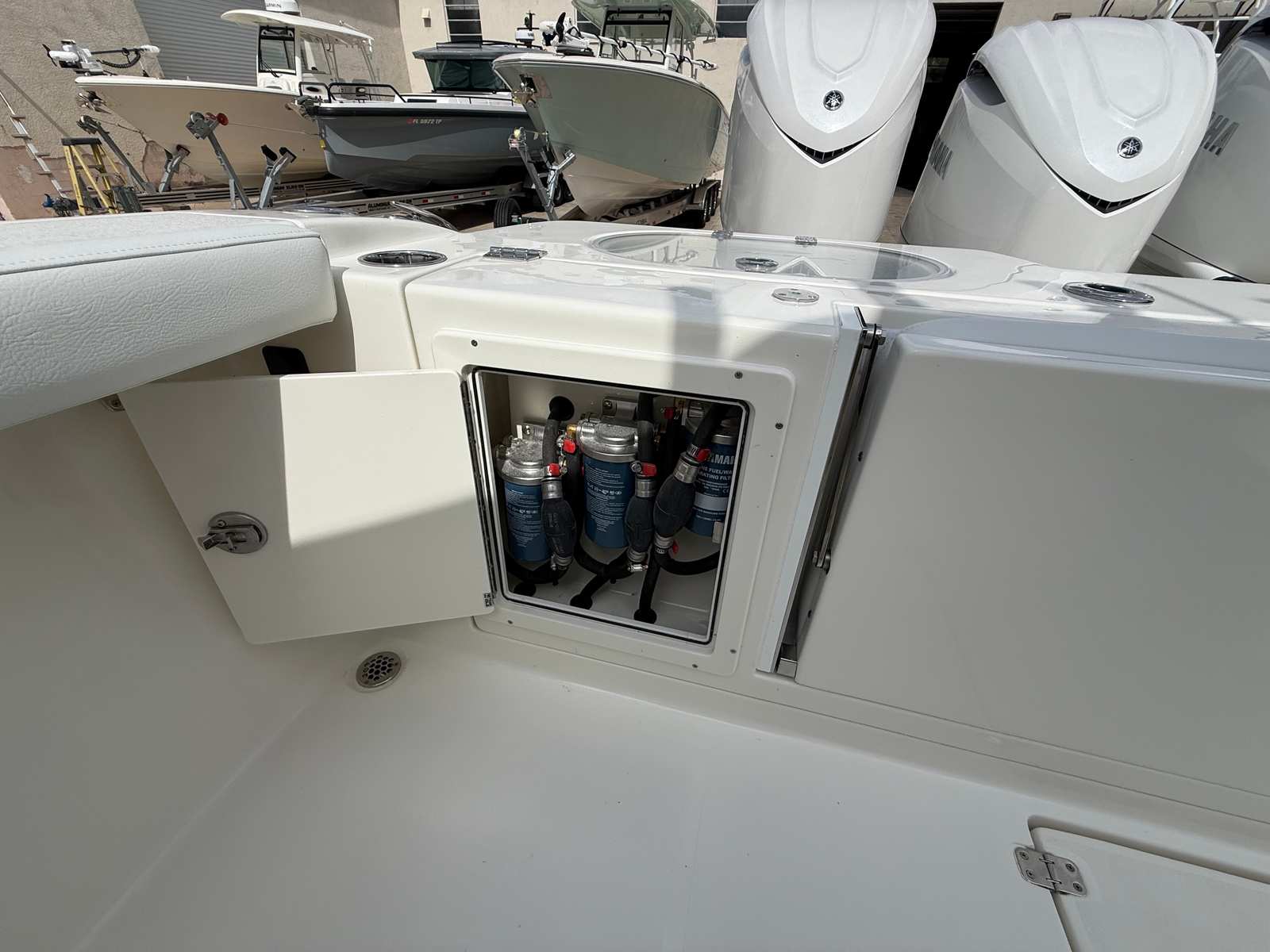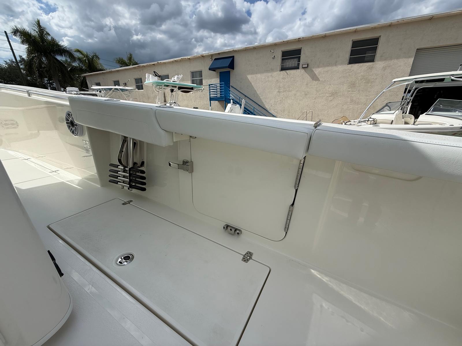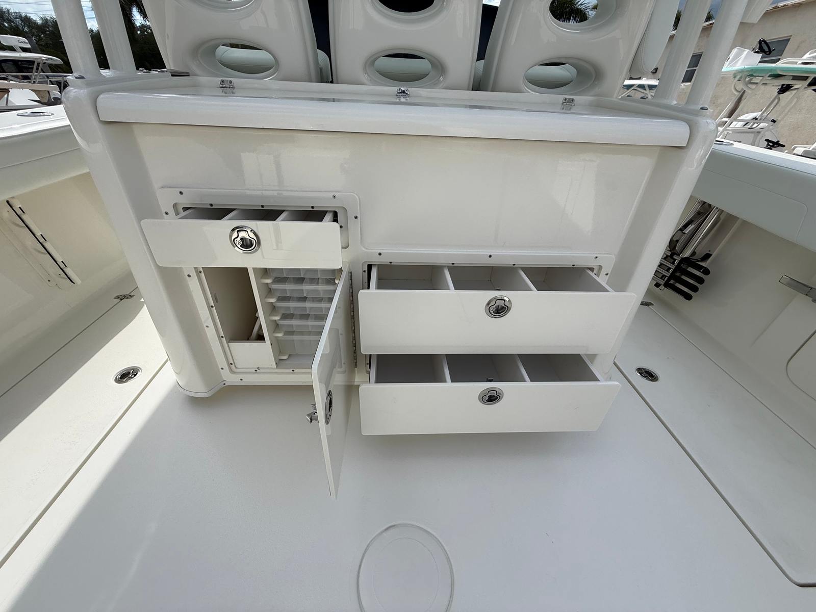 The Cobia 350 CC is as practical as it is luxurious. The center console design maximizes deck space and provides excellent visibility for the captain, making it ideal for fishing, cruising, or water sports. The ample storage options ensure you have plenty of room for gear, supplies, and personal items, keeping the deck clutter-free and organized.Docking and maneuvering are simplified thanks to the advanced steering and control systems, allowing you to handle the boat with confidence, even in crowded marinas or tight slips. The durable faux teak decking is easy to clean and maintain, while the fresh water flush for the electric head adds a layer of convenience that busy boaters will appreciate. Every detail of the Cobia 350 CC is designed to make ownership as enjoyable and hassle-free as possible.