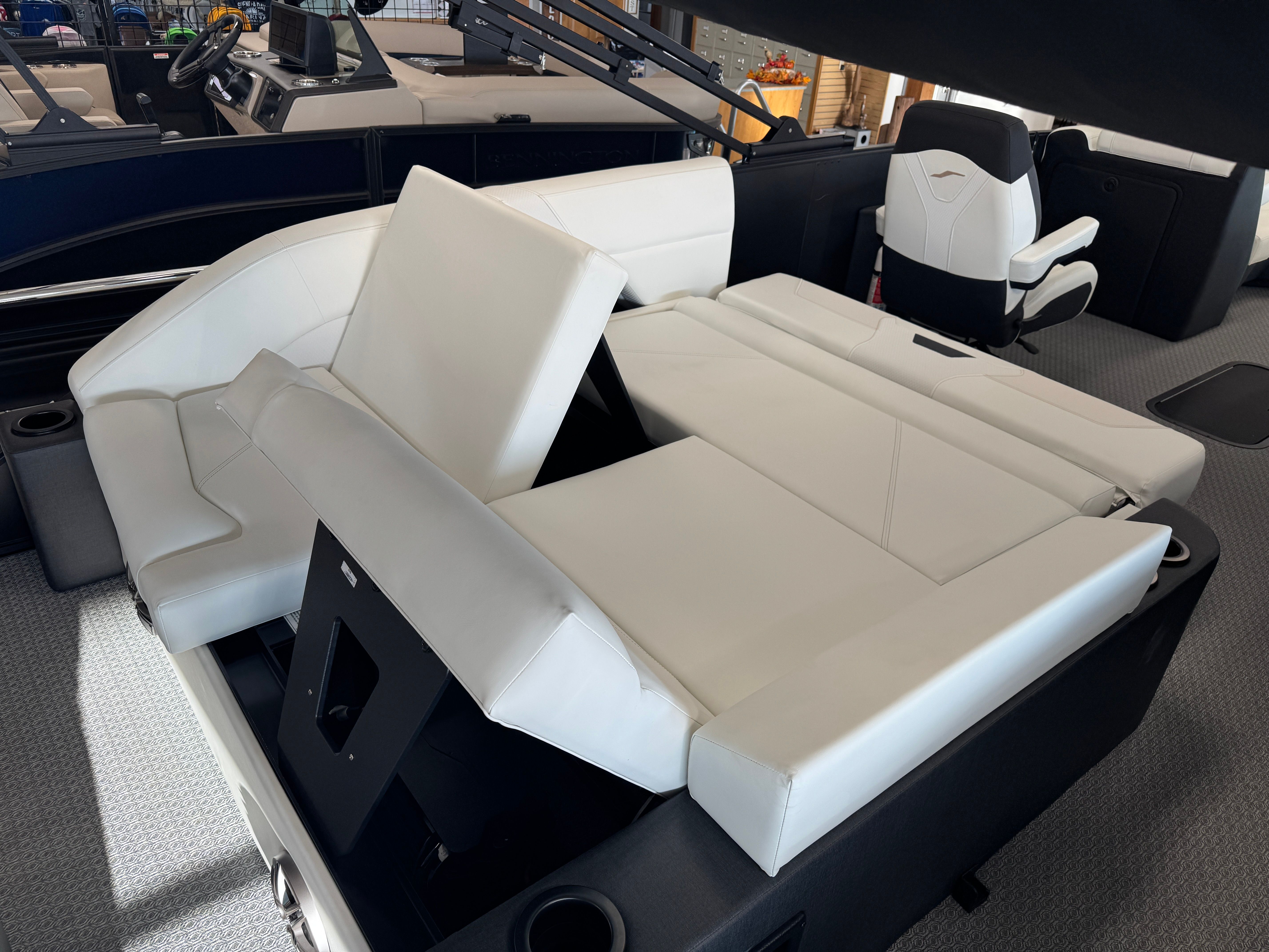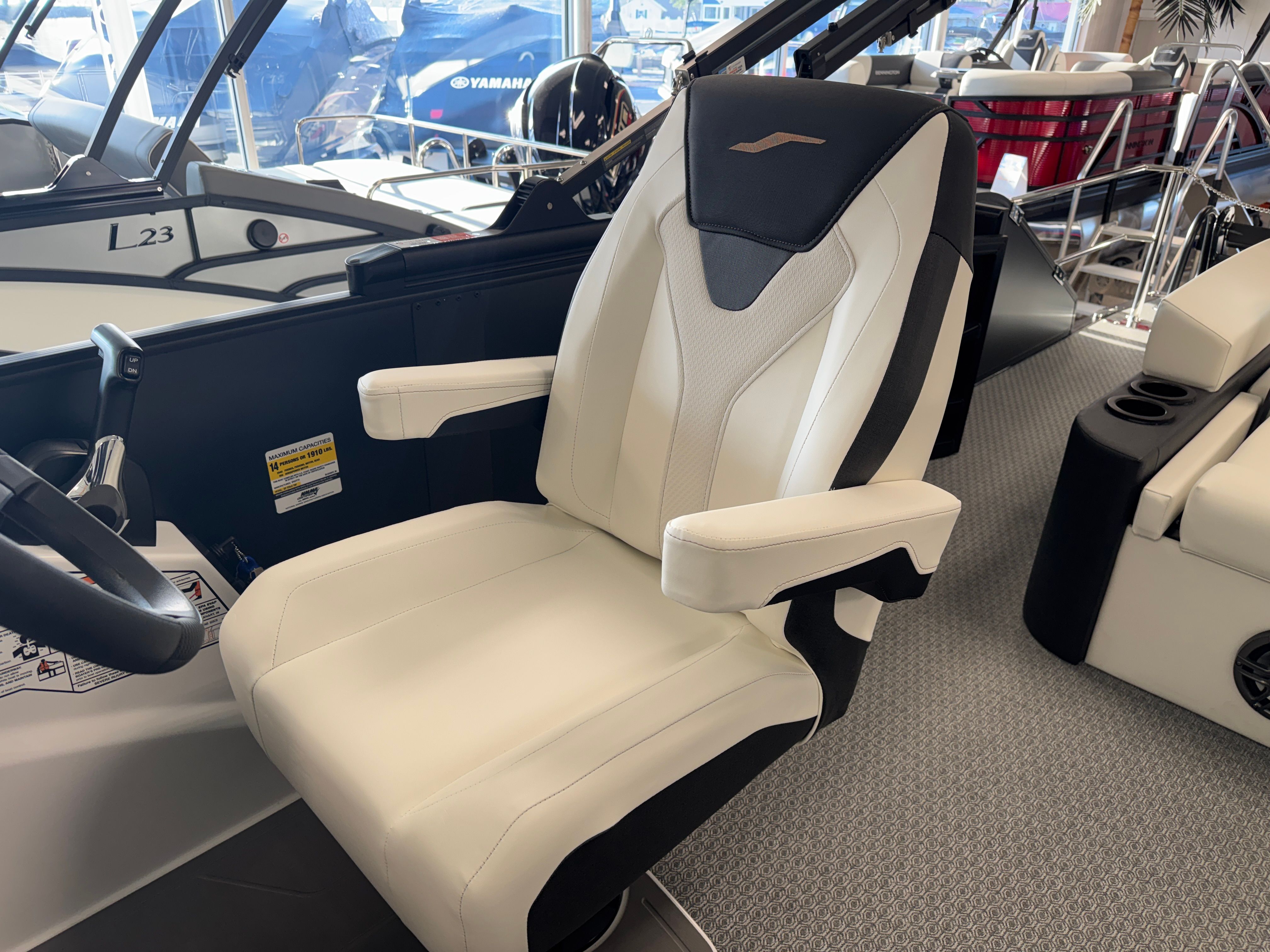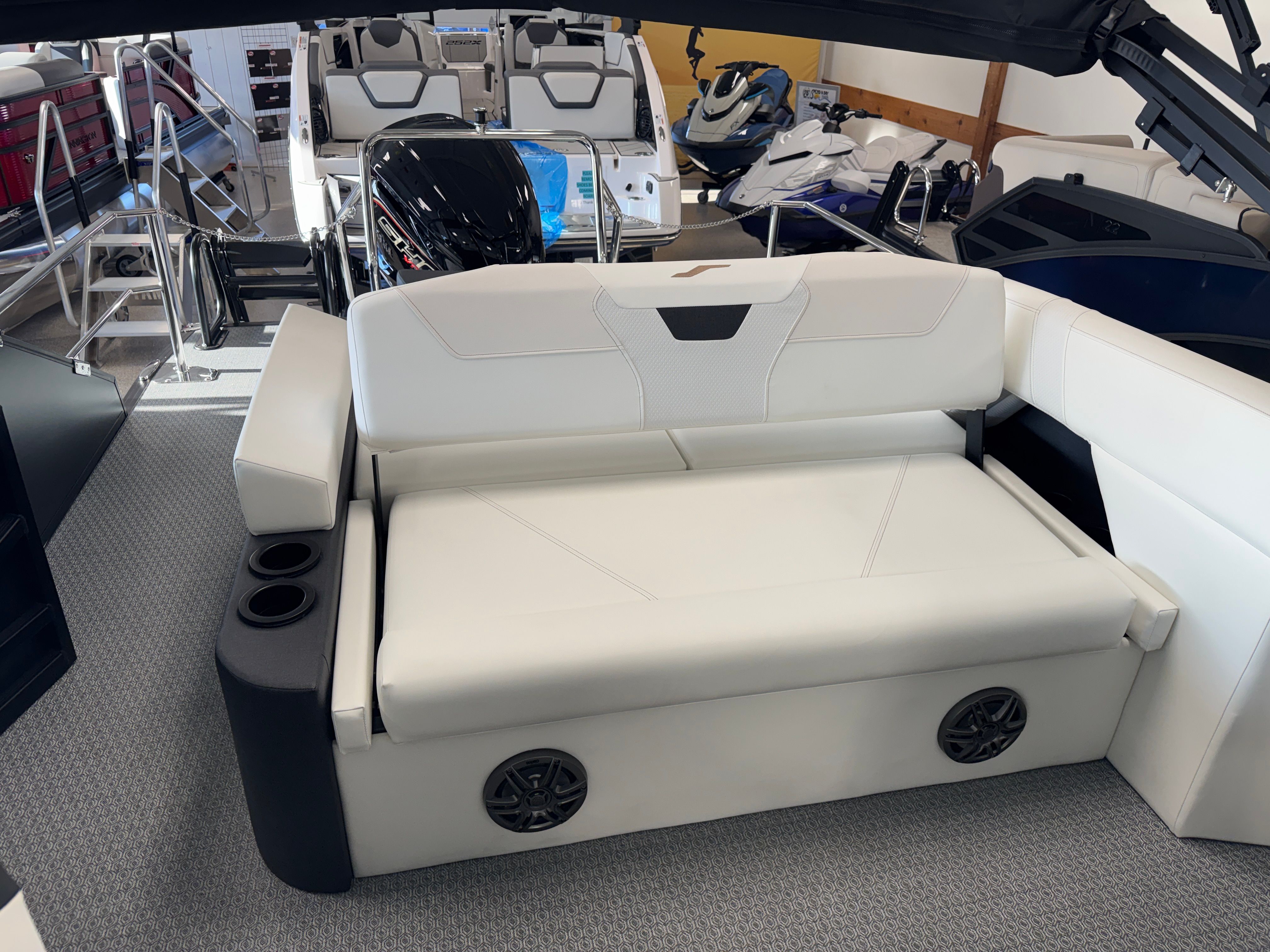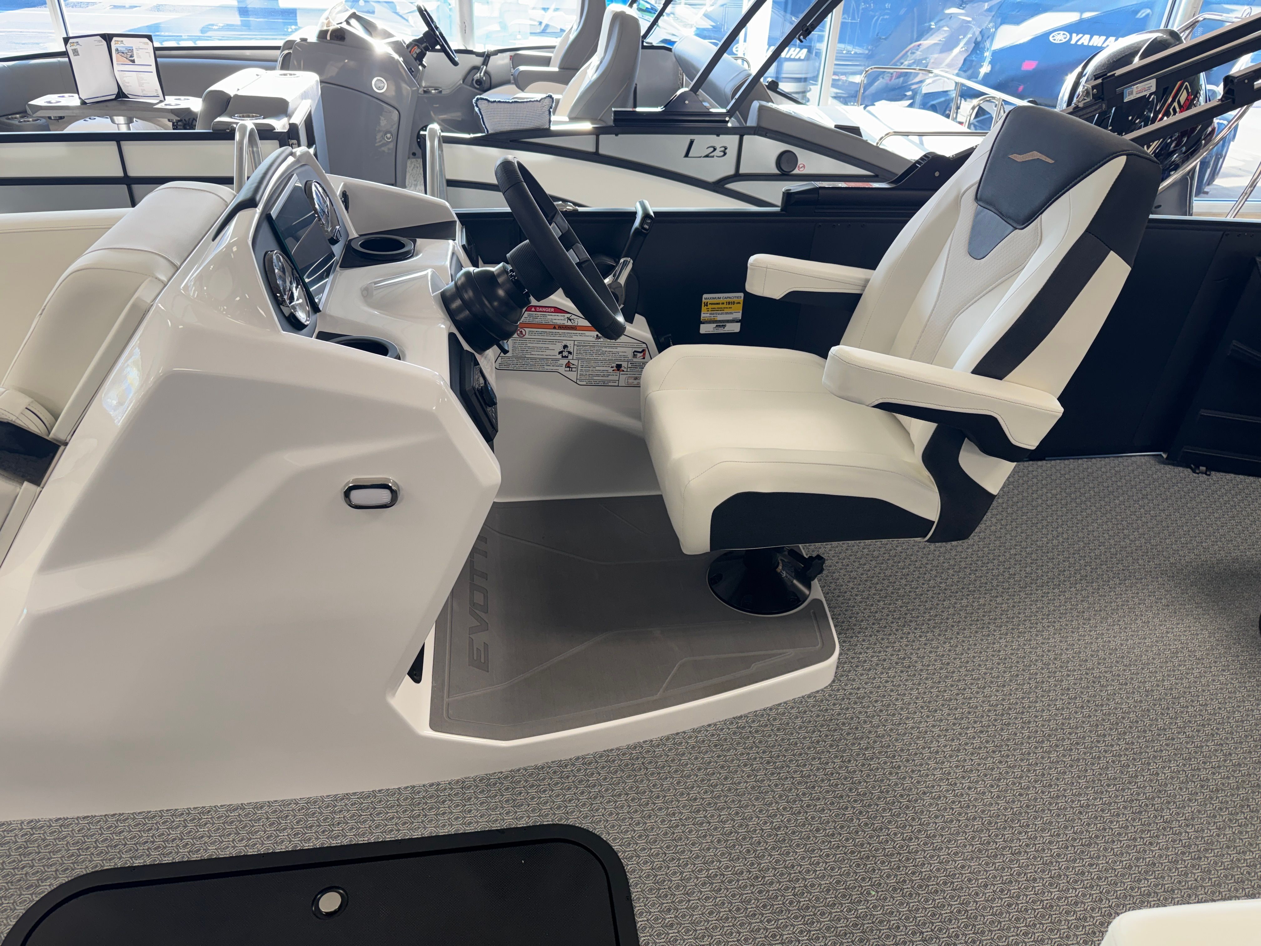 The Evotti 523 CS is loaded with special features that enhance both its visual appeal and functionality. The Panel Diamond Black Satin and Panel Accent Pearl White Gloss create a striking exterior, while the Canvas Black adds a touch of elegance and protection from the elements. Inside, the Base Vinyl Ghost White upholstery offers a clean, modern look, complemented by the Steel Gray Evolution Flooring, which is both stylish and easy to maintain. Stern safety chains provide added security, and the battery single setup ensures reliable power for all your onboard needs. Every detail is thoughtfully designed to maximize comfort, safety, and enjoyment on the water.