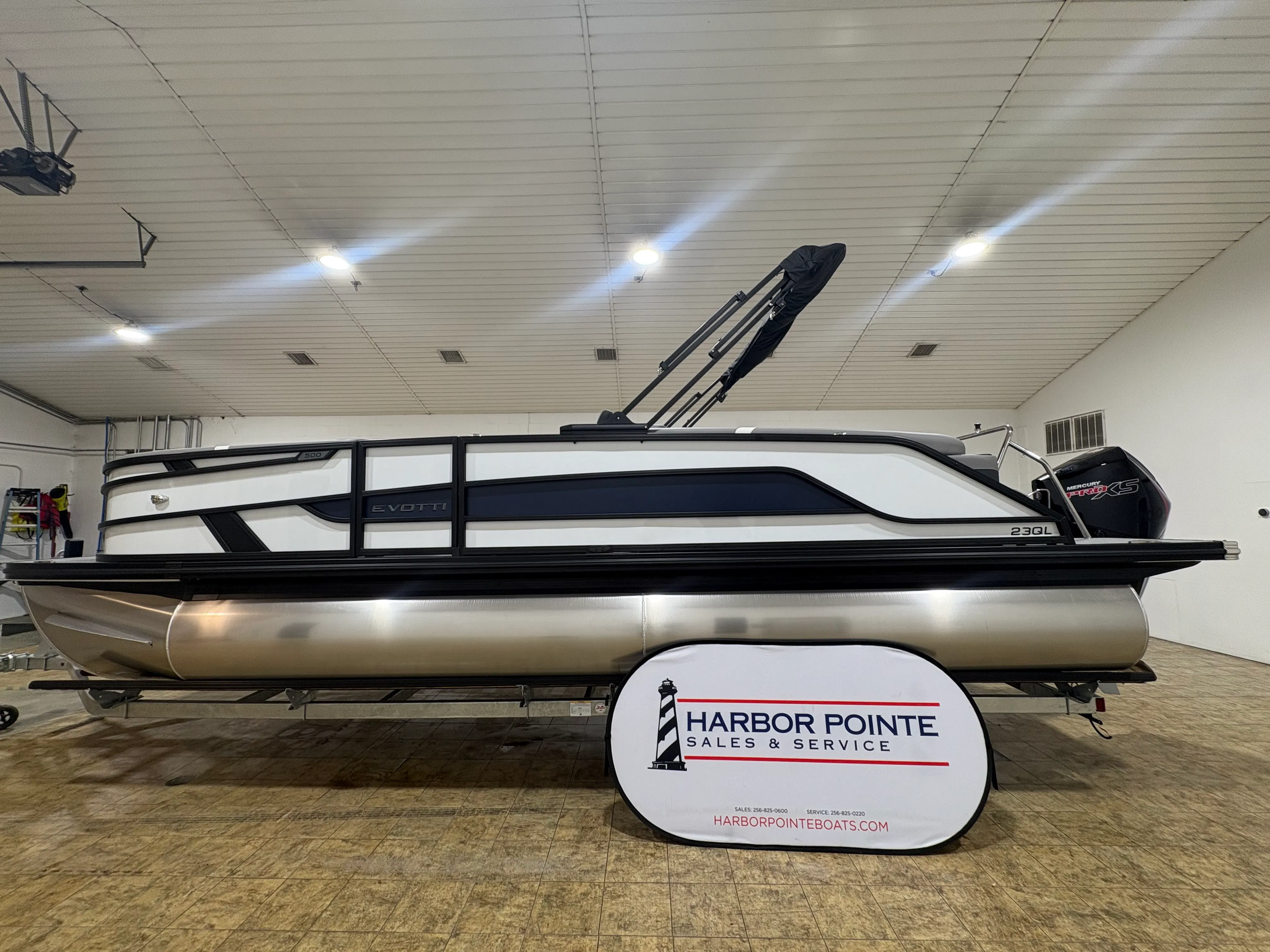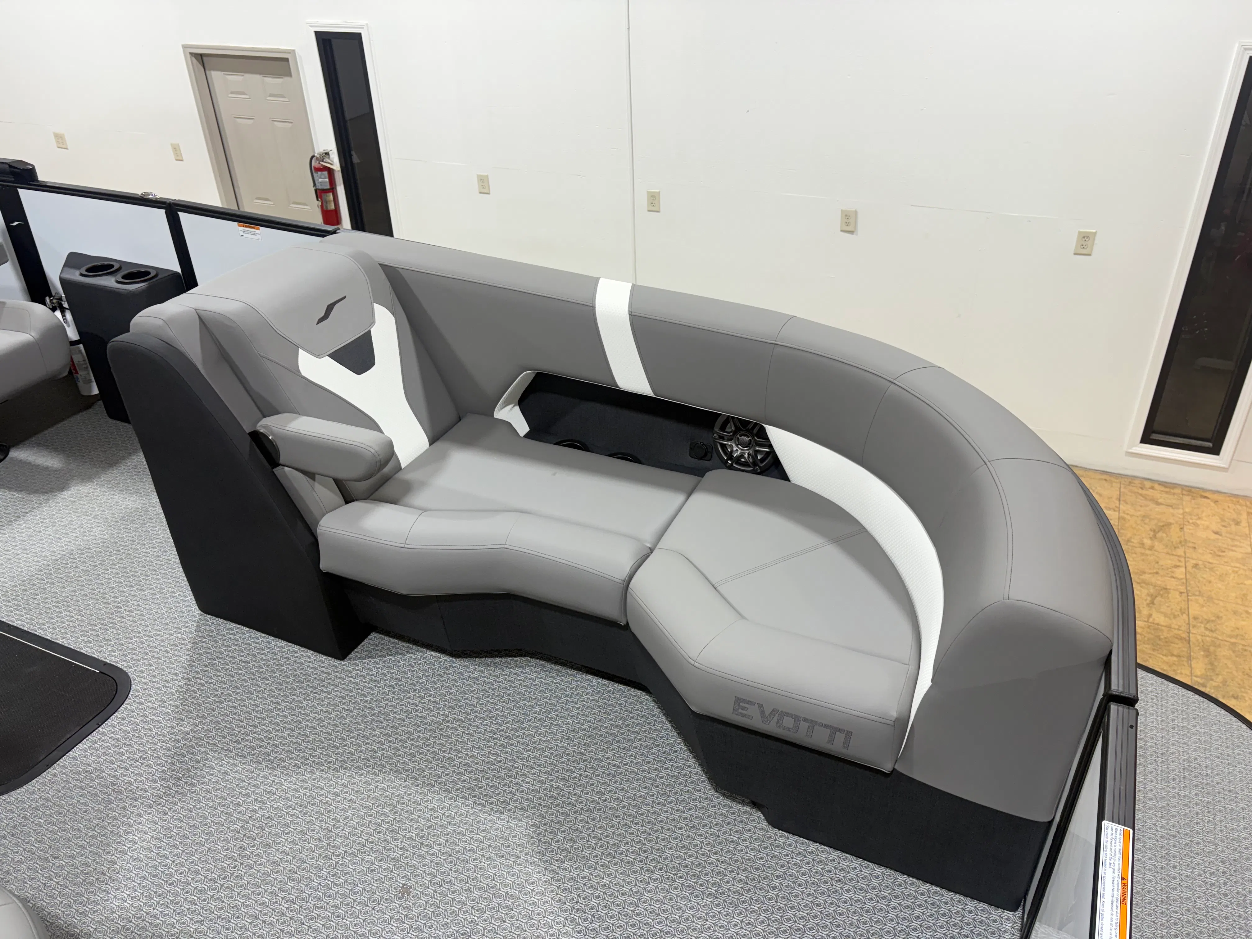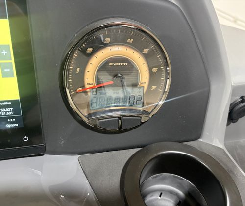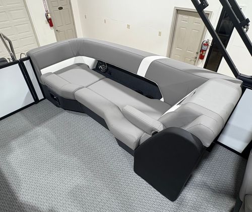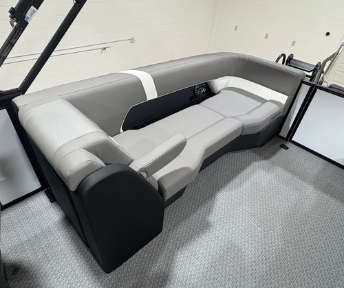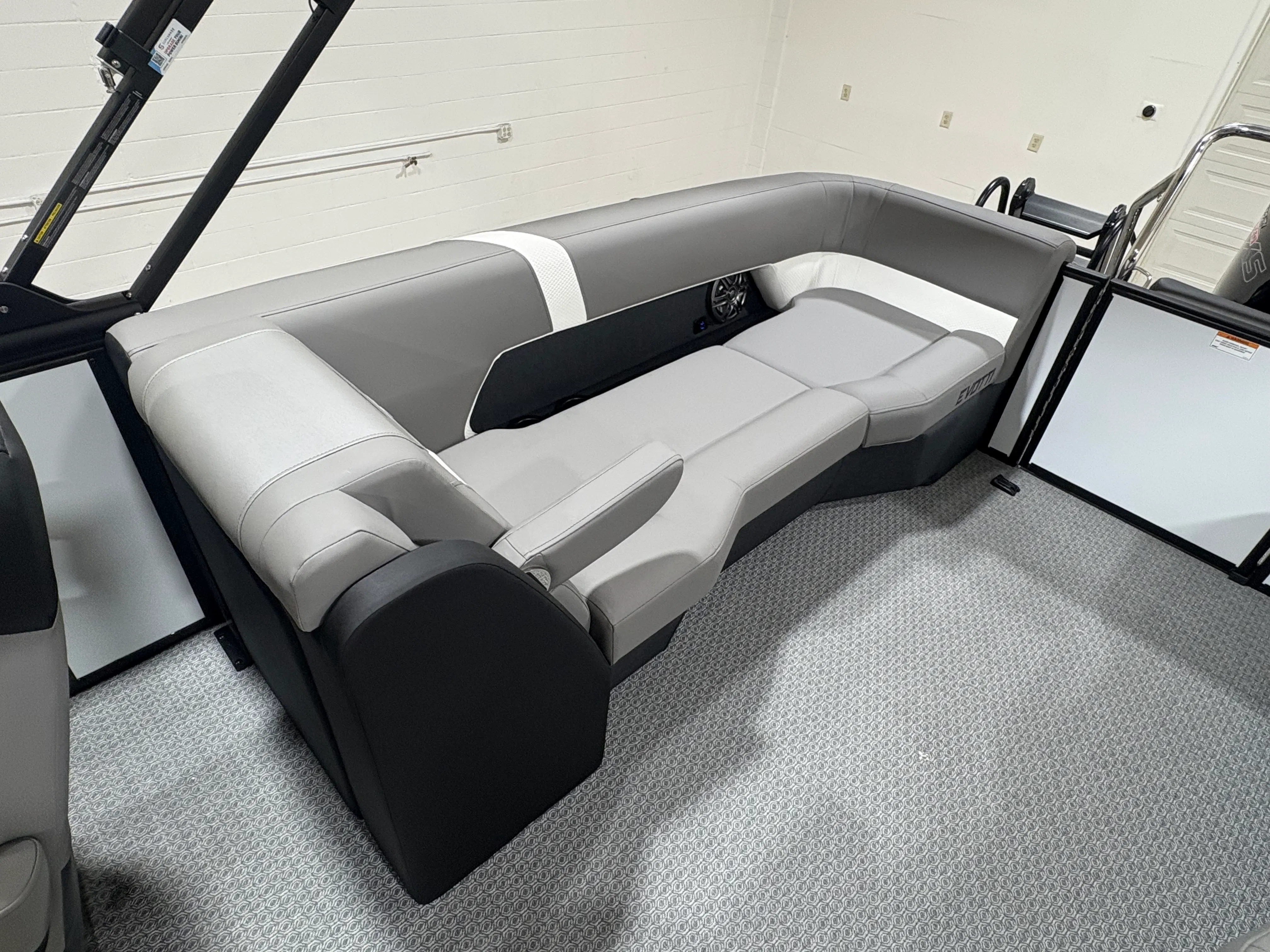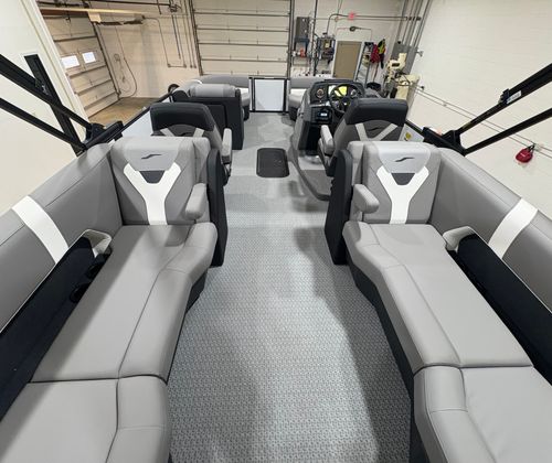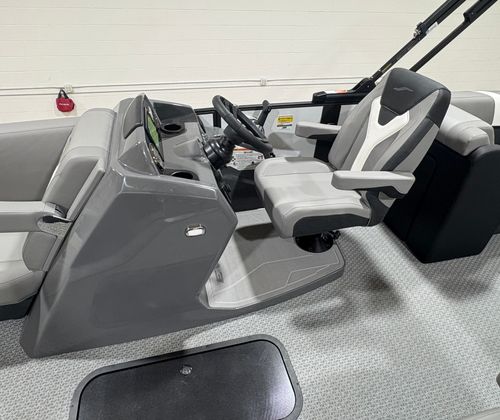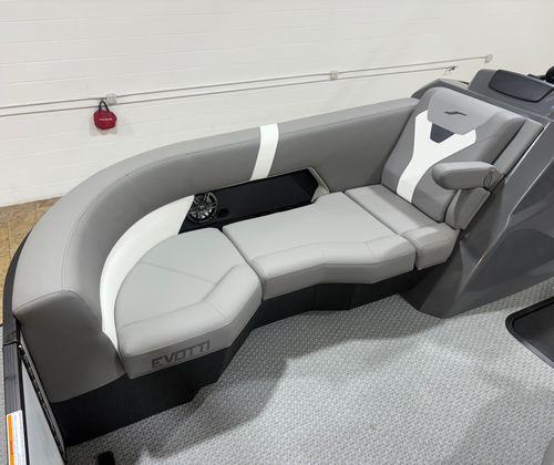 The 2026 Evotti 523 QL is packed with features that enhance both its aesthetic appeal and its functionality. The Base Vinyl Ghost White and Base Vinyl Steel Gray upholstery create a sophisticated and inviting atmosphere, while the Panel Pearl White Gloss and Panel Accent Platinum Blue Satin add a touch of modern elegance. The Steel Gray Evolution Flooring is not only stylish but also durable and easy to maintain, ensuring your pontoon remains pristine trip after trip.For those who appreciate high-quality sound, the Clarion Head Unit & Speakers provide crystal-clear audio, perfect for setting the mood or entertaining guests. Navigating your favorite waterways is a breeze with the Garmin 943 featuring 5" gauges, offering advanced navigation and easy-to-read information at your fingertips. The Canvas Black provides shade and protection from the elements, allowing you to enjoy your time on the water in comfort.