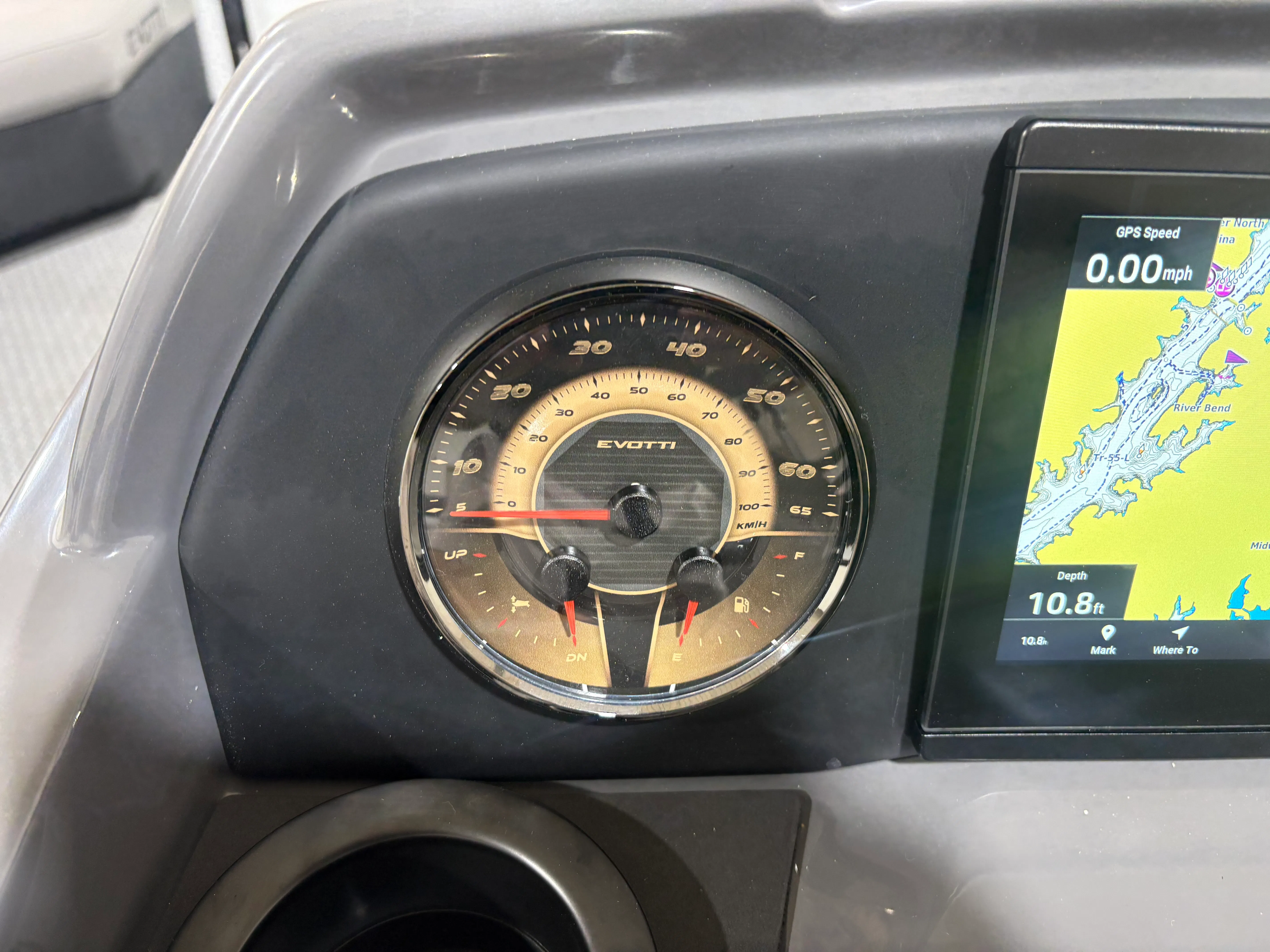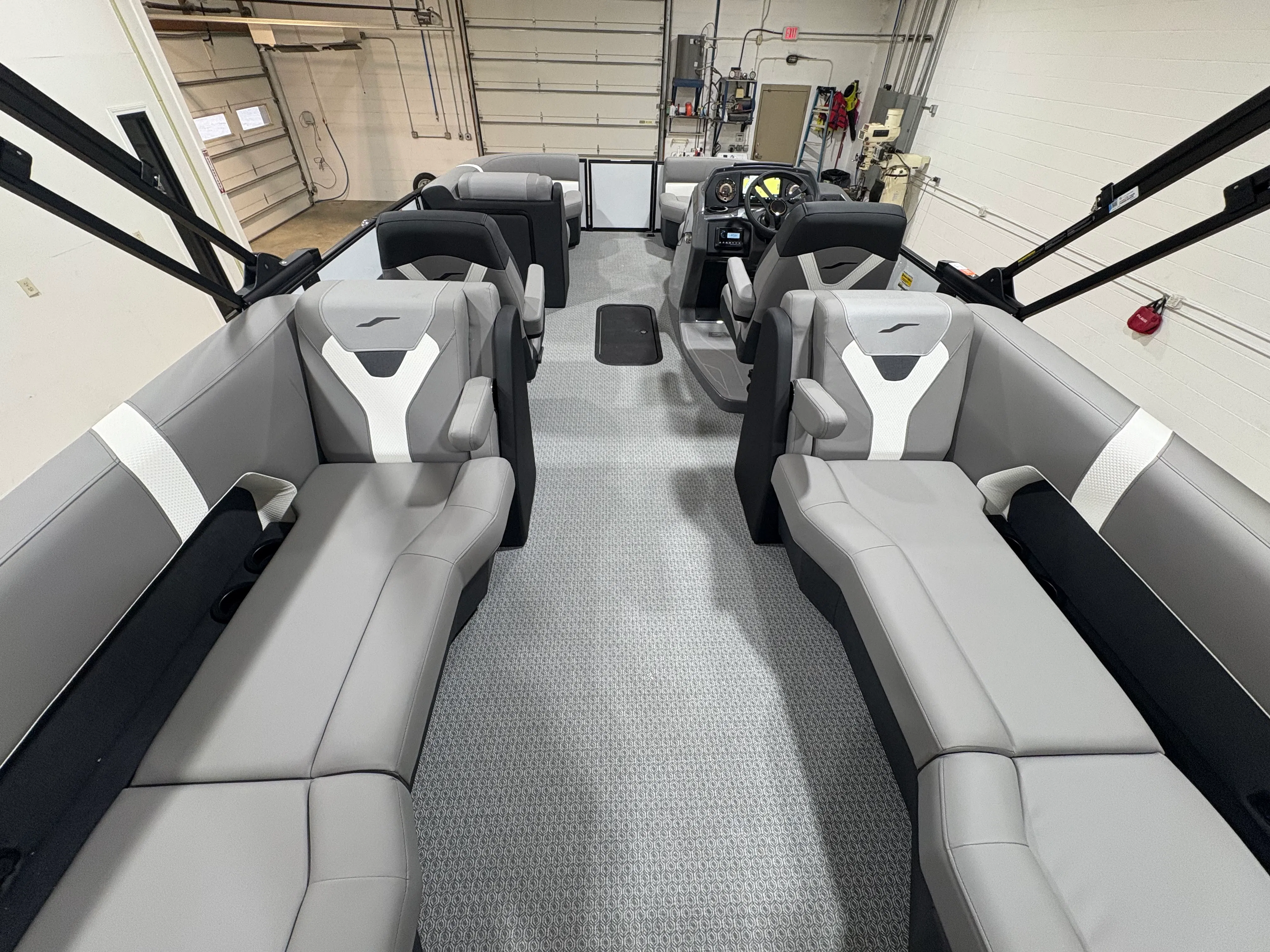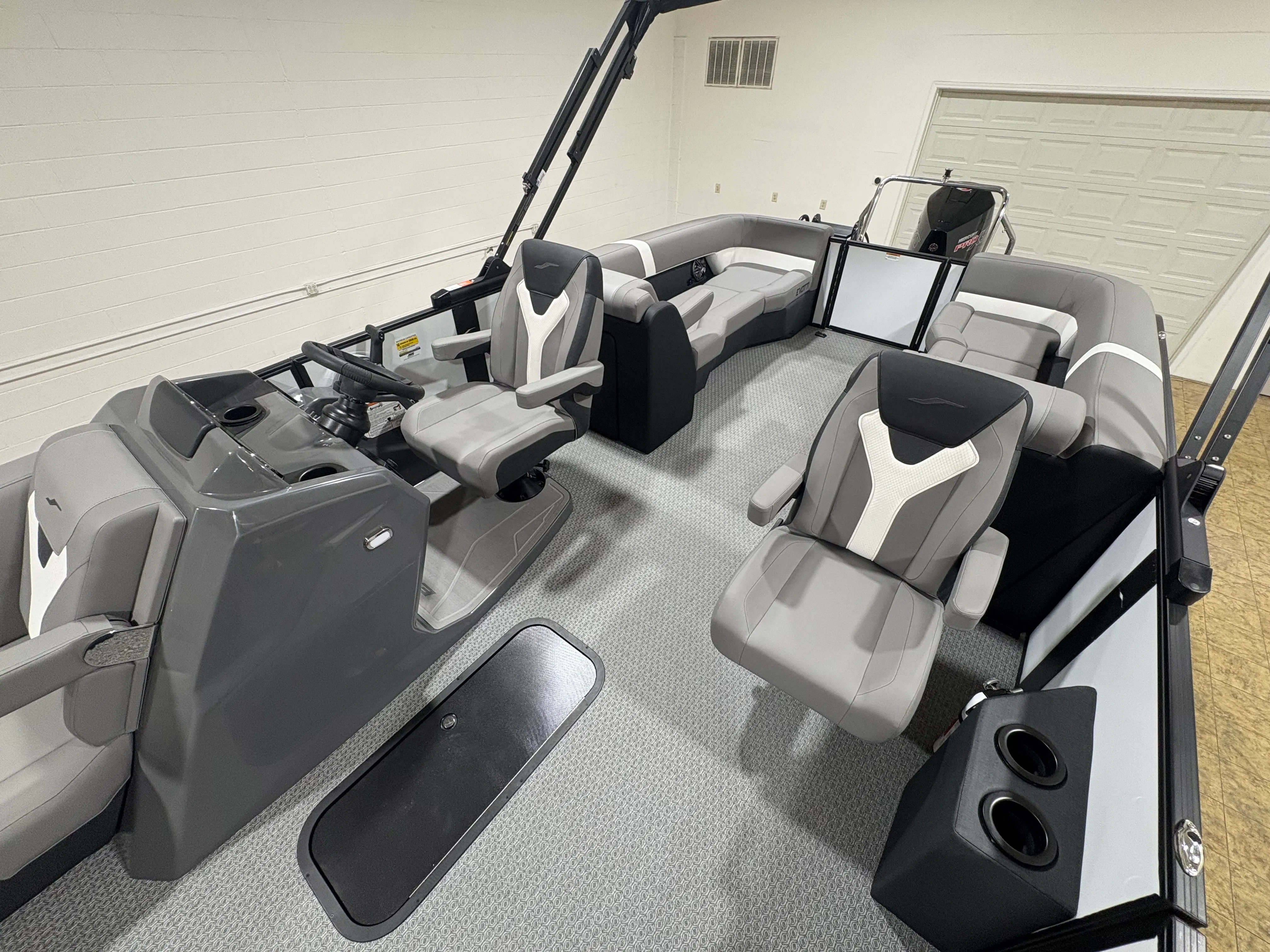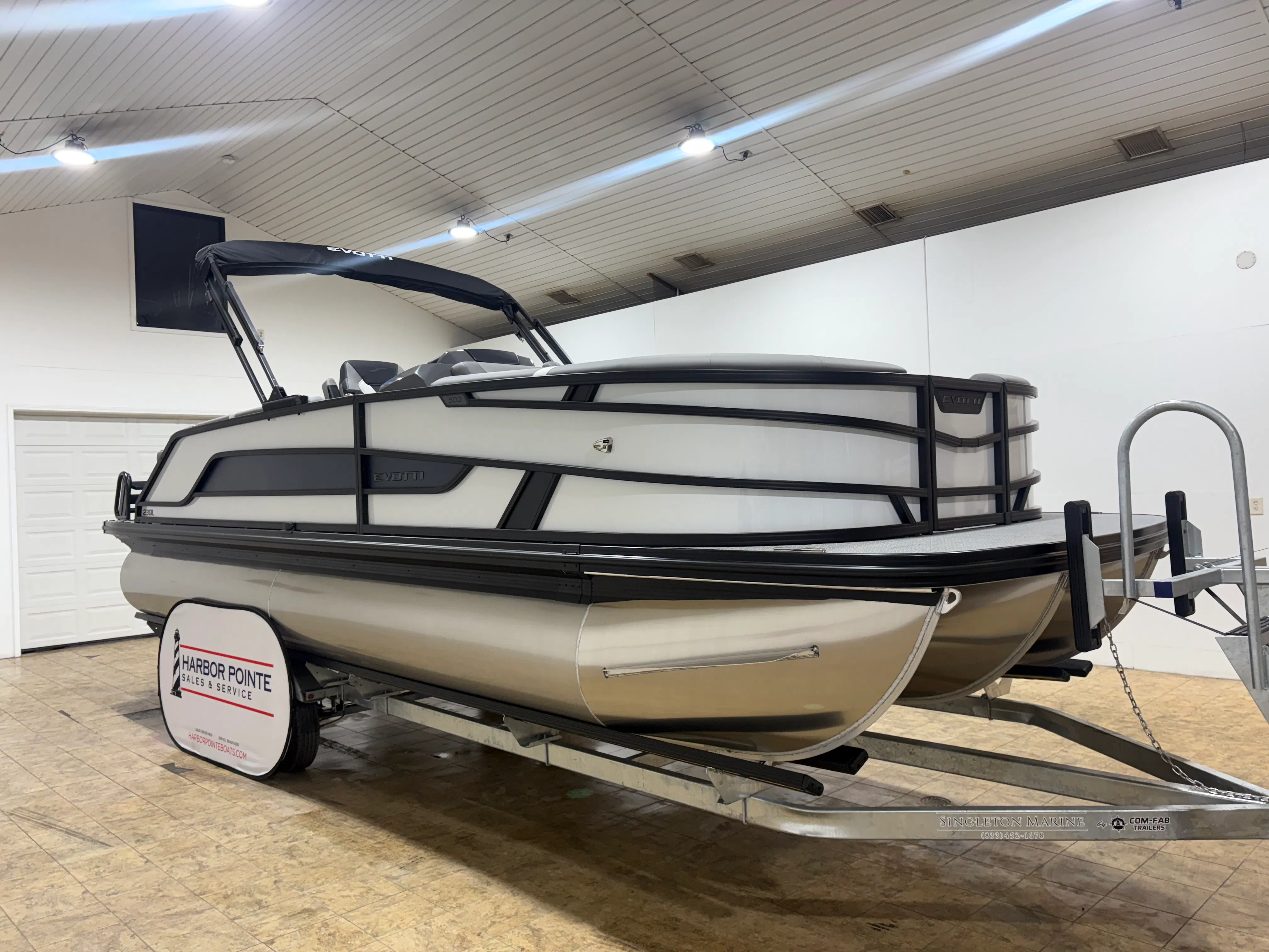 The 2026 Evotti 523 QL is packed with features that enhance both its aesthetic appeal and its functionality. The Base Vinyl Ghost White and Base Vinyl Steel Gray upholstery create a sophisticated and inviting atmosphere, while the Panel Pearl White Gloss and Panel Accent Platinum Blue Satin add a touch of modern elegance. The Steel Gray Evolution Flooring is not only stylish but also durable and easy to maintain, ensuring your pontoon remains pristine trip after trip.For those who appreciate high-quality sound, the Clarion Head Unit & Speakers provide crystal-clear audio, perfect for setting the mood or entertaining guests. Navigating your favorite waterways is a breeze with the Garmin 943 featuring 5" gauges, offering advanced navigation and easy-to-read information at your fingertips. The Canvas Black provides shade and protection from the elements, allowing you to enjoy your time on the water in comfort.