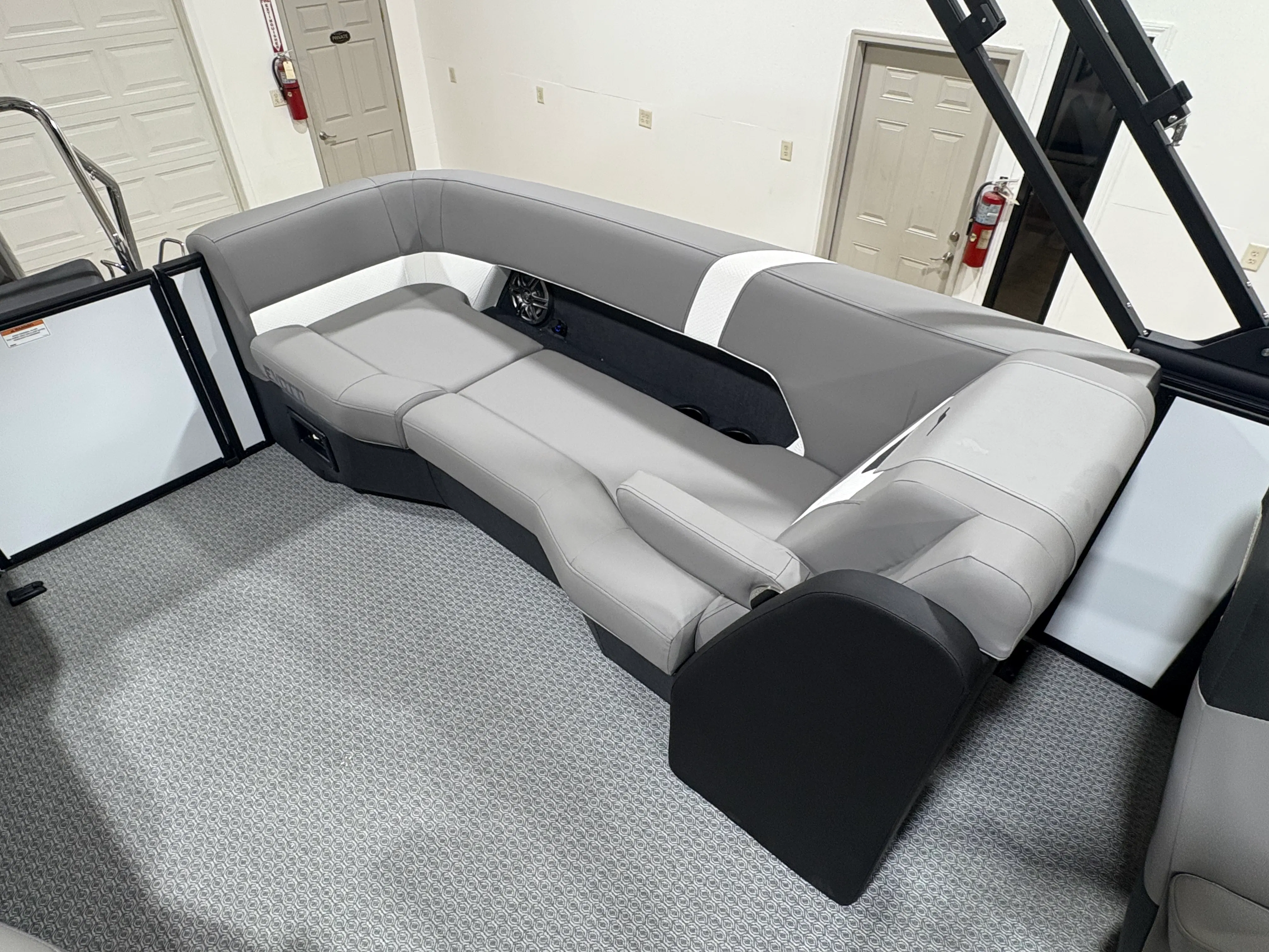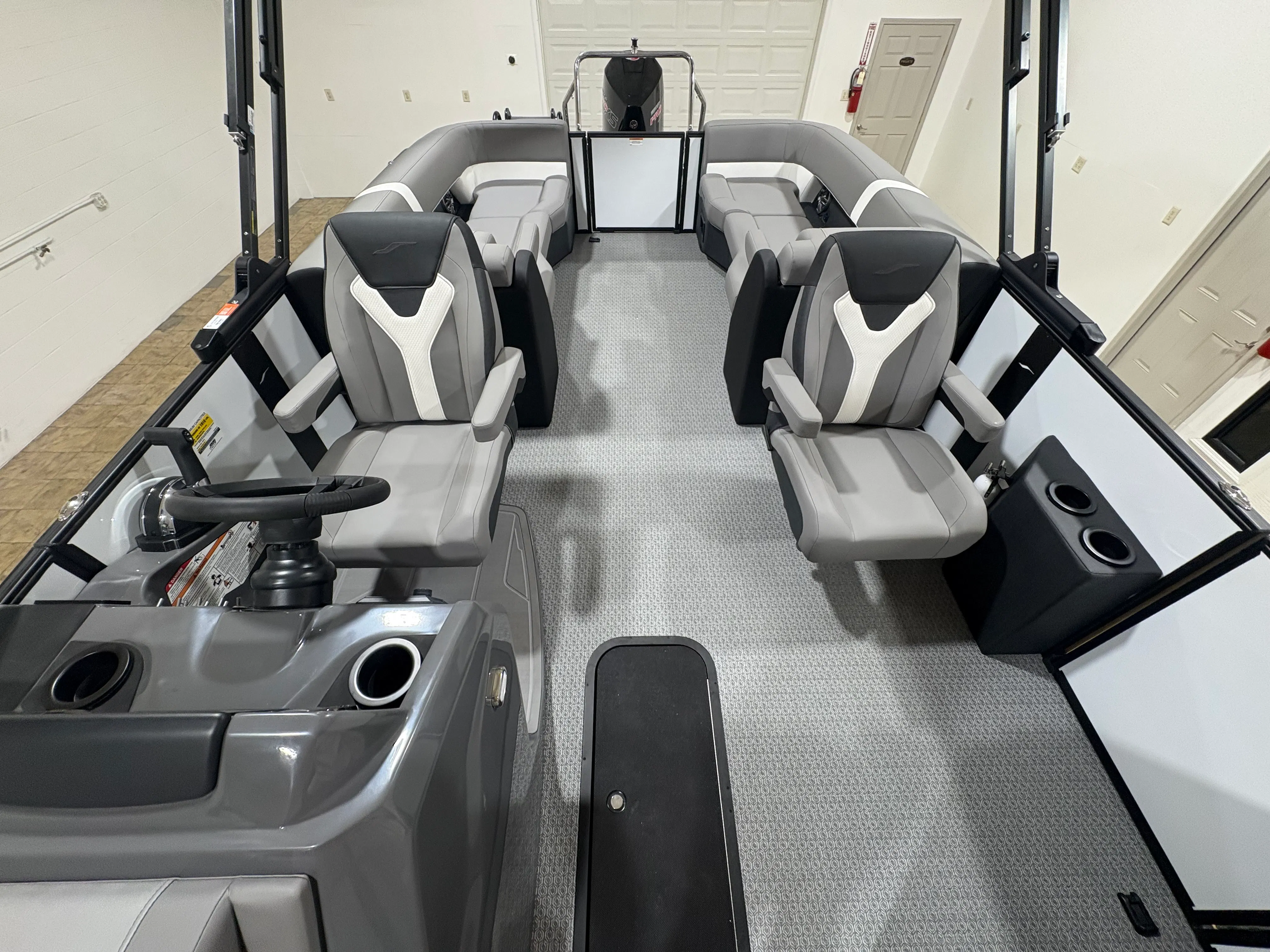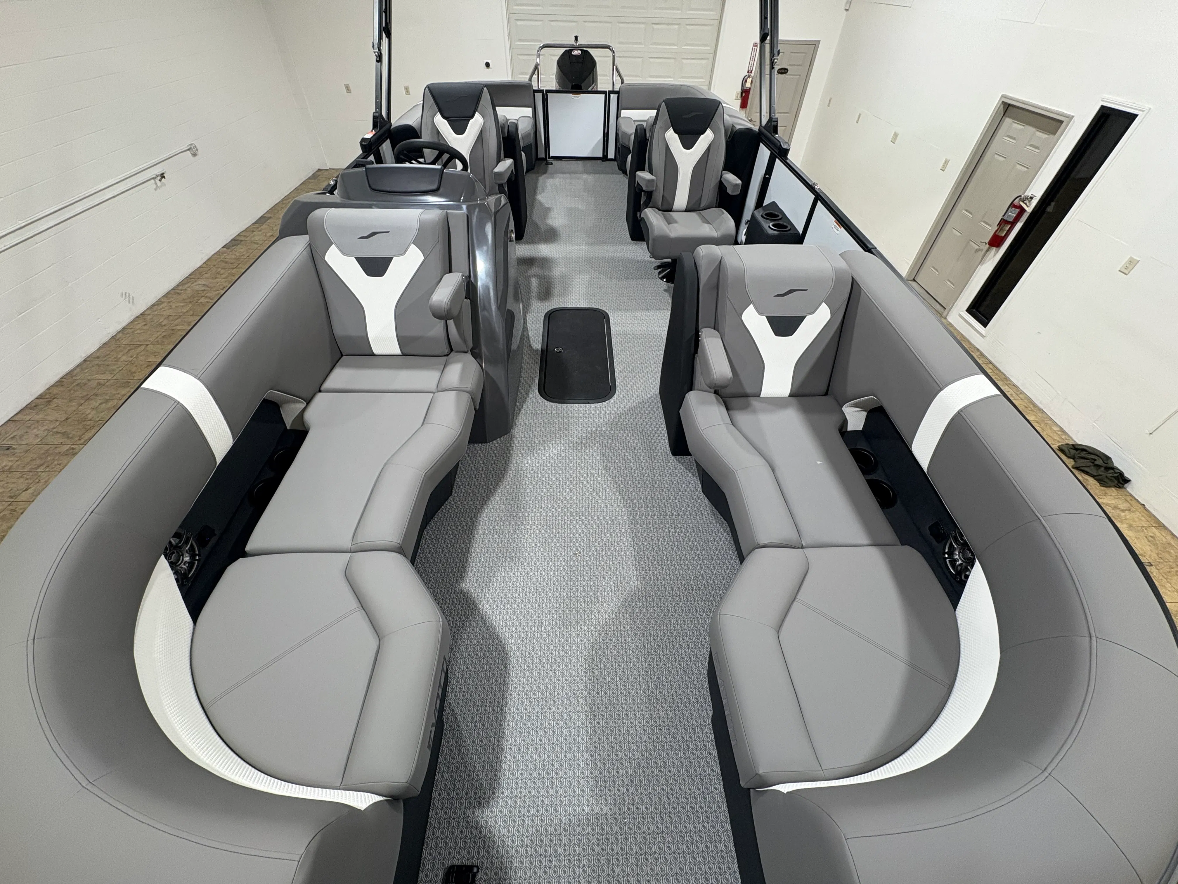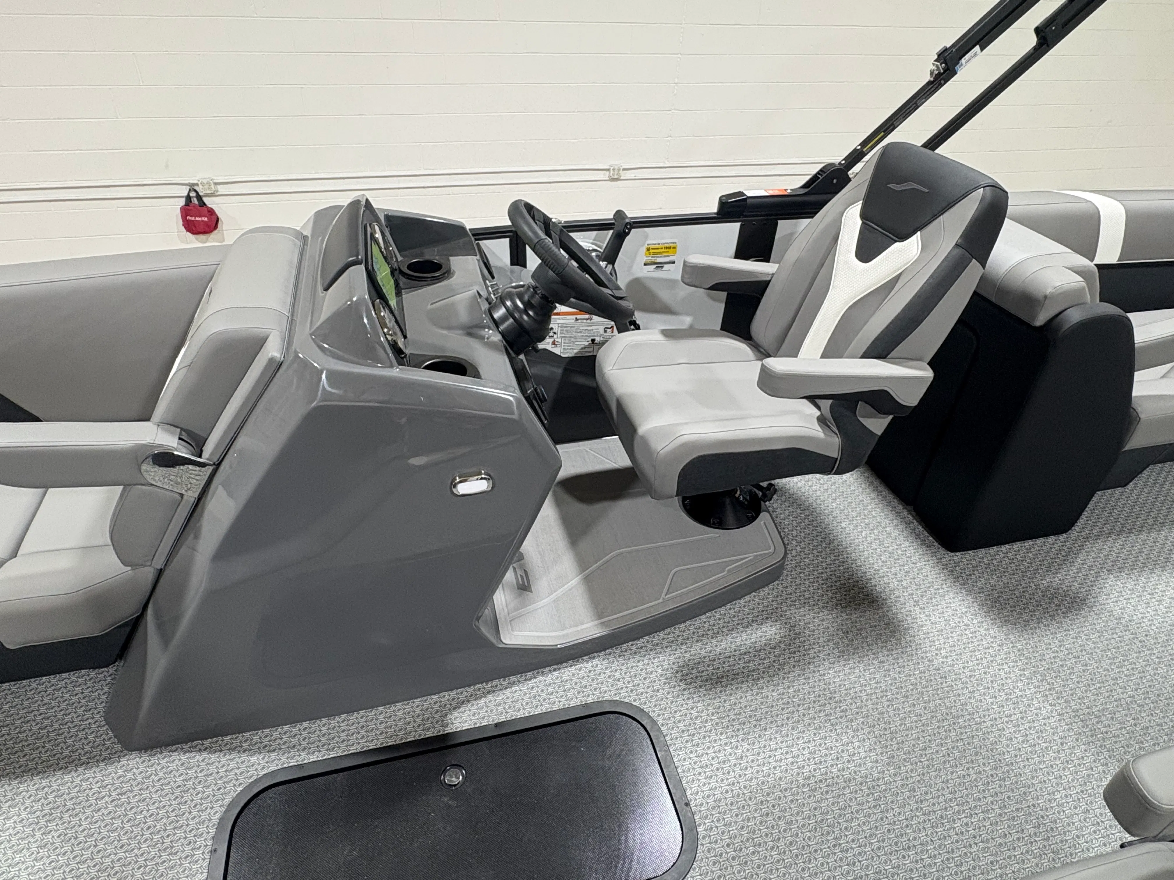 The 2026 Evotti 523 QL is packed with features that enhance both its aesthetic appeal and its functionality. The Base Vinyl Ghost White and Base Vinyl Steel Gray upholstery create a sophisticated and inviting atmosphere, while the Panel Pearl White Gloss and Panel Accent Platinum Blue Satin add a touch of modern elegance. The Steel Gray Evolution Flooring is not only stylish but also durable and easy to maintain, ensuring your pontoon remains pristine trip after trip.For those who appreciate high-quality sound, the Clarion Head Unit & Speakers provide crystal-clear audio, perfect for setting the mood or entertaining guests. Navigating your favorite waterways is a breeze with the Garmin 943 featuring 5" gauges, offering advanced navigation and easy-to-read information at your fingertips. The Canvas Black provides shade and protection from the elements, allowing you to enjoy your time on the water in comfort.