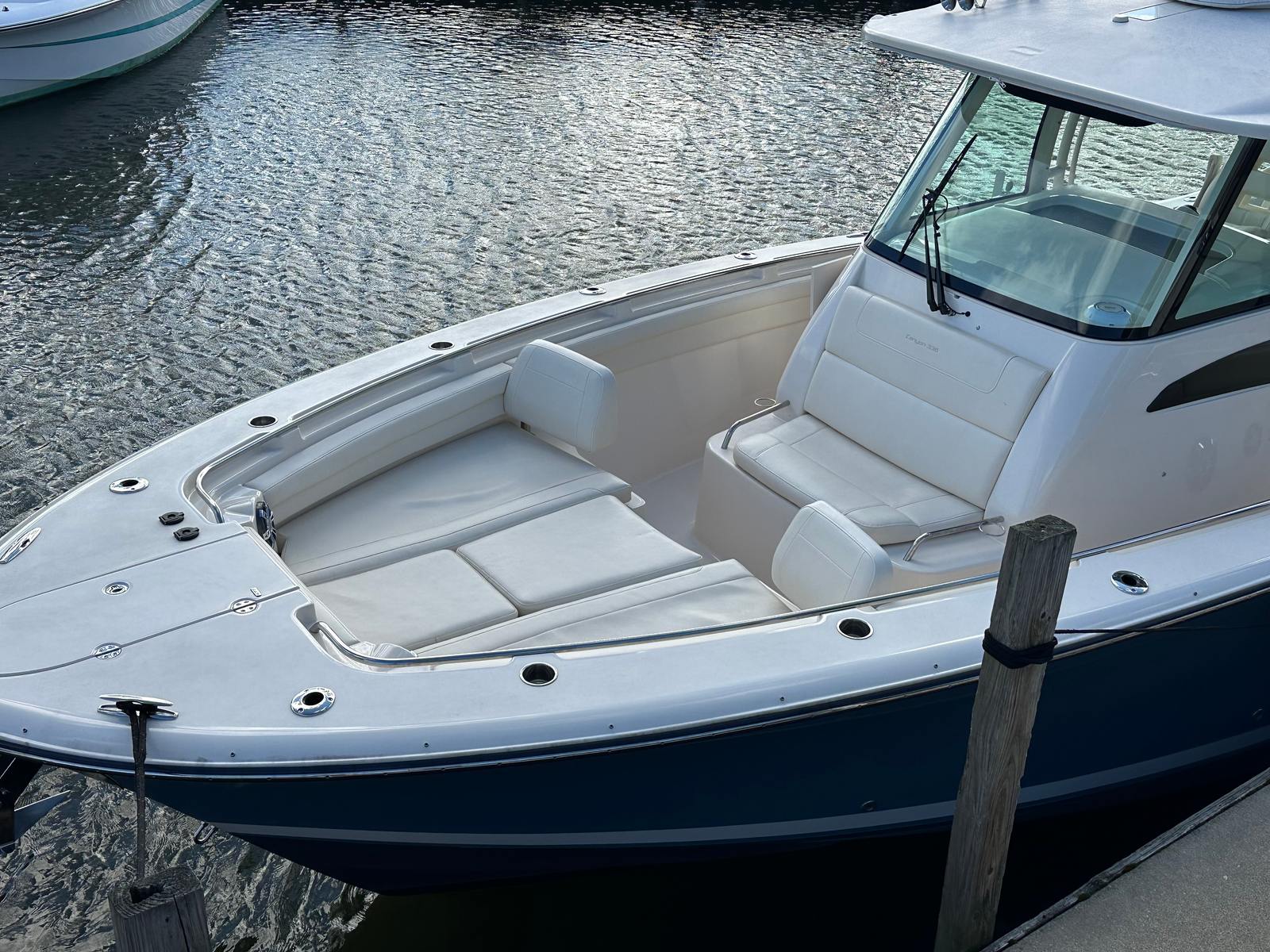 The 2021 Grady-White 336 Canyon is loaded with special features designed to enhance your time on the water. Enjoy the convenience of a battery charger, ensuring your electronics and systems are always powered up for extended trips. The spacious bow seating invites guests to relax and soak up the sun, while the cabin rod holder keeps your fishing gear organized and accessible. Cockpit coaming bolsters provide added comfort during long days of fishing or cruising, and the cockpit grill lets you prepare delicious meals right on board. Ample cockpit storage means you’ll have plenty of room for all your gear, and the cockpit wet bar adds a touch of luxury to your gatherings. Navigate with confidence using the built-in compass and depth sounder, and appreciate the privacy and convenience of an enclosed head for longer journeys.