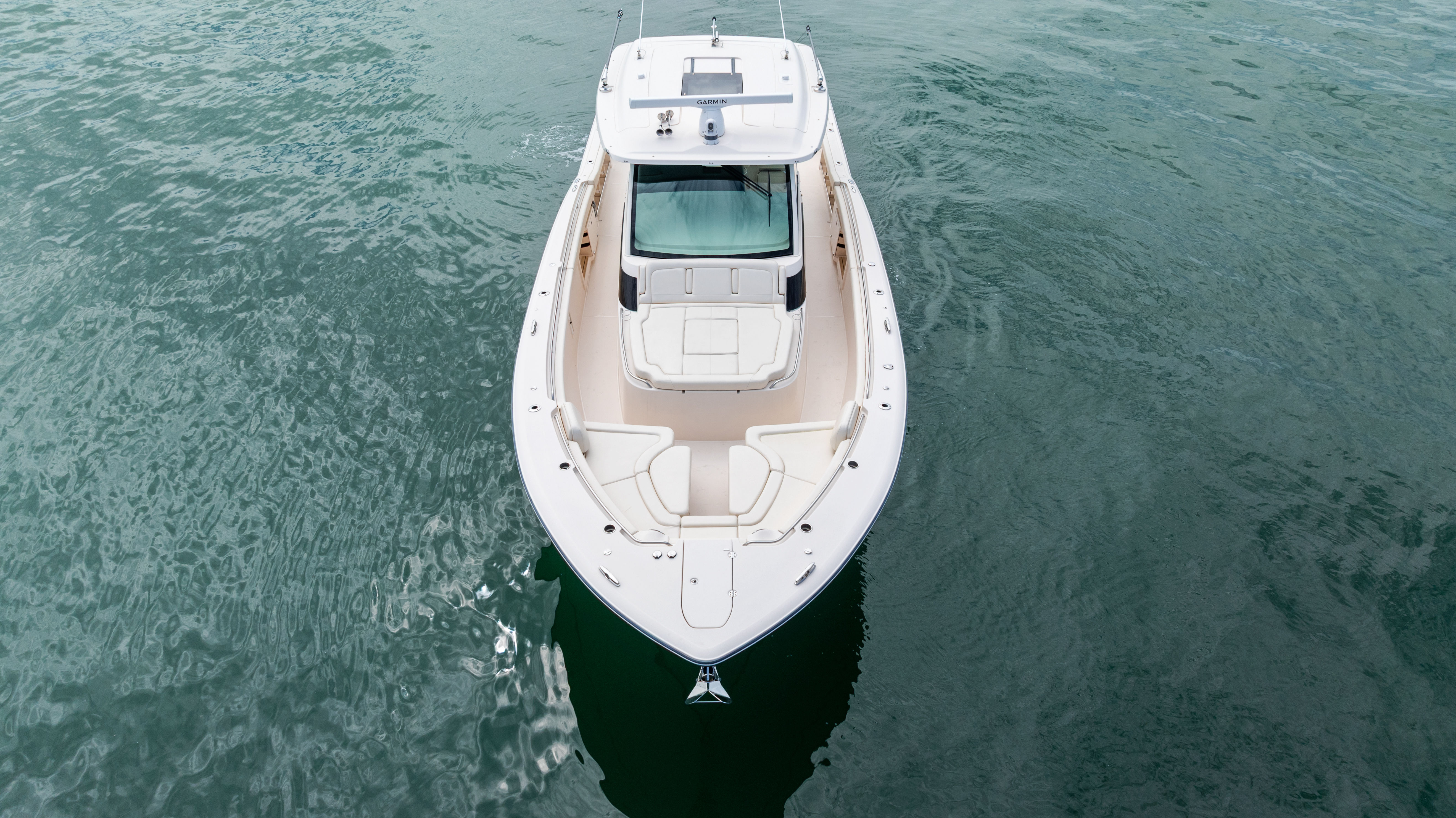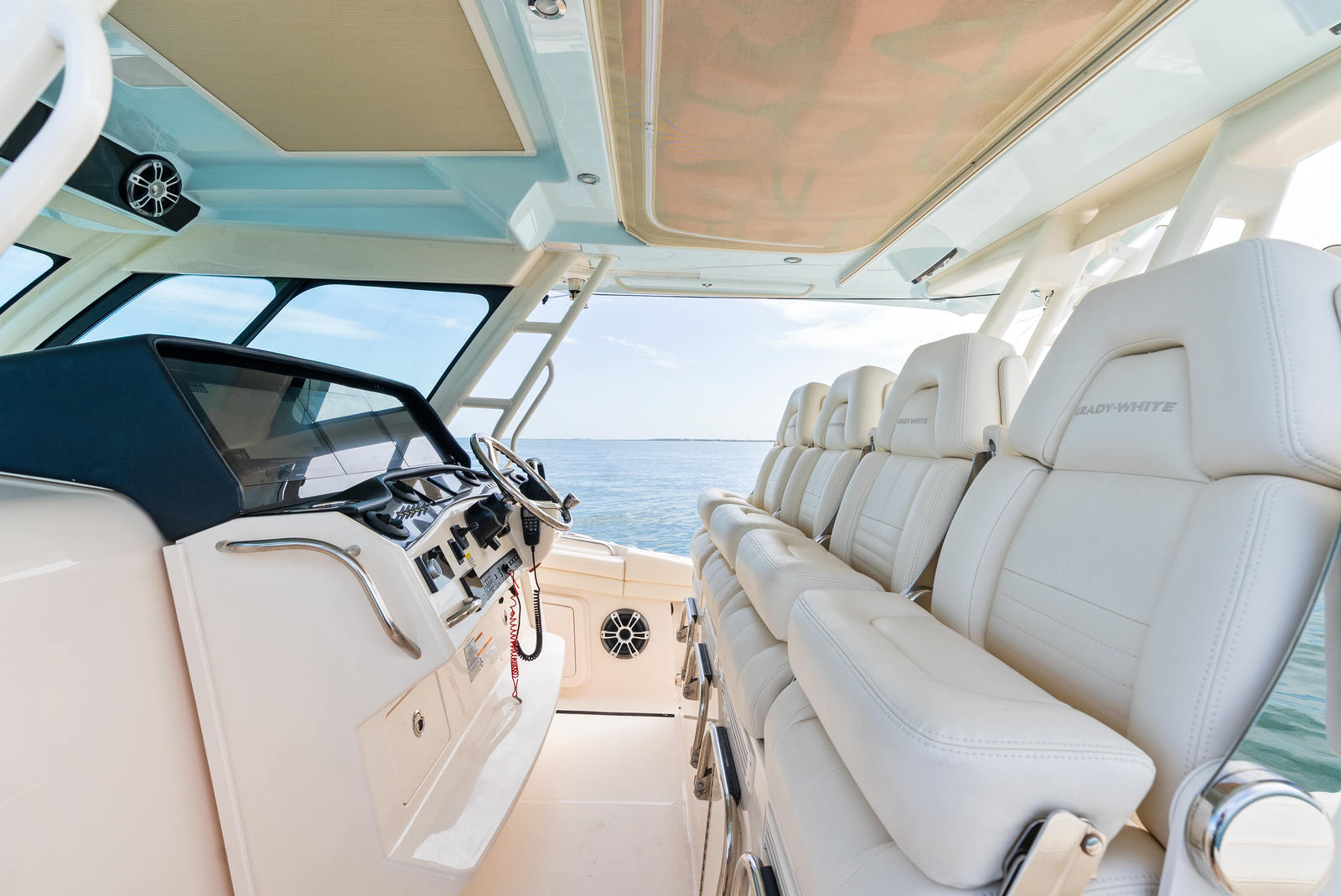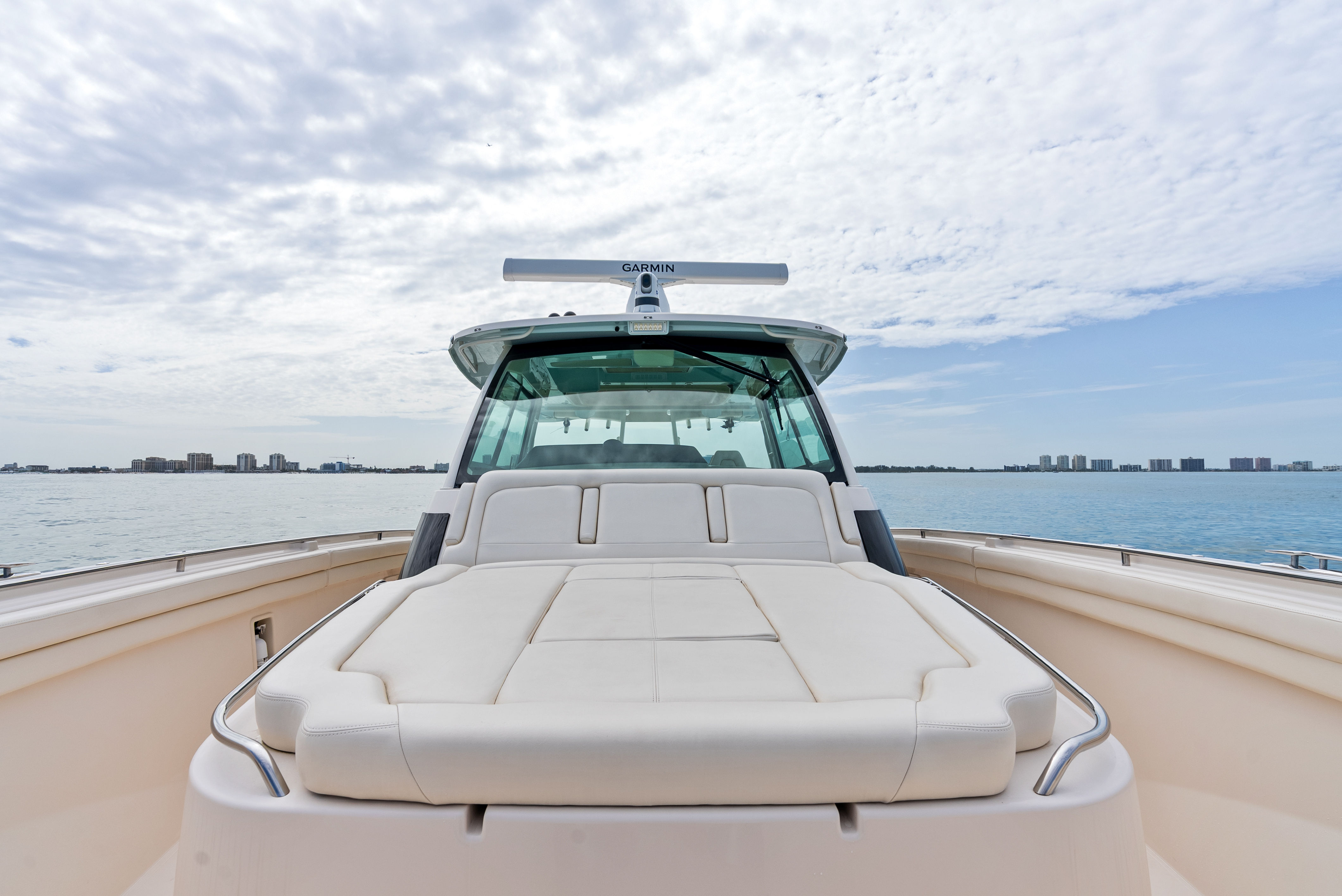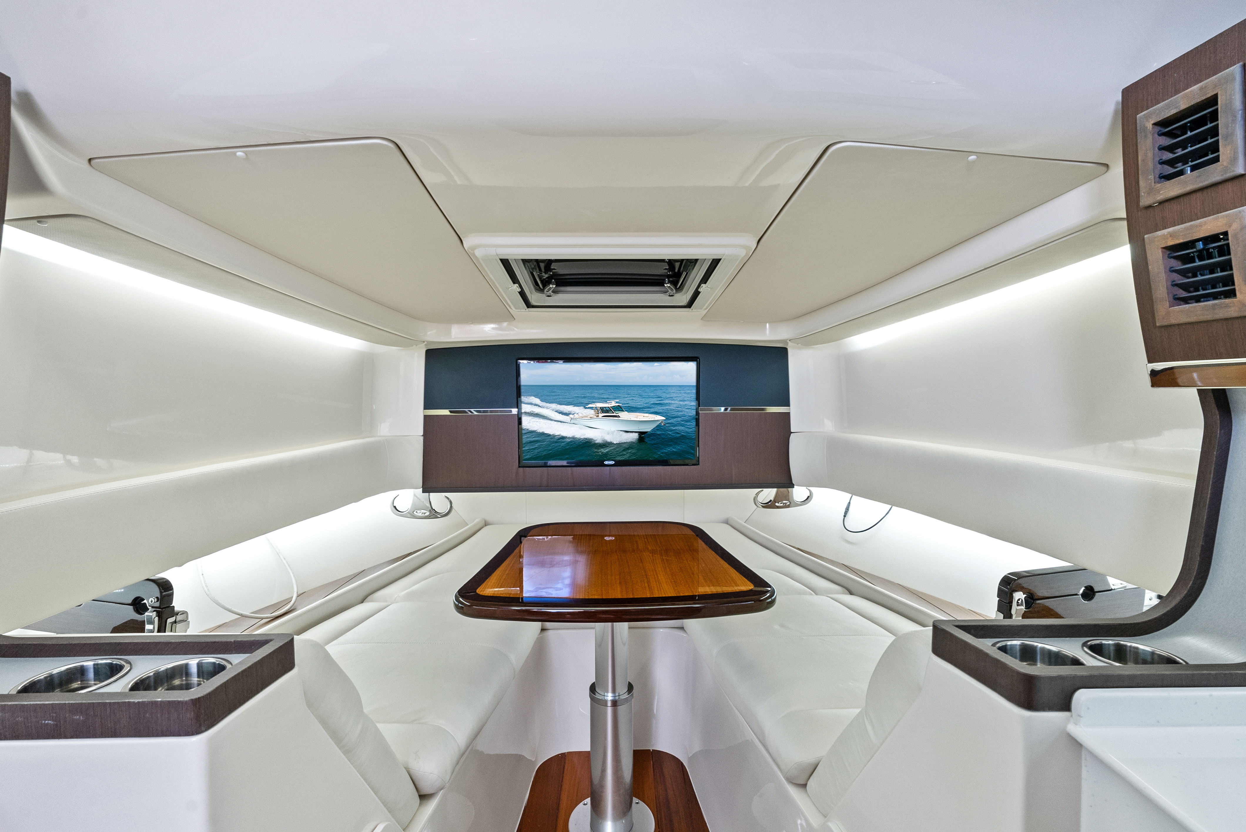Topside, enjoy dual-zone air conditioning, premium seating with fold-away aft bench, an electric bow table, and an integrated retractable cockpit shade for ultimate comfort while entertaining or relaxing.