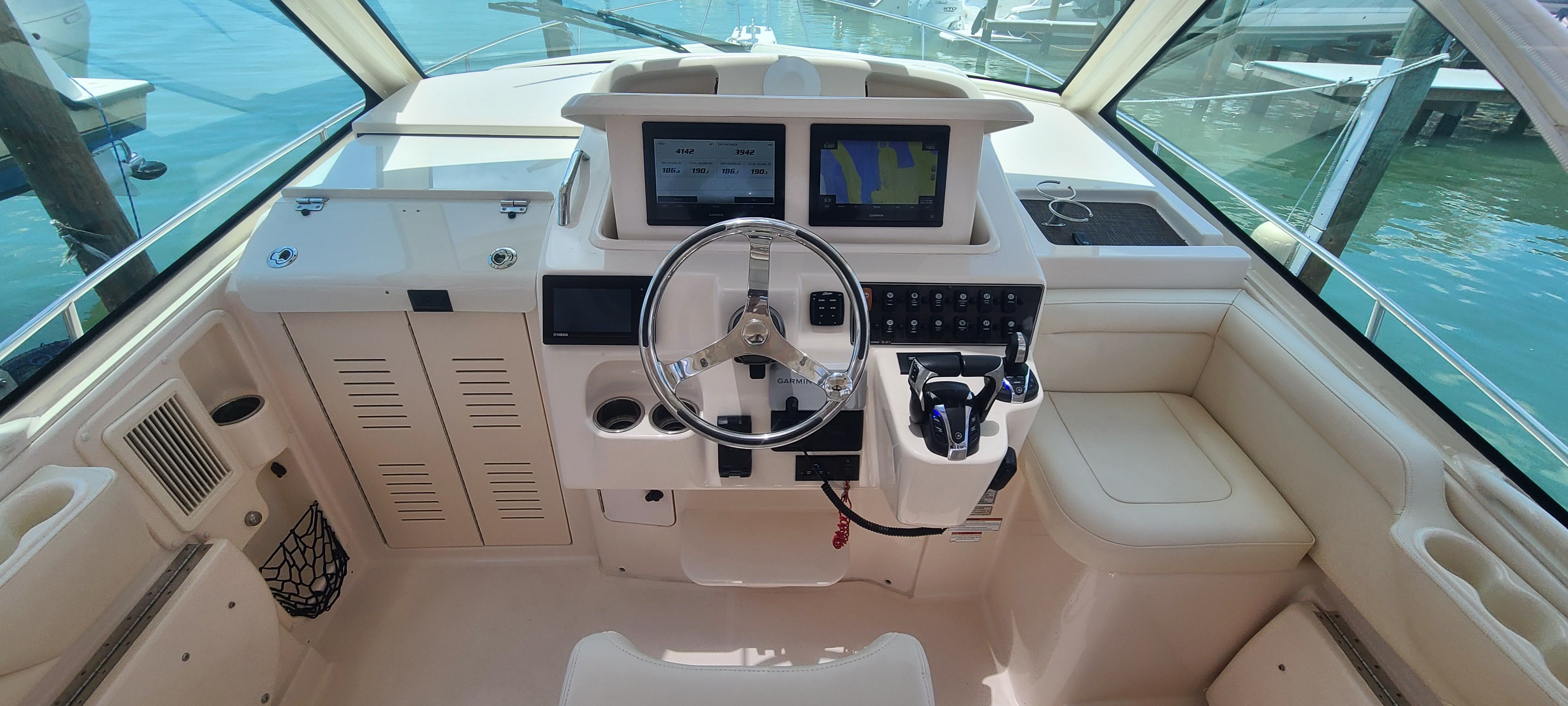 Powered by twin engines delivering a combined 850 horsepower, the Grady-White Express 330 offers exhilarating performance and responsive handling. The dual-engine setup ensures smooth acceleration, impressive top speeds, and enhanced maneuverability, whether you’re navigating tight marinas or heading out to your favorite fishing spot. With only 195 engine hours, these motors promise years of dependable service, giving you confidence every time you set out on the water. The Express 330’s advanced hull design further contributes to a stable, dry ride, even in choppy conditions, making it a standout among fishing boats for sale.