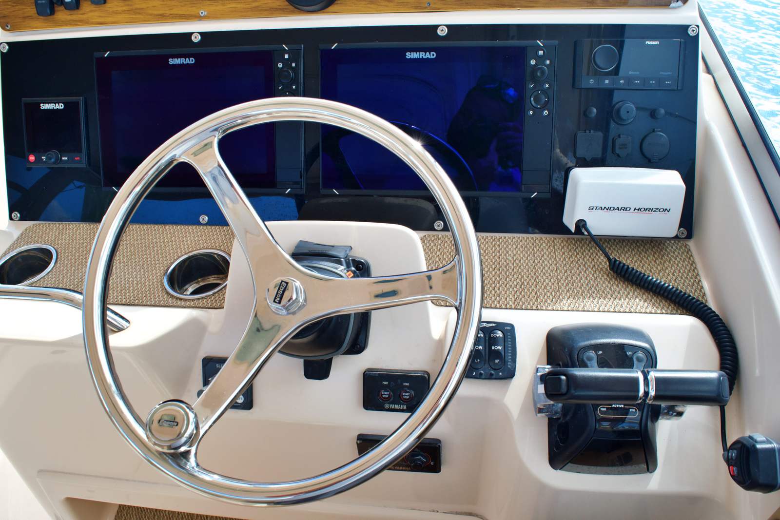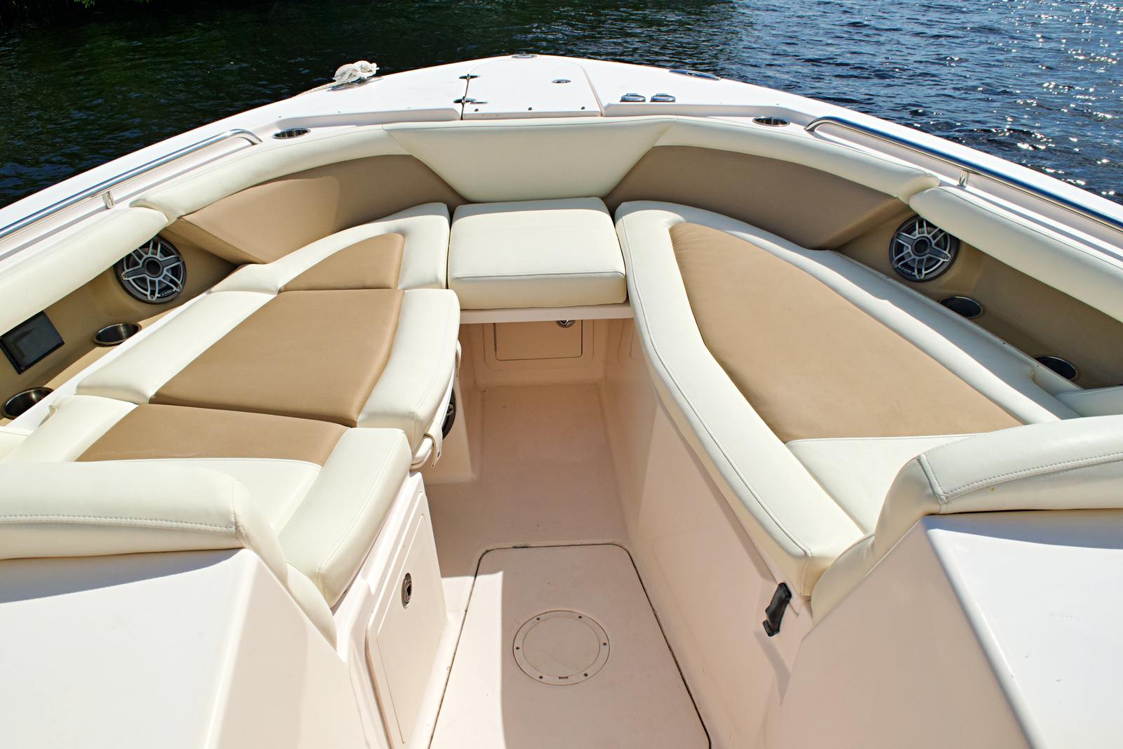 The Grady-White 335 Freedom is as practical as it is enjoyable. Its thoughtful design includes ample storage for gear, water toys, and personal items, keeping the deck clutter-free and organized. The dual console layout makes docking and maneuvering easier while using the joy-stick controlled bow thruster giving you confidence in tight marinas or when approaching the dock after a day on the water. Fuel efficiency is another highlight, thanks to the advanced engineering of the twin Yamaha engines. You can spend more time exploring and less time refueling, making every outing more enjoyable. The boat’s robust construction and quality materials ensure durability and low maintenance, so you can focus on making the most of your time on the water.
