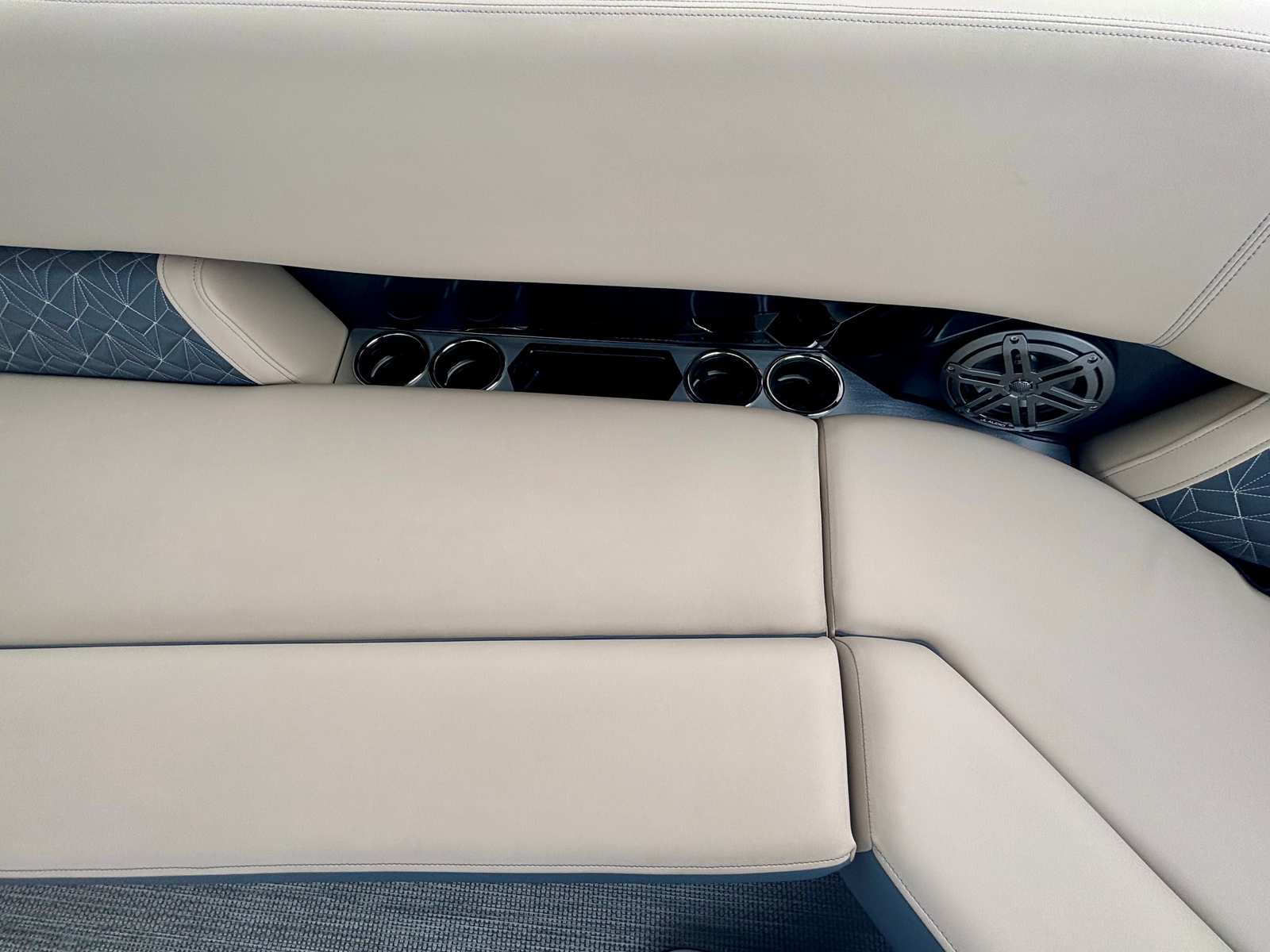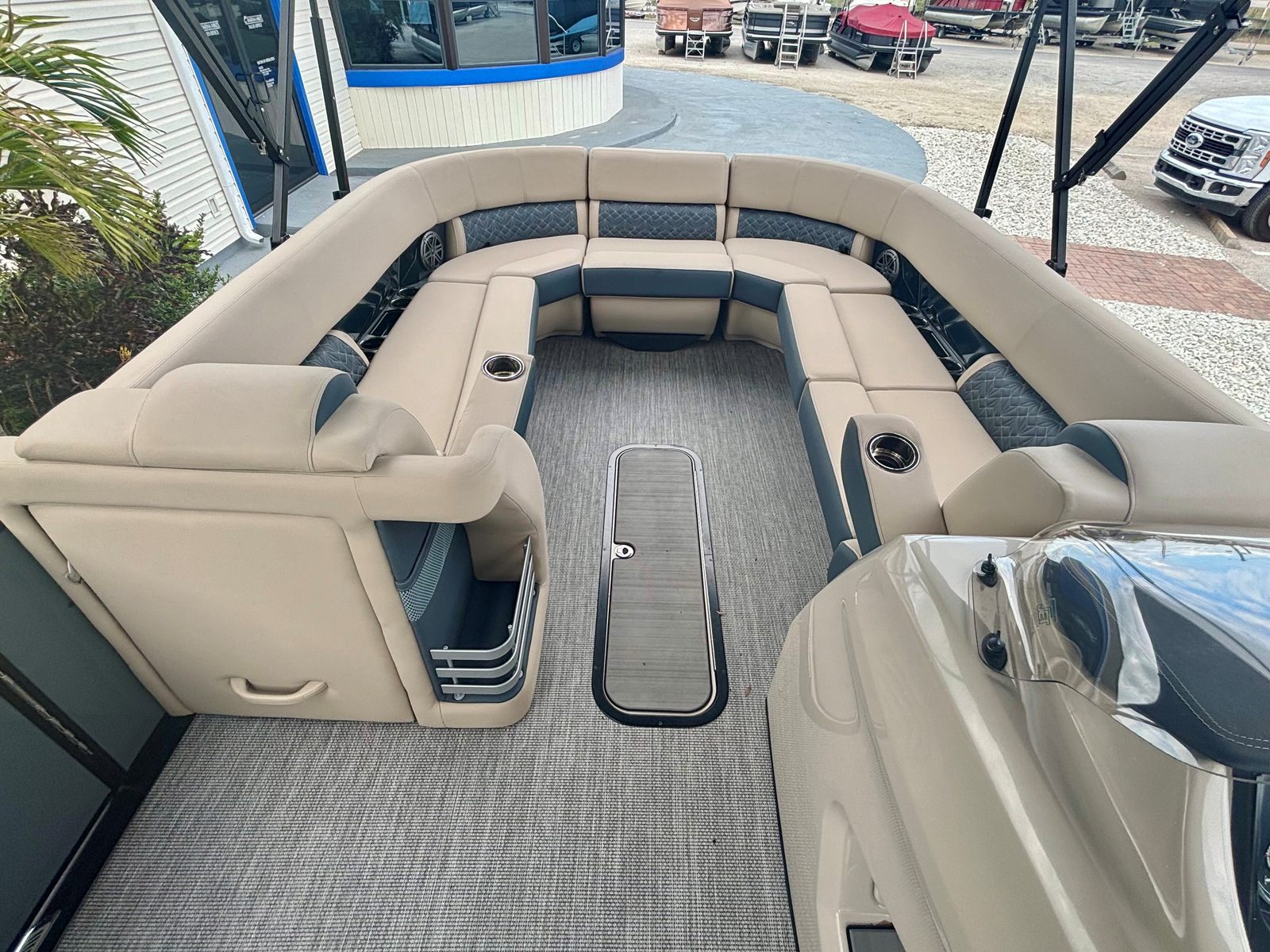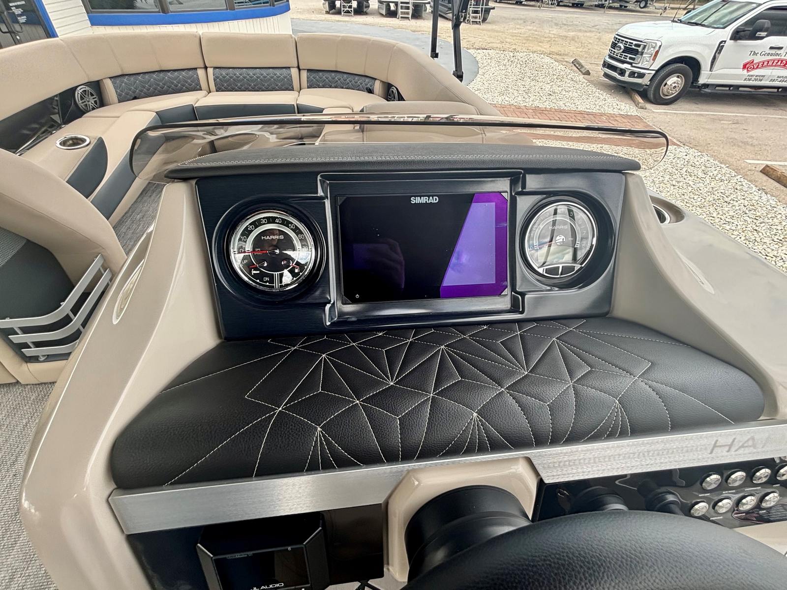 This Harris pontoon boat is packed with premium features designed to maximize comfort, convenience, and enjoyment. The JL Zone Control system, complete with eight JL speakers, delivers immersive audio throughout the vessel, perfect for setting the mood or entertaining guests. The interior light package, featuring C-Zone RGB cup and seat lighting, creates a vibrant and customizable ambiance for evening cruises or celebrations. Mooring eyes at midship provide secure docking options, while the four-step telescoping SST ladder at the stern ensures easy access to and from the water. The raised helm offers superior visibility and control, enhancing the captain’s experience. Additional highlights include the American flag (dealer install), hydraulic hose with Verado power assist, and the full Moonlit Shoreline flooring, which adds both style and durability to the deck.