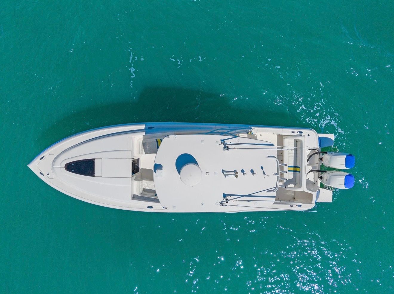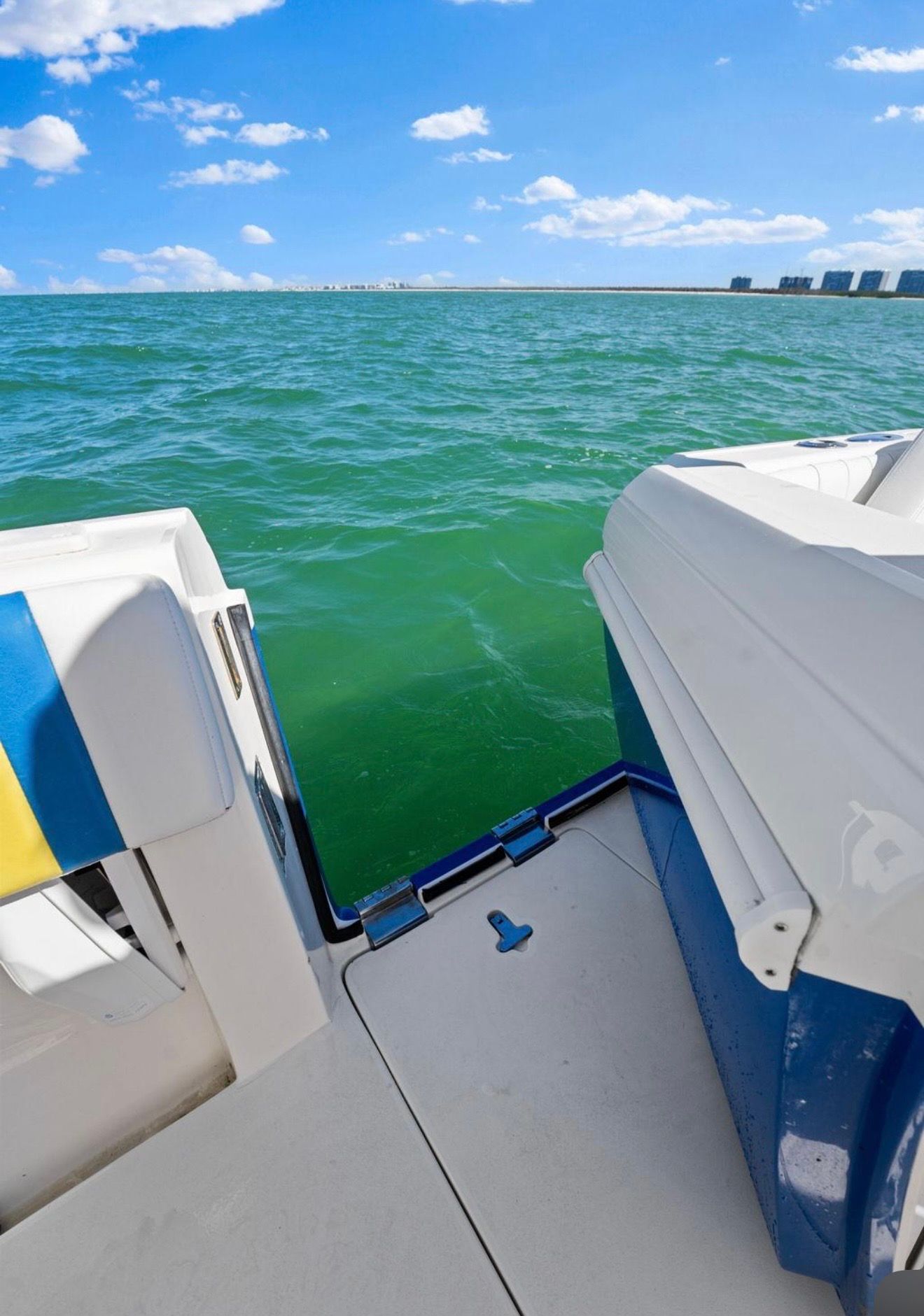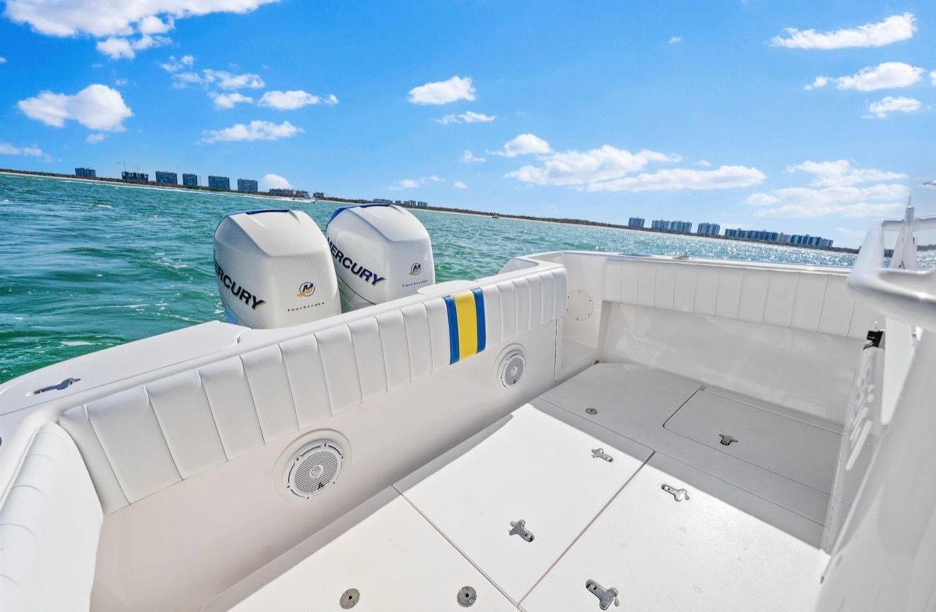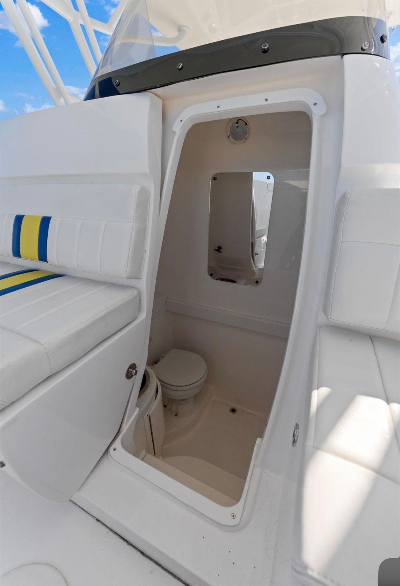 Forward of the helm console (with sliding door) is access to a tall head/bath area complete with an electric head, sink and shower. Forward is a handy cuddy cabin for napping/overnighting and storage for all your guests! It is complete with V-seating and an insert for berth conversion. Aft and to starboard is a manual dive-door making it easier and safer to get in and out of the water, as well as a transom door to port with a swim ladder. Fishing enthusiasts will find 4 rod-holders behind the helm seat and 2 deck rod-holders aft. Collapsible outriggers are on a CUSTOM over-sized hardtop for extra shade. Port and starboard fish boxes (with macerator pumps) are located in the aft deck and a live baitwell is to starboard on the transom. No nonsense non-skid makes it easy to keep her decks clean and tidy. Additionally, she is easily trailer-able (no trailer included).