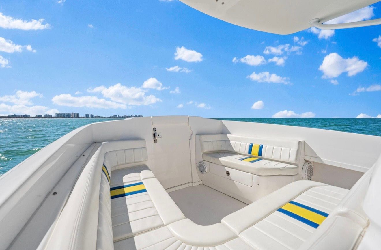Seats 10 comfortably including transom (custom seat), helm and forward seating