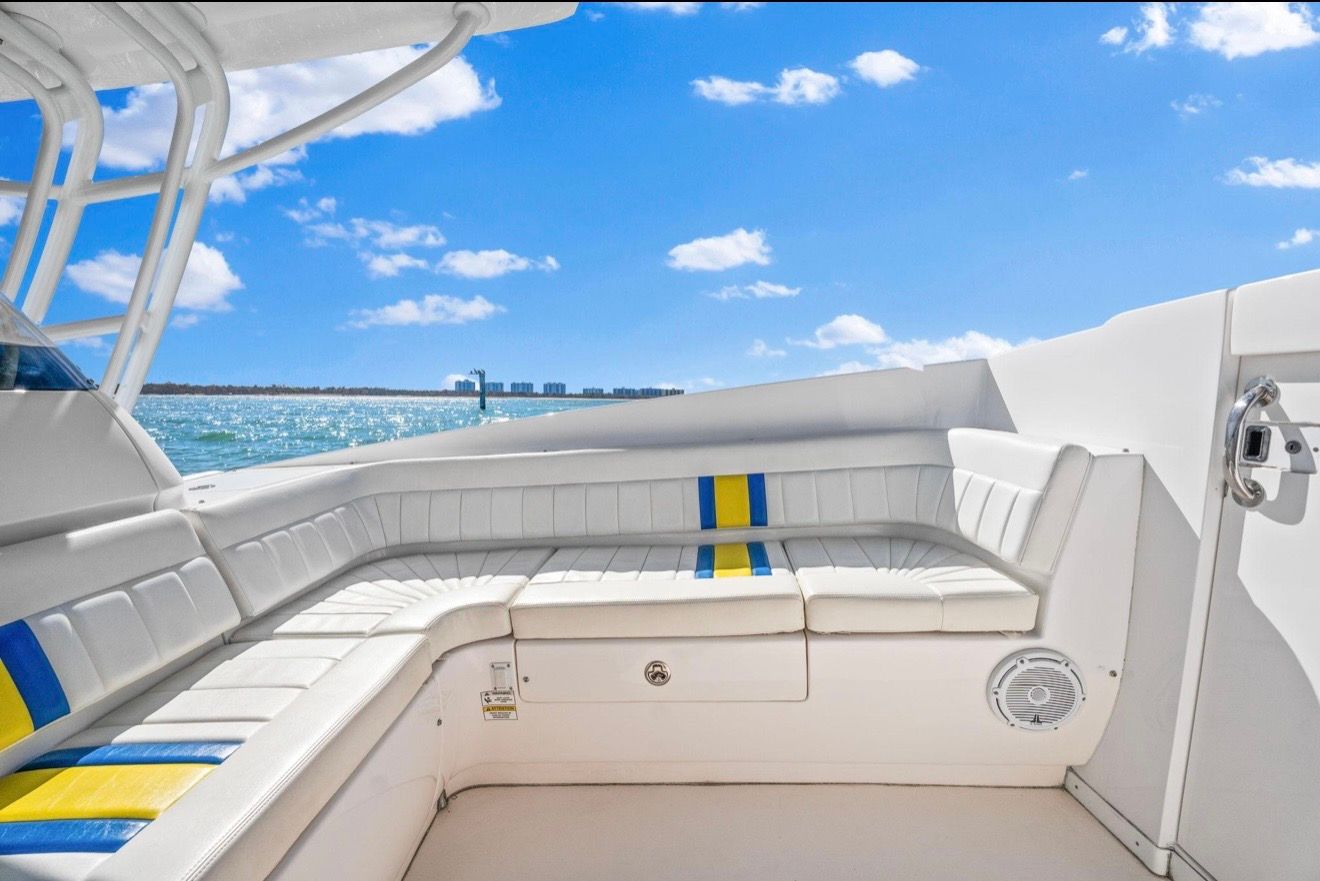 She seats 12 via a custom bench seat at the transom, a helm seat (with rocket launchers), a handy portside/aft-facing single seat, expansive L-shaped seating to port and forward of the helm – with an opposing bench seat to starboard.... as well as storage beneath.