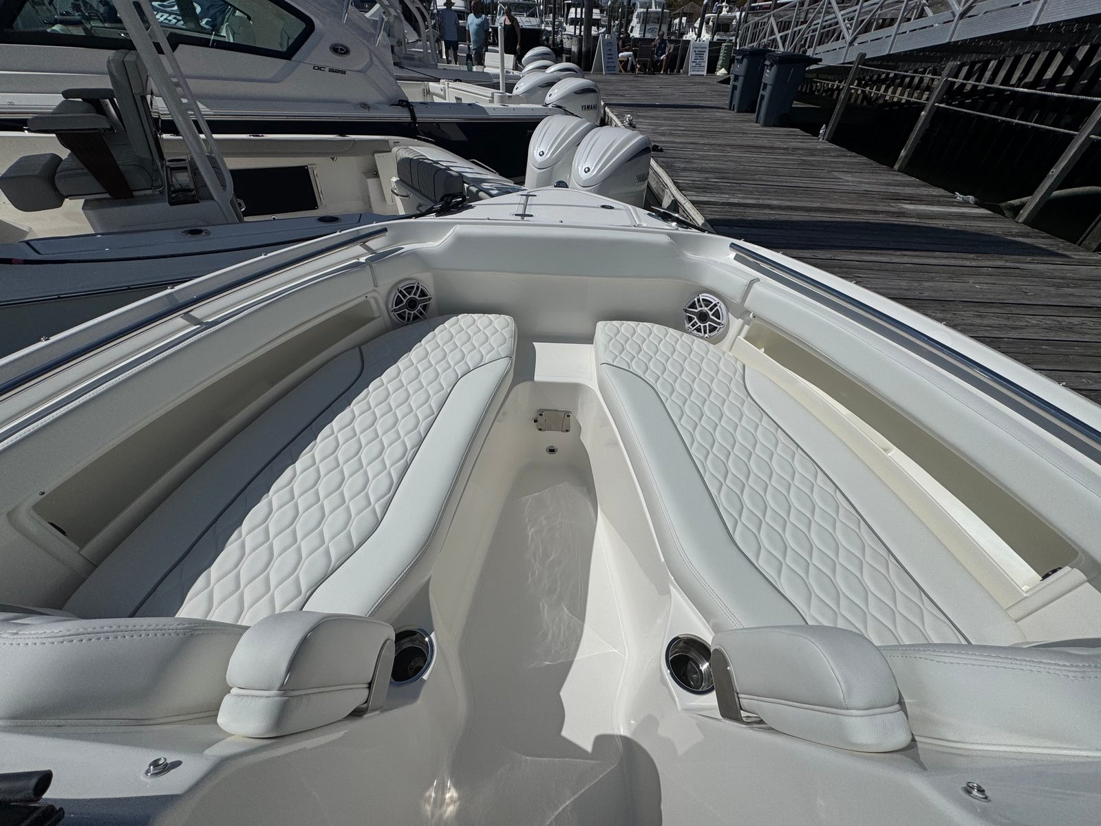 Powering the DC 266 are twin Yamaha® Digital F200 engines in Pearlescent White, delivering a combined 400 horsepower. These engines are equipped with Digital Electronic Steering (DES) and Helm Master® EX Digital Electronic Control (DEC), providing smooth, precise handling and effortless maneuverability. While joystick control is not included, the advanced electronic systems ensure that docking and navigating tight spaces are easier than ever. The robust engine setup guarantees exhilarating acceleration, reliable cruising speeds, and the confidence to tackle a variety of water conditions.