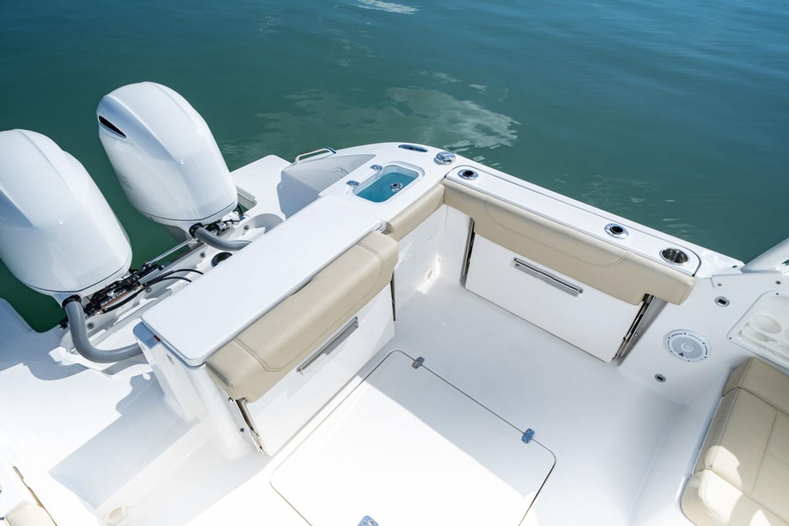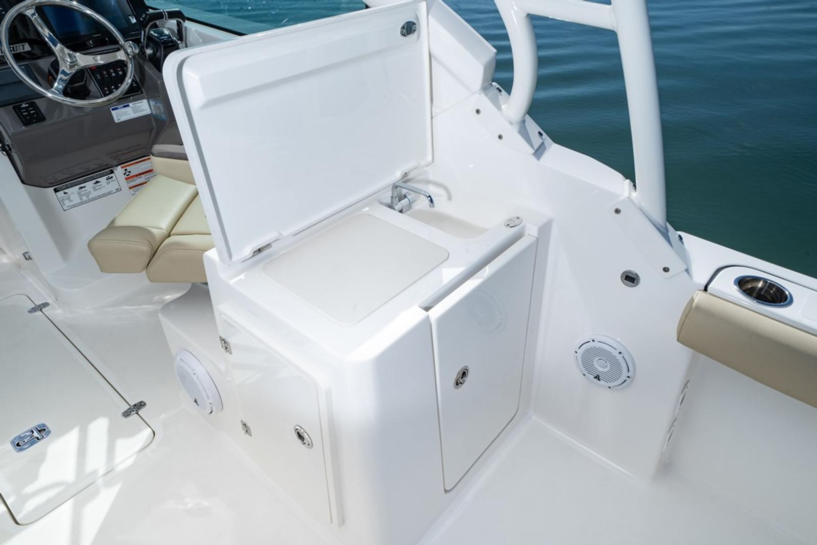 This dual console boat for sale is as practical as it is luxurious. The ample storage options ensure you have plenty of space for gear, water toys, and personal items, keeping the deck clutter-free and organized. The efficient twin Yamaha engines offer impressive fuel economy for their class, so you can spend more time on the water and less time at the fuel dock. Docking and maneuvering are a breeze thanks to the advanced joystick control and electronic steering, making the DC 266 an excellent choice for boaters of all experience levels.The stowable sunshades and versatile seating configurations allow you to quickly adapt the boat to your needs, whether you’re seeking shade, sun, or extra space for guests. The hardtop-mounted rod holders keep your fishing gear secure and ready for action, while the LED accent lighting adds a touch of elegance and safety during evening outings.
