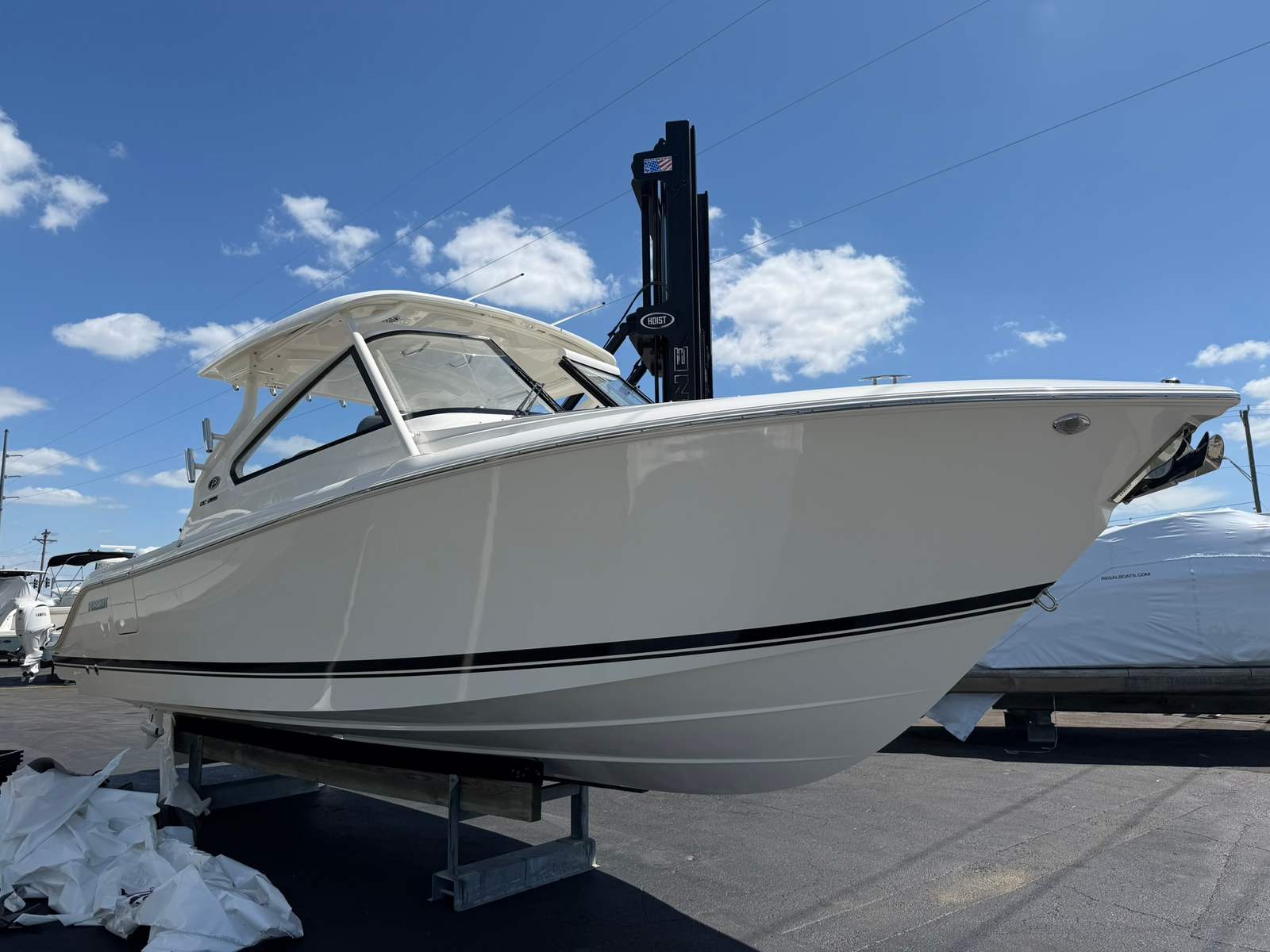 The Pursuit DC 286 is loaded with premium features that enhance both functionality and enjoyment. The twin Yamaha F300 engines provide robust power, while the Yamaha Joystick Control ensures intuitive handling and full maneuverability, making every trip smooth and enjoyable. The hull’s fresh white color, paired with a striking black bootstripe and accent, gives the boat a timeless yet contemporary look. The carbon helm is both stylish and ergonomic, offering excellent visibility and control.Inside, the Sea Salt interior color scheme creates a relaxing and upscale environment, perfect for unwinding with family and friends. The 120V/60Hz 30 Amp dockside power with ELCI protection and shore cord ensures you have reliable power for all your onboard needs, whether you are at the dock or anchored in your favorite cove. For those who love to enjoy the water after sunset, the three all-color Sea Blaze Quattro Spectrum underwater lights add a magical ambiance, illuminating the water in vibrant hues.Music lovers will appreciate the premium stereo upgrade, delivering crystal-clear sound throughout the boat, setting the perfect mood for any occasion. The bow sun pad filler cushion, with dedicated storage, offers a comfortable spot to soak up the sun or relax with a good book, adding to the boat’s versatility and comfort.