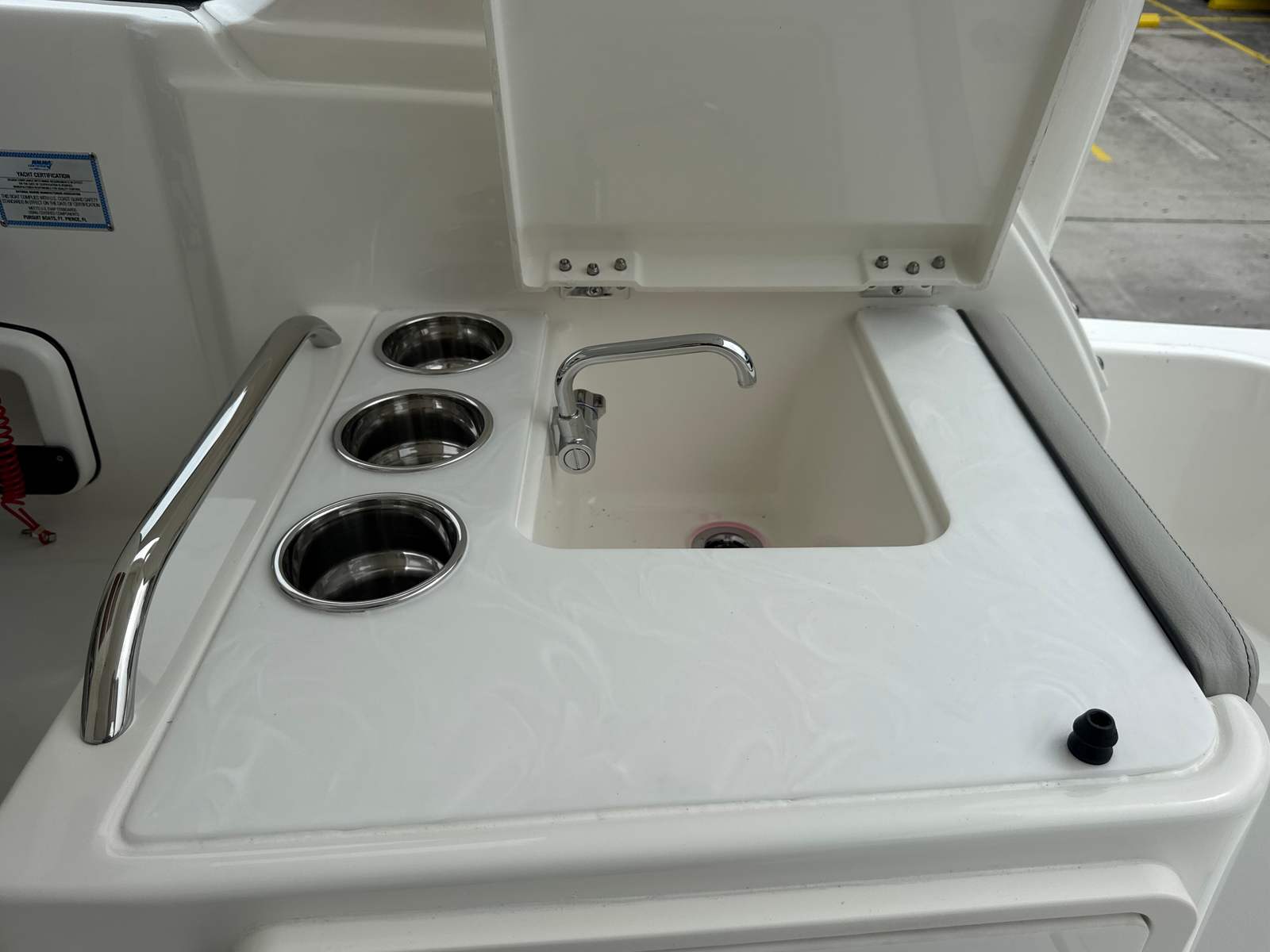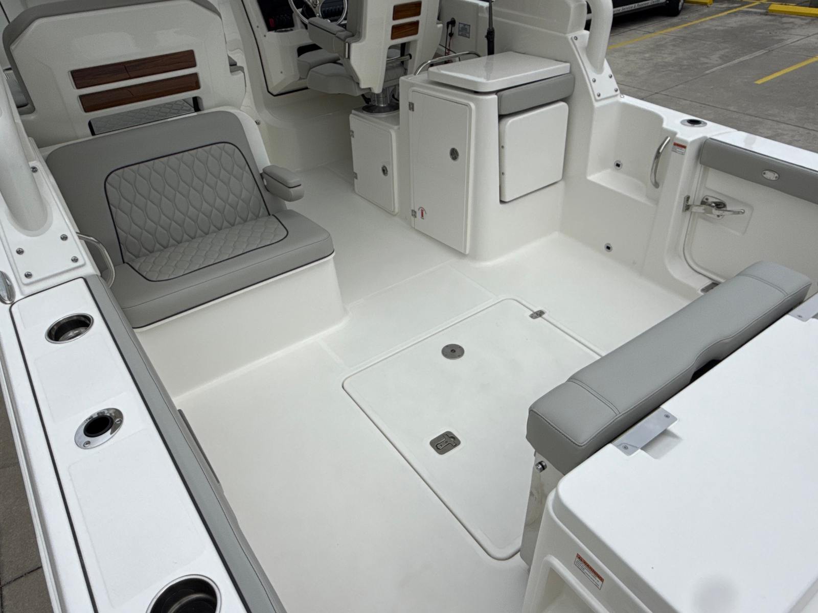 Beyond its impressive style and performance, the Pursuit DC 286 is designed with practical boating needs in mind. The 30-foot length strikes an ideal balance between spaciousness and maneuverability, making it easy to handle in a variety of settings. The Yamaha Joystick Control system simplifies docking, allowing even less experienced boaters to approach slips and docks with confidence.The dedicated storage solutions, such as the bow sun pad filler cushion compartment, help keep the deck organized and clutter-free. The stainless steel refrigerator/freezer is perfect for storing drinks and snacks, ensuring you are always prepared for a day on the water. The 30 Amp dockside power with ELCI protection provides peace of mind, knowing your electrical systems are safeguarded and reliable.