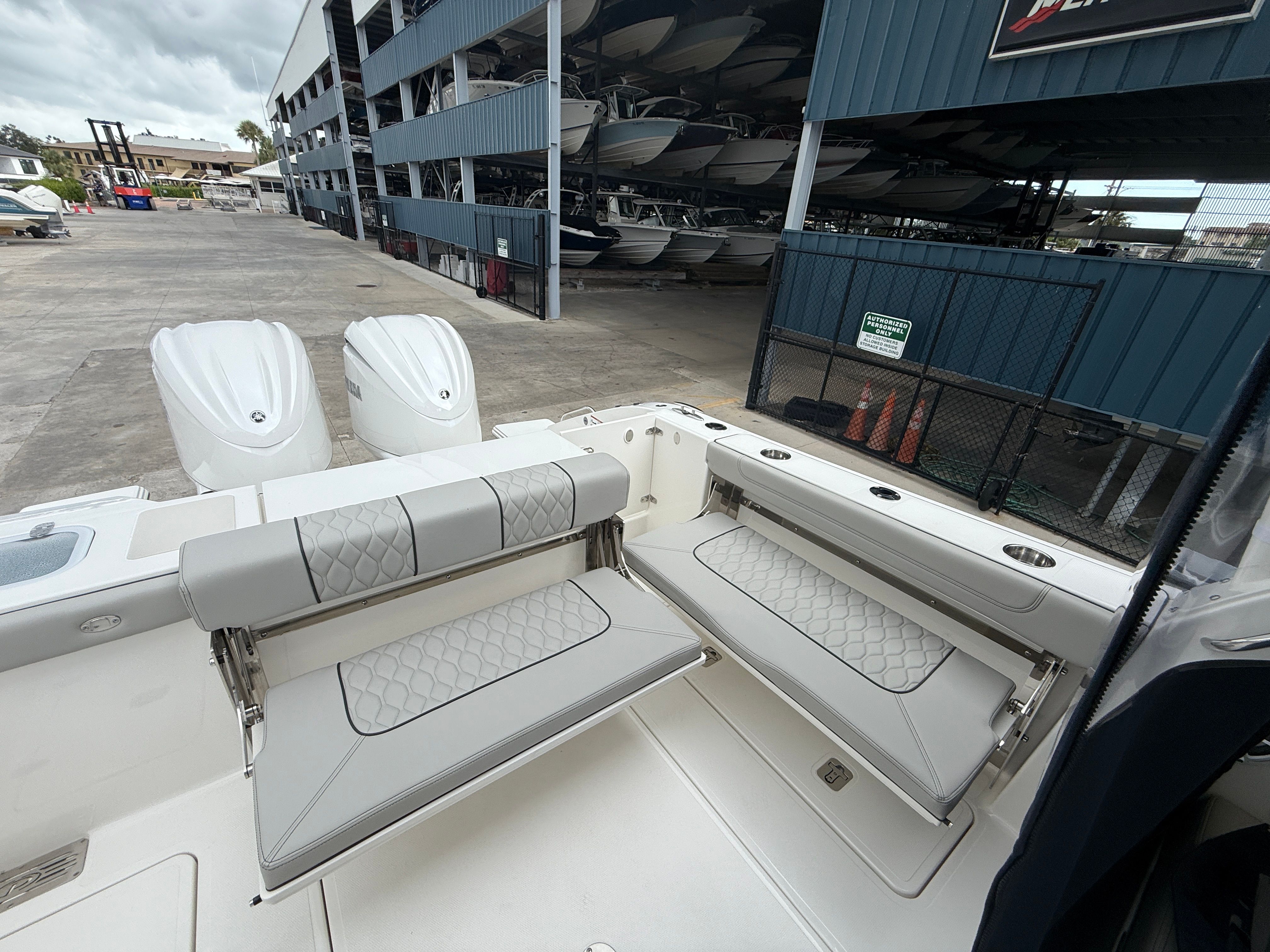 The Pursuit DC 306 is loaded with premium features designed to maximize comfort, convenience, and enjoyment. The Arctic Blue hull color not only adds visual appeal but also reflects Pursuit’s attention to detail. The hardtop is equipped with port and starboard Bomar hatches with screens, allowing for excellent ventilation while keeping the cabin protected from the elements. For those sunny days on the water, the aft Med style sunshade by Suntex is stowable, providing flexible shade options to suit your needs.Dockside power is made simple with the 110V/60HZ system and integrated battery charger, ensuring your electronics and amenities stay powered throughout your adventures. The blue drop curtain and blue side curtains offer additional protection from wind and spray, while the blue twin engine covers keep your engines shielded when not in use. The helm and footrest feature a sophisticated carbon color, adding a touch of modern elegance to the cockpit.