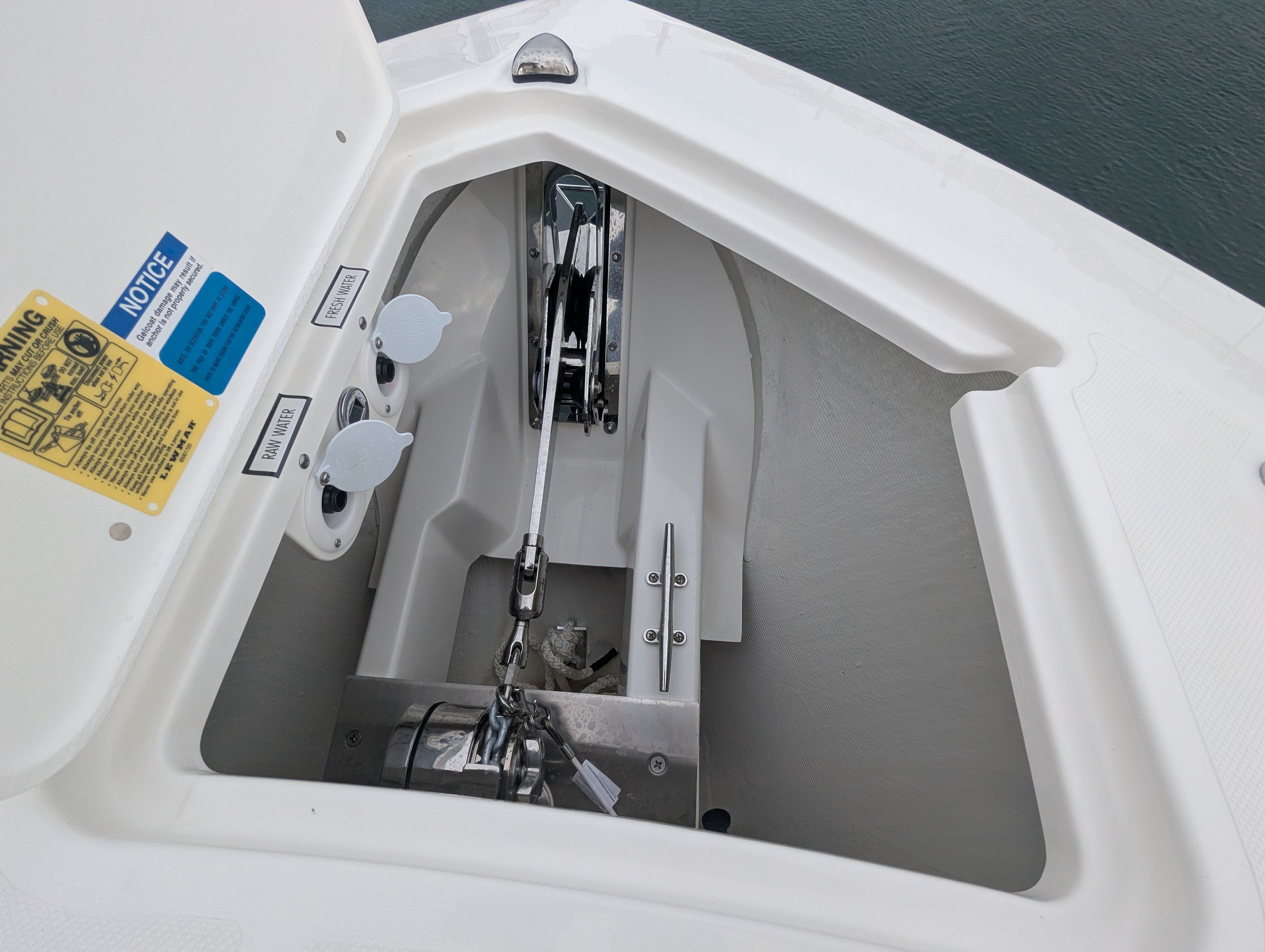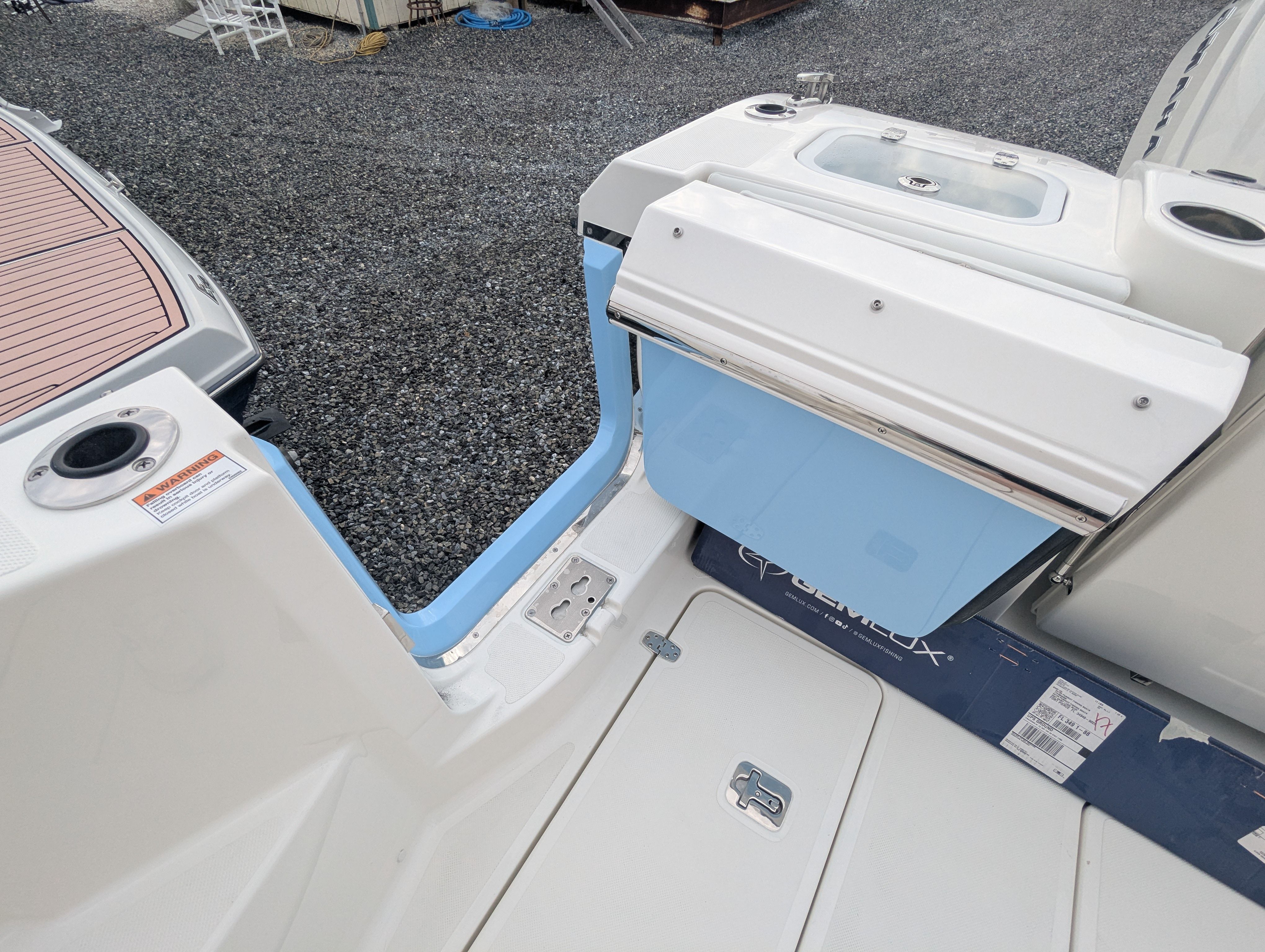 The Pursuit DC 326 is loaded with premium features designed to enhance every aspect of your boating experience. The hardtop-mounted rod holders (six in total) and Gemlux Deluxe 18’ Hybrid carbon fiber outrigger poles with a double rigging kit make this boat a dream for serious anglers. Whether you’re trolling for big game or enjoying a leisurely day of fishing, these features provide the flexibility and convenience you need. The ACR RCL-100 LED spotlight, with remote control at the helm, ensures clear visibility during nighttime excursions, adding an extra layer of safety and confidence. The helm, finished in Carbon, is both stylish and functional, offering a commanding view and easy access to all controls. The upgraded upholstery in white and gray not only looks fantastic but also provides superior comfort for you and your guests.