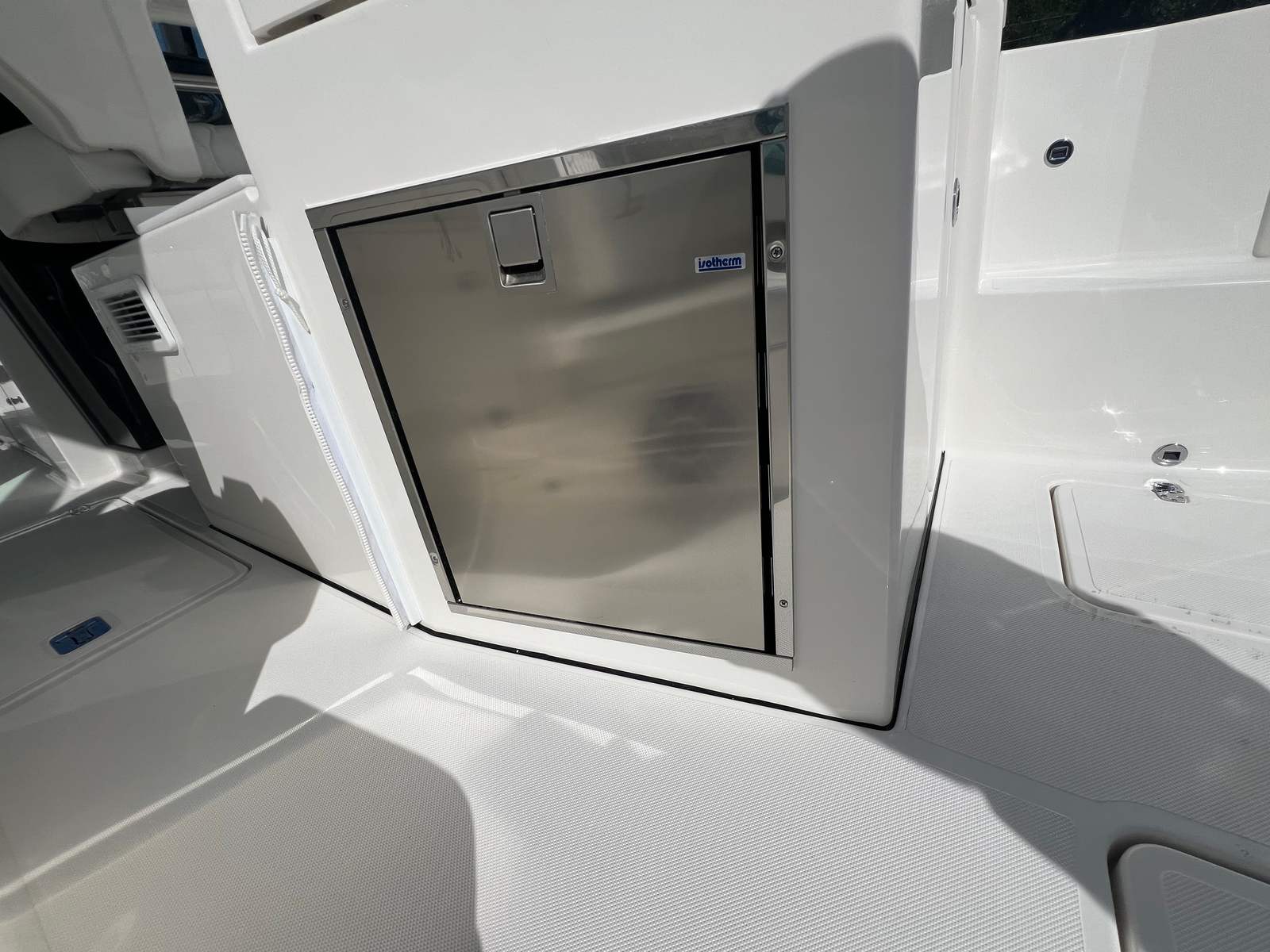 The Pursuit DC 326 comes loaded with premium features that set it apart from other boats in its class. The helm features a sophisticated Carbon color scheme, adding a touch of modern elegance to your command center. For those who love to entertain, the 110V/60Hz cockpit grill with a drip pan allows you to prepare delicious meals right on board, while the 120V/60Hz generator (5.0kW Fischer Panda Genset) with a 16-gallon diesel tank ensures you have reliable power for all your onboard systems.A 12V, 1.7 cu. ft. cooler with a chill plate under the aft-facing seat keeps your beverages and snacks perfectly chilled, enhancing your relaxation and enjoyment. The air conditioning package with reverse cycle offers 6,000 BTU for the cabin and head, and 12,000 BTU for the cockpit (requires a drop curtain), ensuring comfort in any weather. The bridge deck teak table with storage provides a stylish and functional space for dining or socializing, while the custom retractable Makefast sunshade with one-touch operation offers instant protection from the sun.Music lovers will appreciate the premium stereo upgrade, delivering crystal-clear sound throughout the boat. For added safety and convenience, the ACR RCL-100 LED spotlight with remote control at the helm ensures excellent visibility during nighttime navigation.
