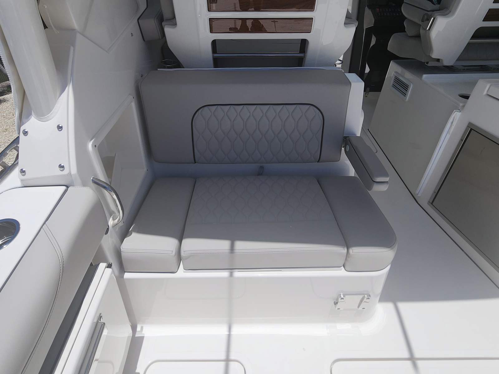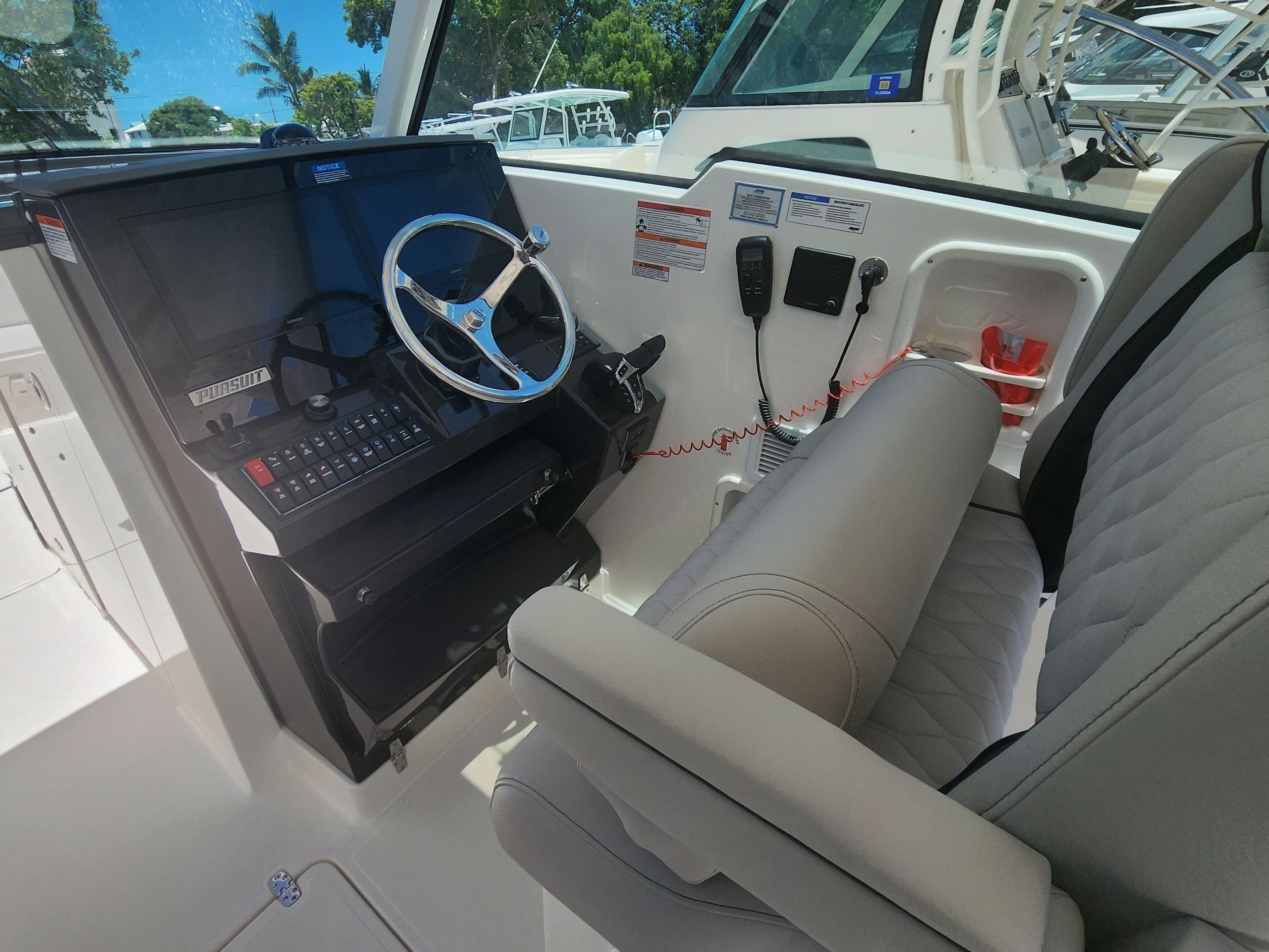 The 2026 Pursuit DC 326 is a brand-new dual console boat that measures an impressive 34.5 feet in length. This spacious design provides ample room for entertaining, relaxing, and enjoying all your favorite water activities. The DC 326’s modern profile is accentuated by its Fresh White hull color, complemented by a Platinum boot stripe with a Platinum accent, making it a true head-turner at any marina or dock. Whether you’re cruising along the coast or anchored at your favorite spot, this Pursuit boat for sale offers a perfect balance of style and substance.