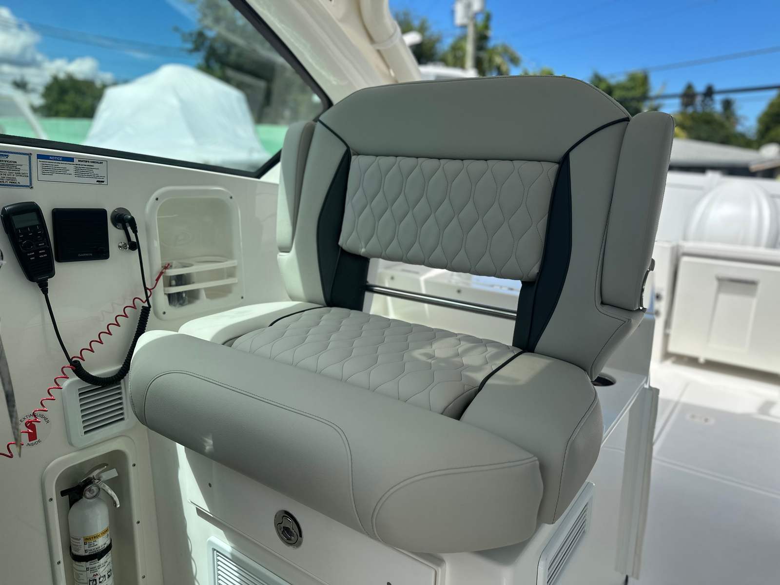 The Pursuit DC 326 is packed with premium features that set it apart from other Dual Console boats for sale. The Platinum Boot Stripe with Platinum Accent adds a touch of elegance to the hull, while the Cadet Gray Bow Tonneau Cover and Cadet Gray Hardtop Aft Curtain provide stylish protection from the elements. The Fwd Med Style Sunshade offers shade and comfort for guests relaxing at the bow, and the Bolt-On Hardtop Rod Holder is perfect for anglers looking to keep their gear organized and accessible.Inside, the Bridgedeck Teak Table with Storage creates a welcoming space for dining and socializing, while the Garmin Widescreen 16" Display Package ensures you have all the navigation and system information you need at your fingertips. The Helm Control Hardtop Mounted LED Spotlight enhances visibility during nighttime excursions, adding an extra layer of safety and convenience. The White Stamoid/Makrolon Side Curtain offers additional protection from wind and spray, ensuring a comfortable ride in varying conditions.