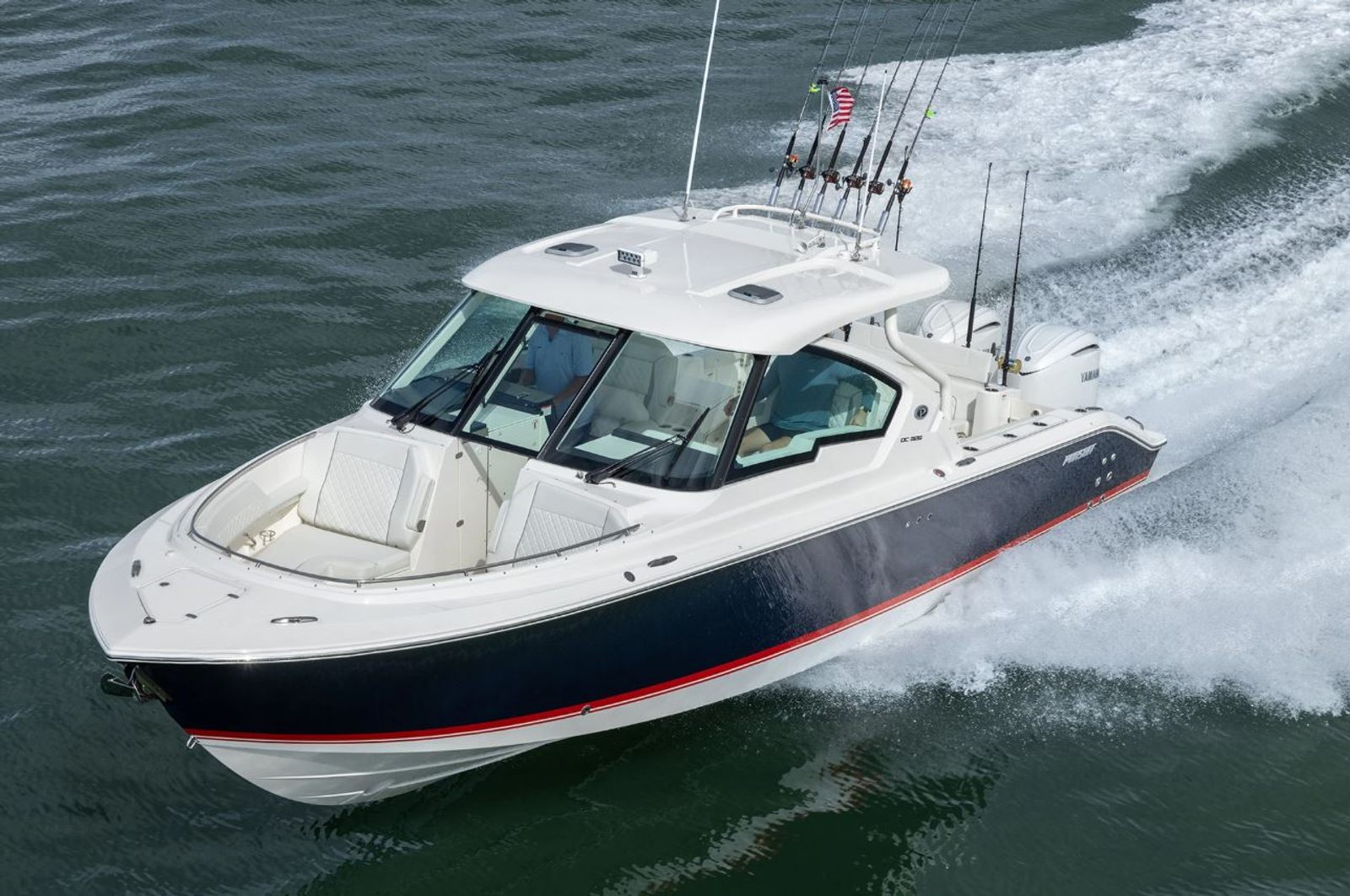 - Twin Yamaha Digital F350 V6 Offshore (Pearlescent White) w/Integrated Digital Electric Steering (DES) and Helm Master EX Digital Electronic Control (DEC) (does not include joystick control), Multifunction Display Interface and Manual Engine Flushing System