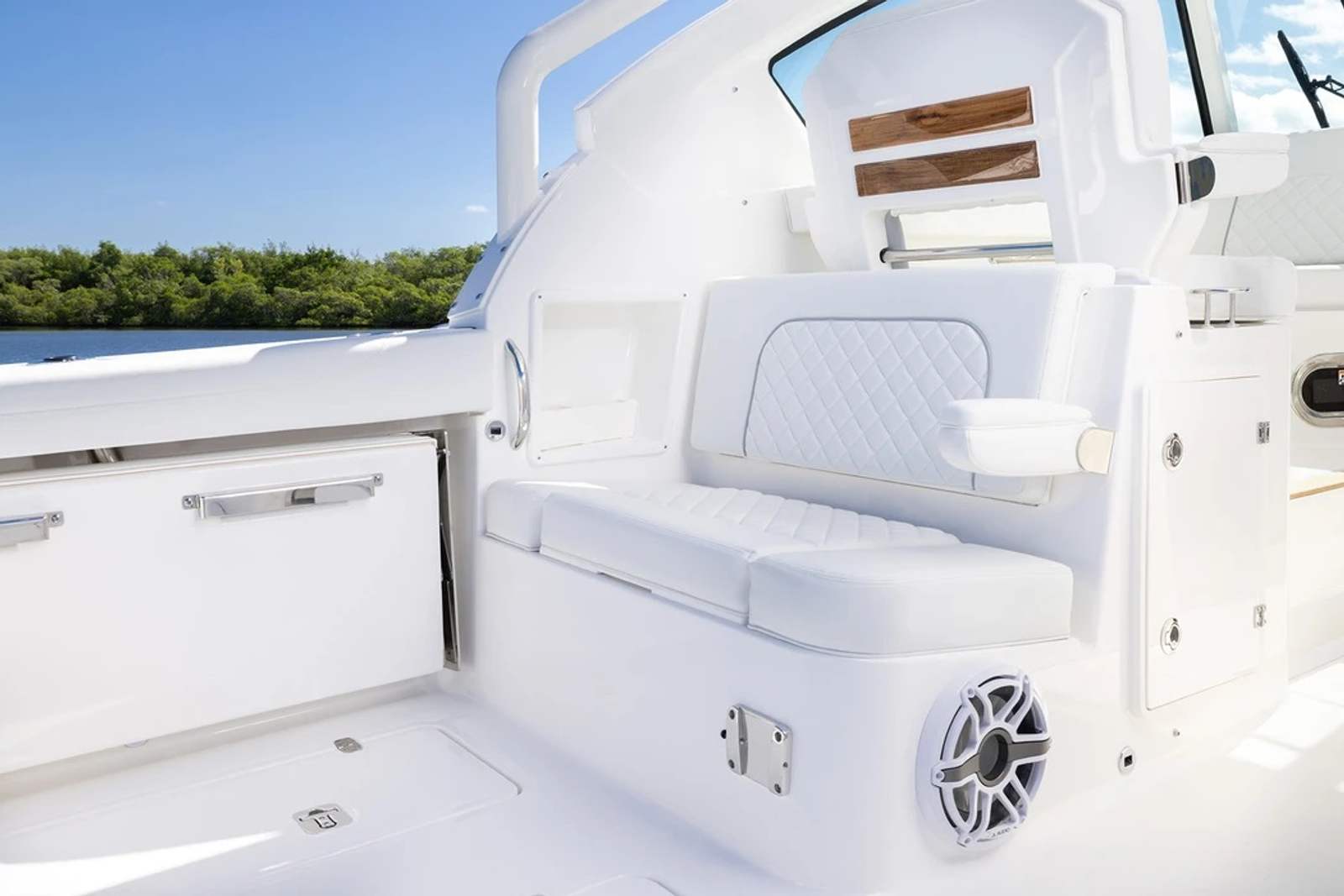 The Pursuit DC 326 is as practical as it is luxurious. The dual console configuration provides excellent storage options for gear, water toys, and personal belongings, keeping the deck clutter-free and organized. The advanced Helm Master system simplifies docking, making it easy for boaters of all experience levels to handle the vessel with precision. The efficient diesel genset and air conditioning package ensure comfort and convenience during extended trips, while the cockpit grill adds a touch of culinary delight to your adventures. The hardtop-mounted LED sportlight enhances safety during nighttime operations, giving you peace of mind wherever your journey takes you.