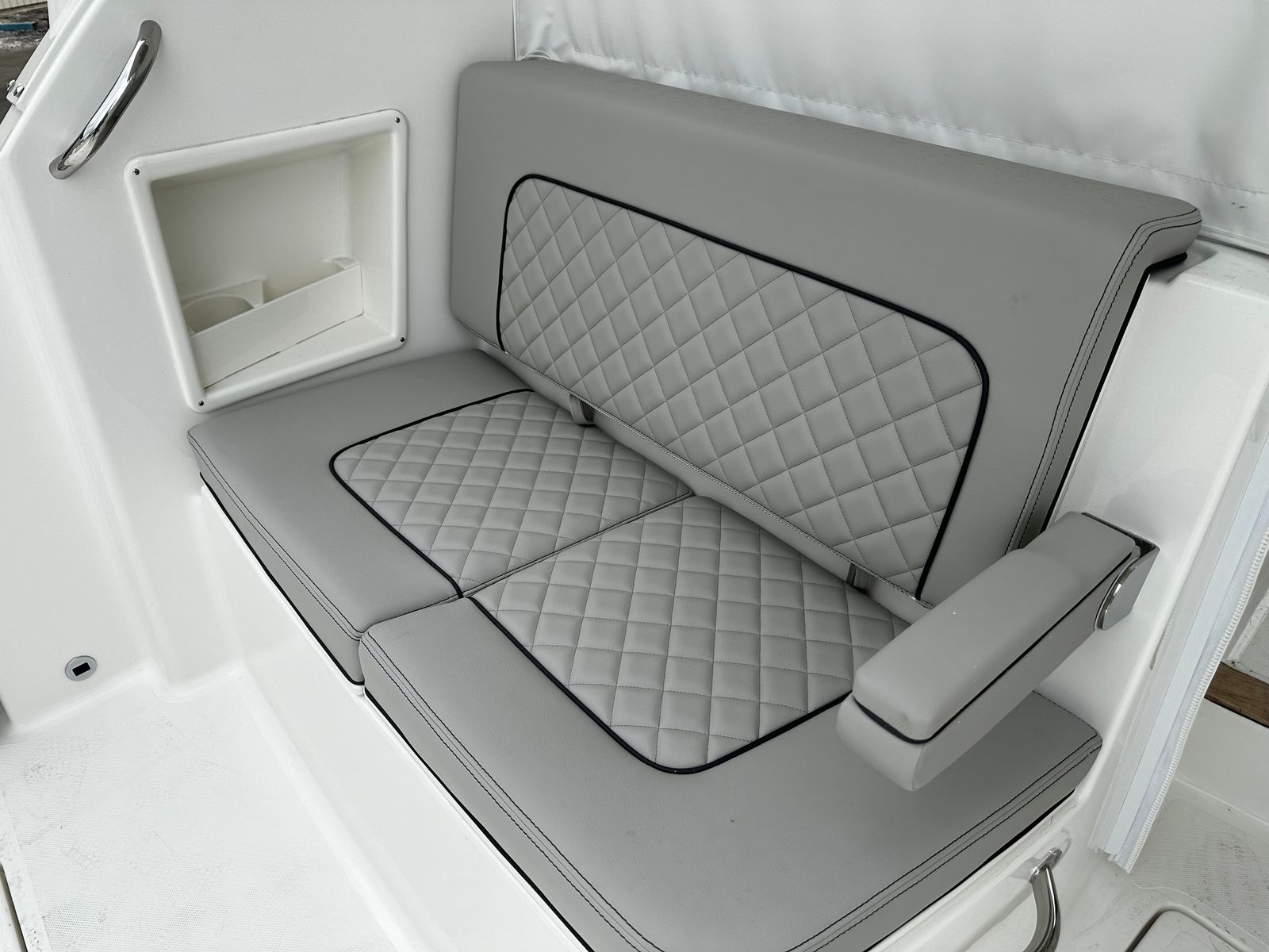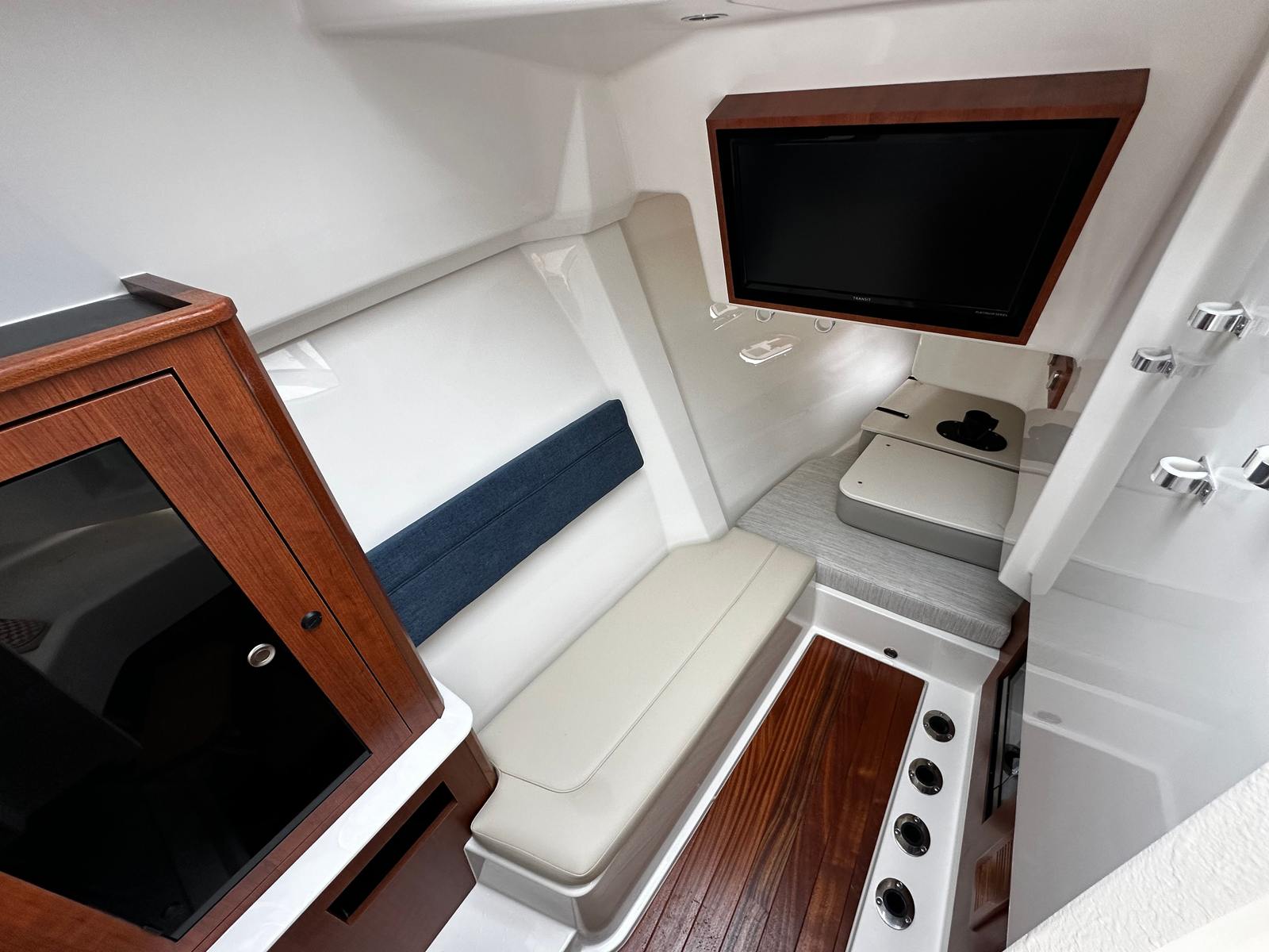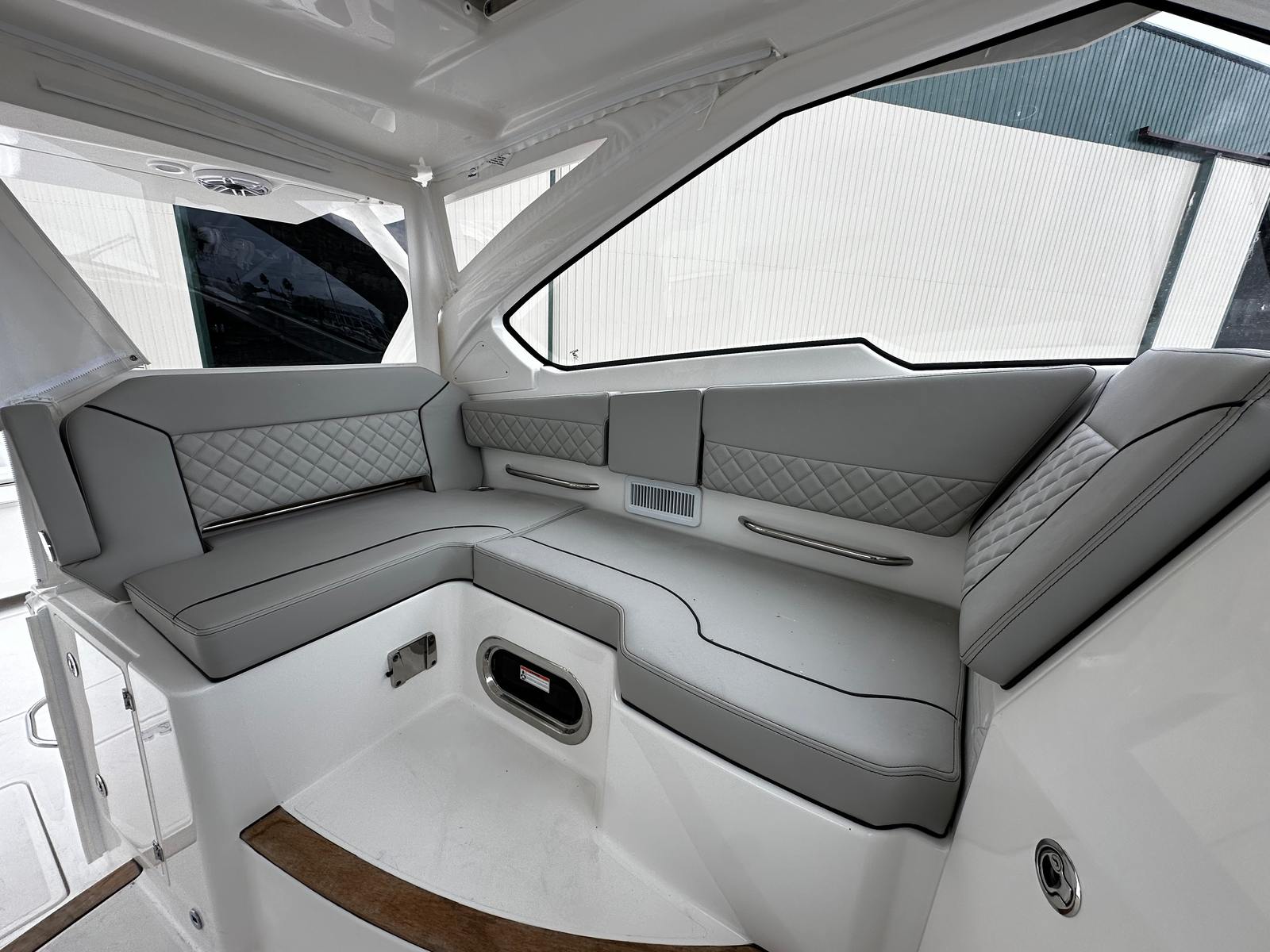 The Pursuit DC 365 is loaded with premium features that set it apart from other Dual Console boats for sale. The black bootstripe adds a touch of elegance to the exterior, while the four underwater lights create a captivating ambiance for evening cruises or dockside gatherings. Navigation and safety are enhanced by the Garmin Radar Open Array GMR Fantom 54, providing cutting-edge radar technology for superior situational awareness. The interior, finished in the serene Tranquil Sea color scheme, offers a relaxing and inviting atmosphere for you and your guests.For added comfort and protection, the DC 365 includes a white Stamoid aft curtain, shielding the cockpit from the elements while maintaining a clean, modern look. The Bow Mediterranean Style Sunshade provides ample shade for those sunny days, allowing you to relax in comfort at the bow. The cockpit air conditioning system ensures a cool and pleasant environment, even on the hottest days, making every outing enjoyable regardless of the weather.At the helm, the carbon finish adds a touch of high-tech sophistication, while the FLIR M332 Night Vision with image stabilization enhances safety and confidence during nighttime navigation. These features combine to create a Dual Console boat that is as functional as it is luxurious, making the Pursuit DC 365 a standout choice for discerning boaters.