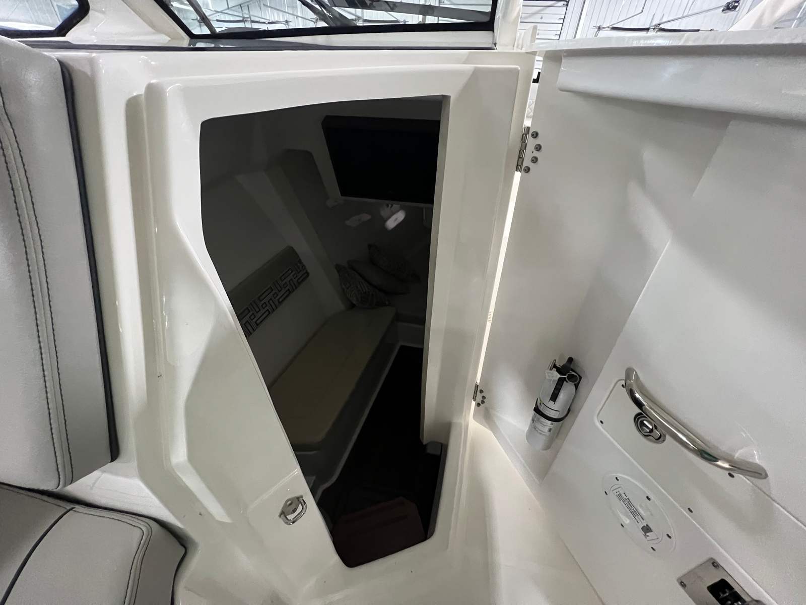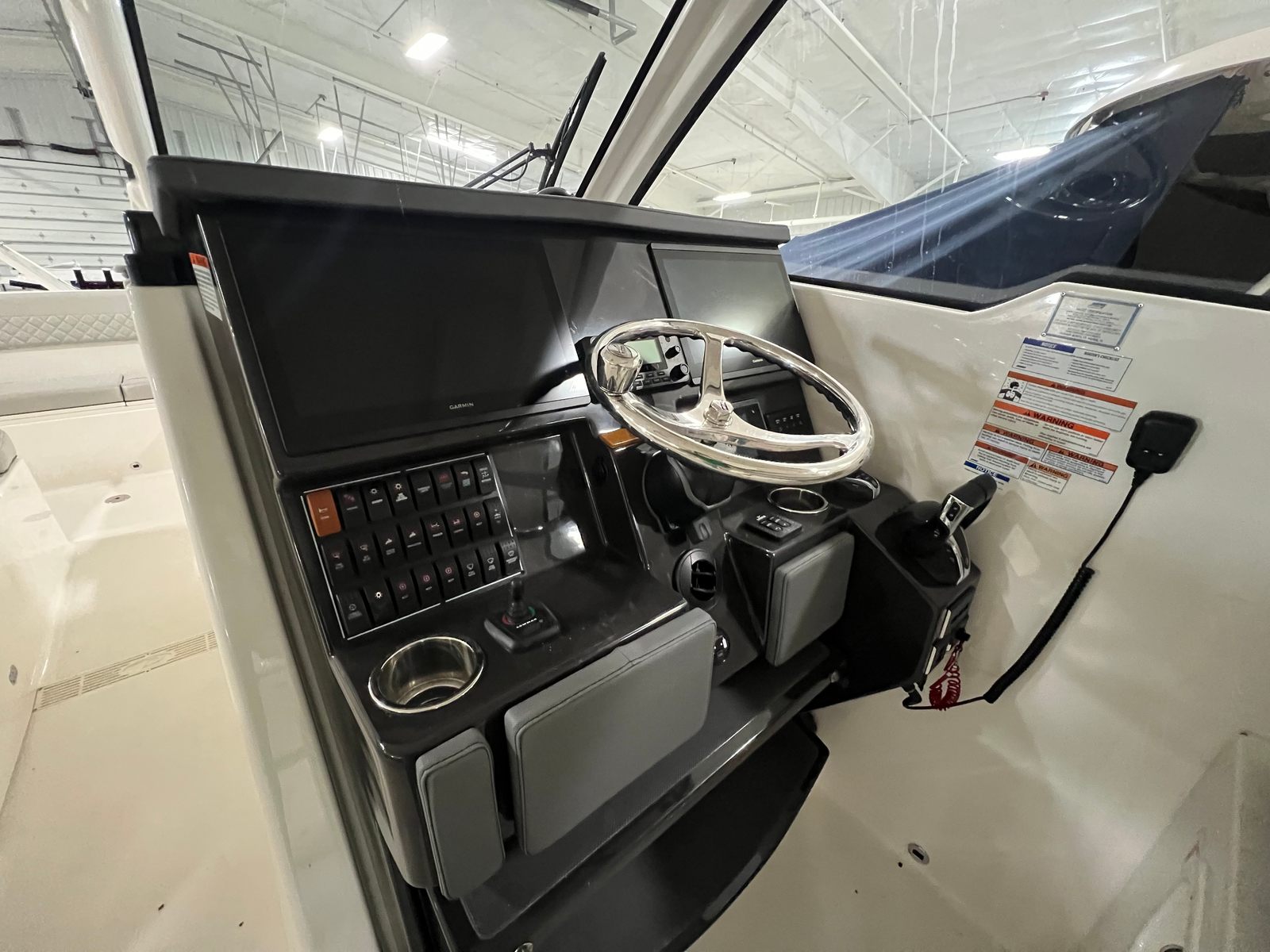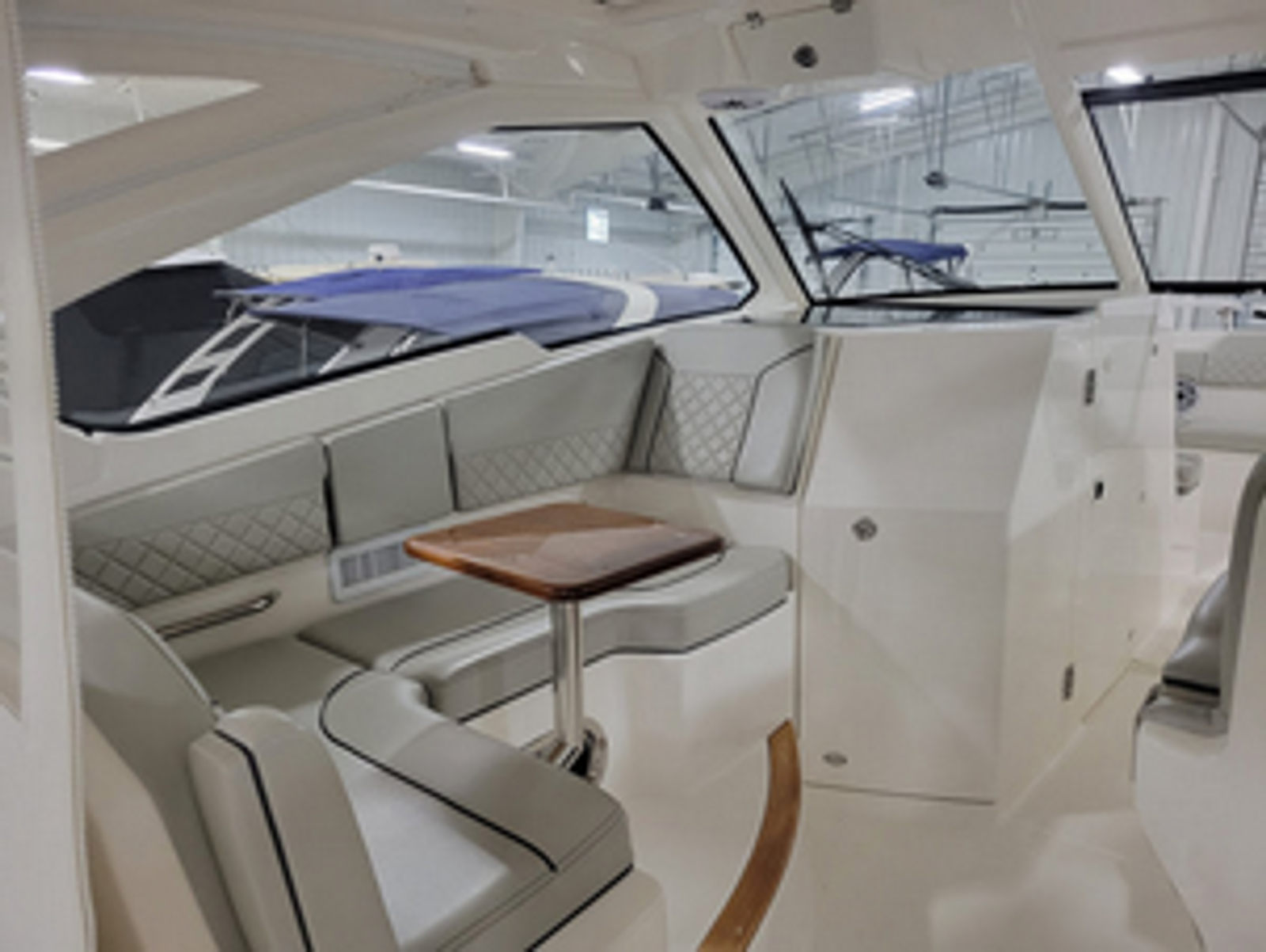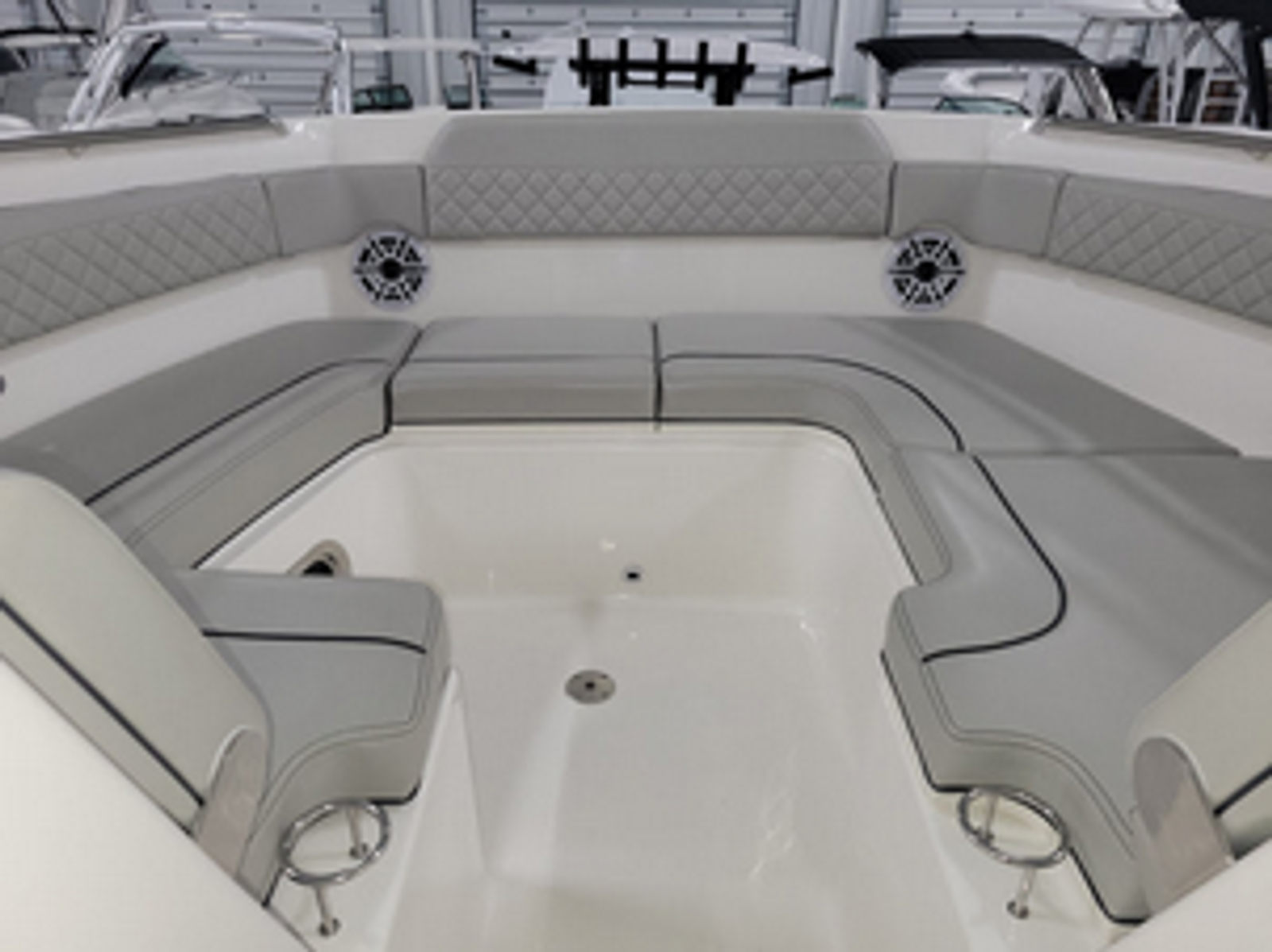 The Pursuit DC 365 is loaded with features that enhance comfort, convenience, and enjoyment on every outing. With six onboard batteries and a dedicated battery charger, you can count on reliable power for all your electronics and accessories. The aft bench seat provides a comfortable spot for guests to relax and take in the views, while the bow seating area is perfect for sunbathing or socializing at anchor.For those who love to entertain, the cockpit grill and wet bar transform the deck into a floating kitchen, allowing you to prepare and serve meals with ease. The double wide helm seat ensures that both captain and companion can enjoy the ride in comfort, while the hard top offers protection from the elements, extending your boating season and keeping everyone shaded on sunny days. Cockpit coaming bolsters add an extra layer of comfort and safety, especially during active pursuits like fishing or water sports.