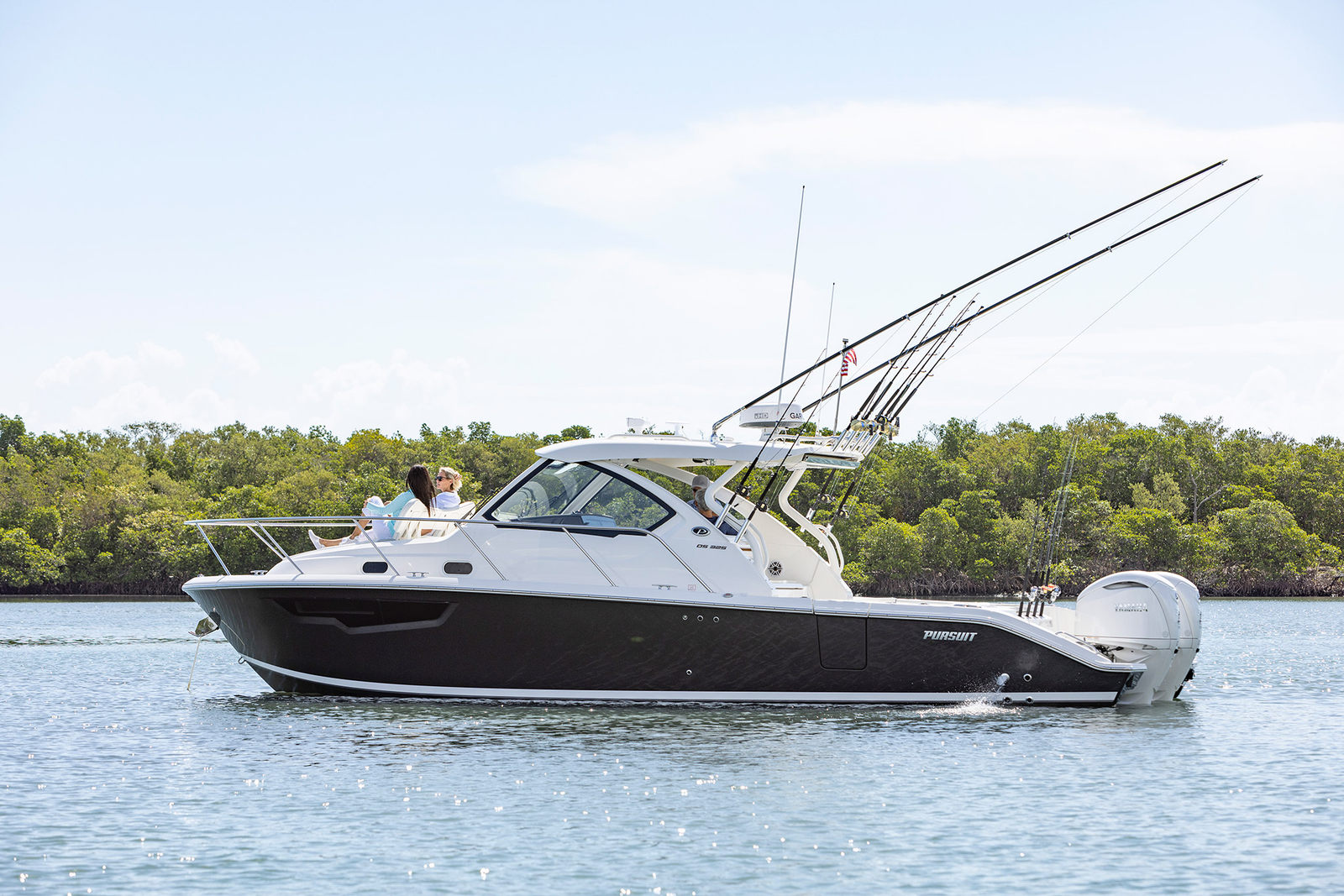 The Pursuit OS 325 is designed with practicality in mind, making ownership easy and enjoyable. The manual engine flushing system simplifies maintenance, helping you keep your engines in top condition with minimal effort. The Multifunction Display Interface provides real-time information and control, enhancing safety and convenience. The boat’s length and hull design make it easy to dock and maneuver, whether you’re in a busy marina or a secluded cove. Ample storage throughout the vessel ensures you have plenty of space for gear, supplies, and personal items, so you’re always prepared for your next adventure. Fuel efficiency is optimized through advanced engine technology, allowing you to spend more time on the water and less at the pump.
